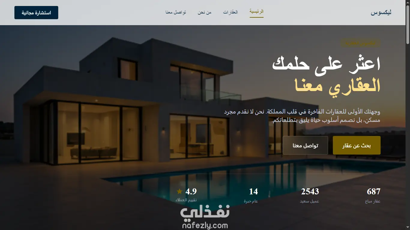 تصميم موقع عصري وفاخر (Modern Luxury Aesthetic) - تصميم جذاب يعكس فخامة العقارات المعروضة - ألوان احترافية (أزرق فاخر + ذهبي) - واجهة مستخدم سلسة وسهلة الاستخدام - Animations و Transitions احترافية وملساء متوافق بنسبة 100% مع جميع الأجهزة - Responsive Design (موبايل، تابليت، ديسكتوب) - سرعة تحميل عالية - تجربة مستخدم ممتازة الأقسام المطلوبة: 1. Header / Navigation Bar - شعار الشركة - قائمة تنقل (عقارات، من نحن، تقييمات، تواصل) - زر استشارة مجانية 2.Hero Section - عنوان جذاب - جملة فرعية ملهمة - أزرار CTA (بحث، تواصل) - إحصائيات الشركة (عقارات مباعة، تقييمات، سنوات الخبرة) 3. العقارات (Properties Showcase) - عرض 10 عقارات فاخرة كـ cards - صور العقارات - معلومات كاملة (غرف، حمامات، مساحة، طابق، السعر) - Hover effects جميلة - زر "عرض التفاصيل" - Badges (جديد، جاهز، قيد الإنشاء) 4. About Section - معلومات عن الشركة - سجل النجاحات - صور توضيحية 5. Testimonials / Reviews - تقييمات العملاء (5 نجوم) - أسماء وآراء حقيقية - Verified badges - Carousel أو Grid layout 6. Contact Section - نموذج تواصل احترافي - معلومات التواصل - ساعات العمل - وسائل التواصل الاجتماعي 7. Footer - معلومات الشركة - روابط سريعة - بيانات التواصل - حقوق النشر