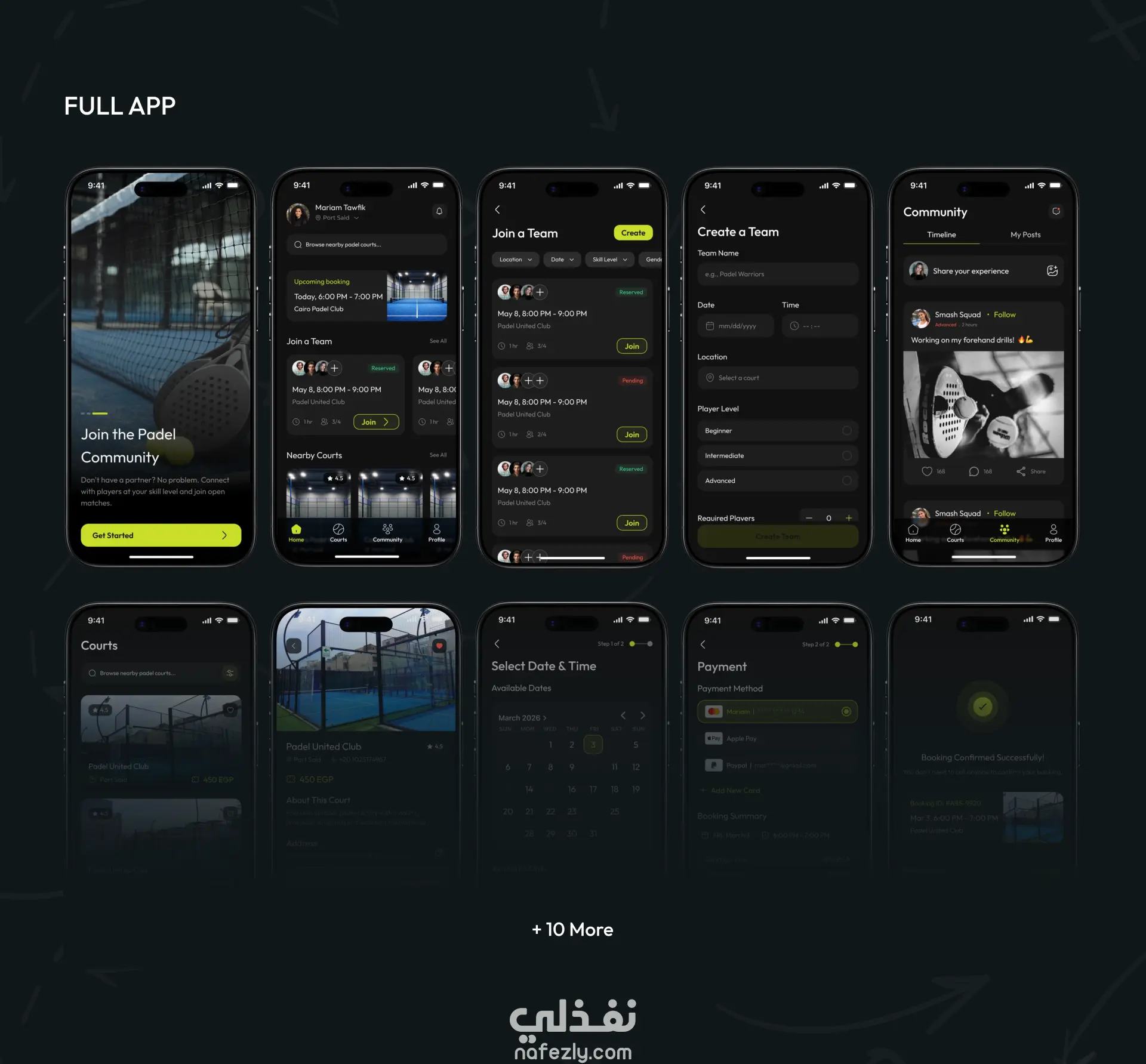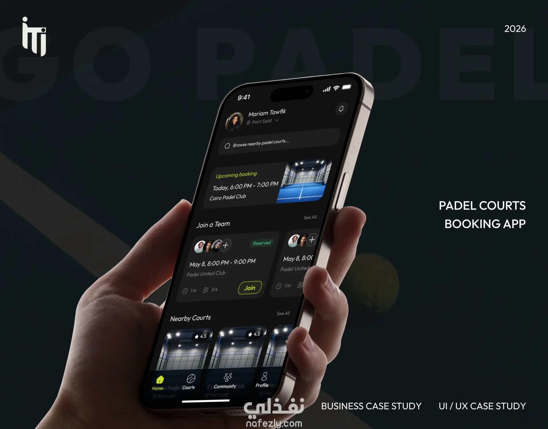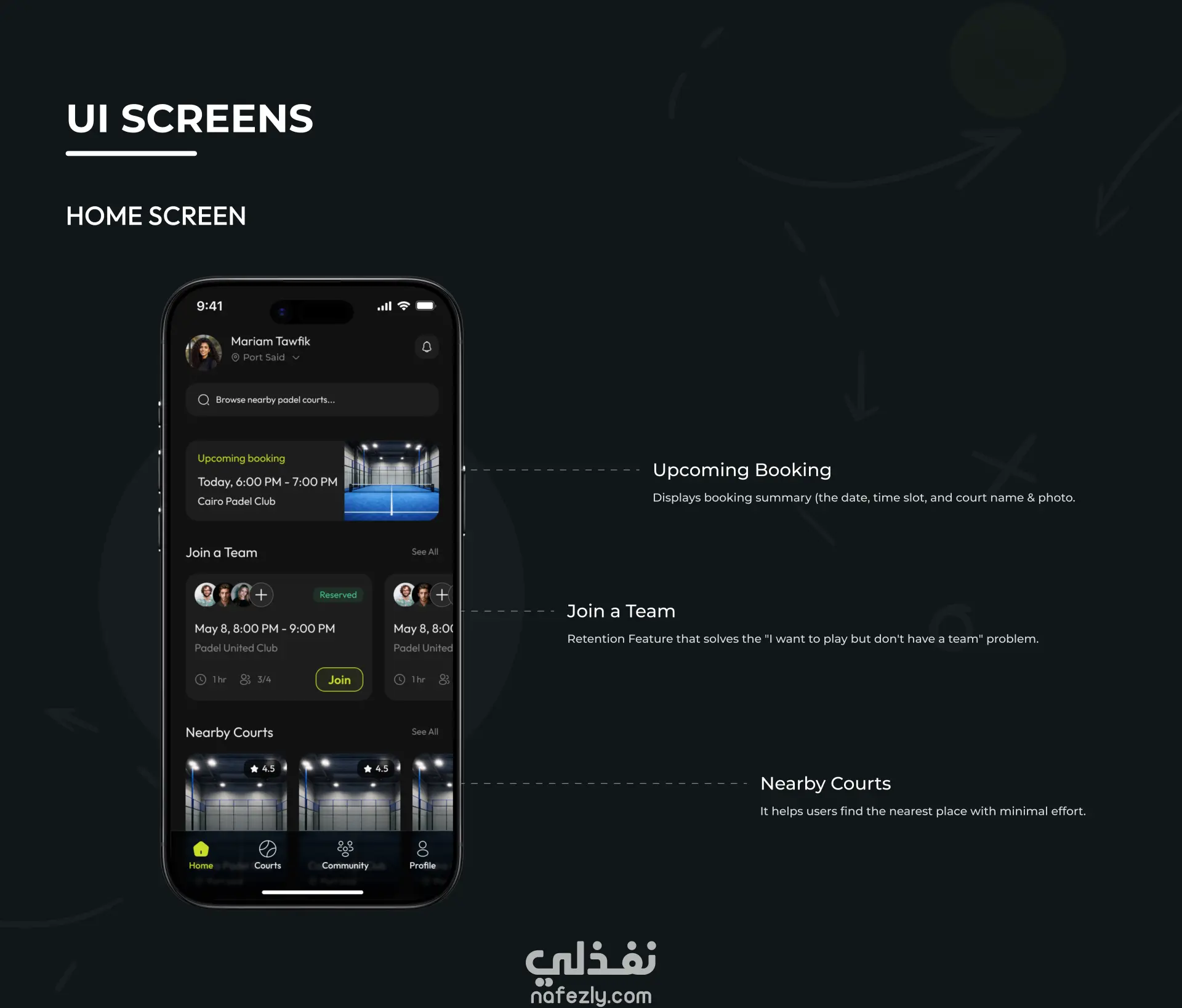 تصميم تطبيق موبايل يسمي GO PADEL لحجز ملاعب رياضة البادل باستخدام فيجما