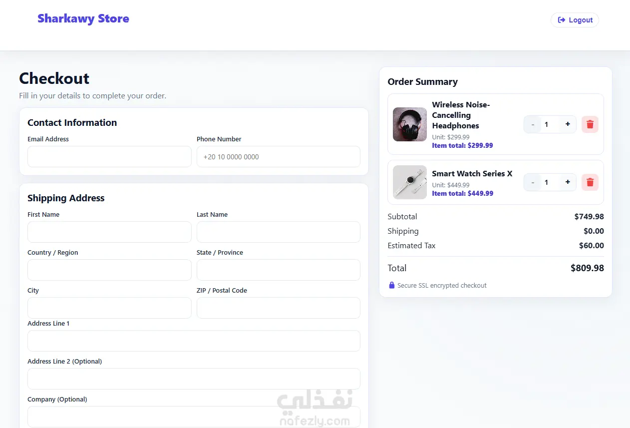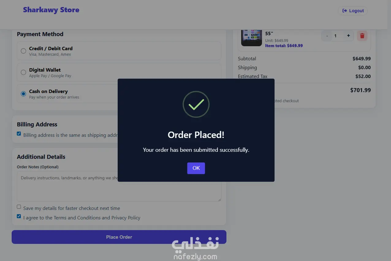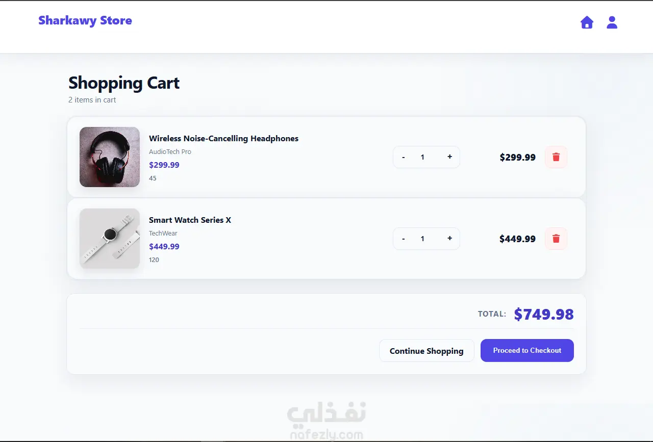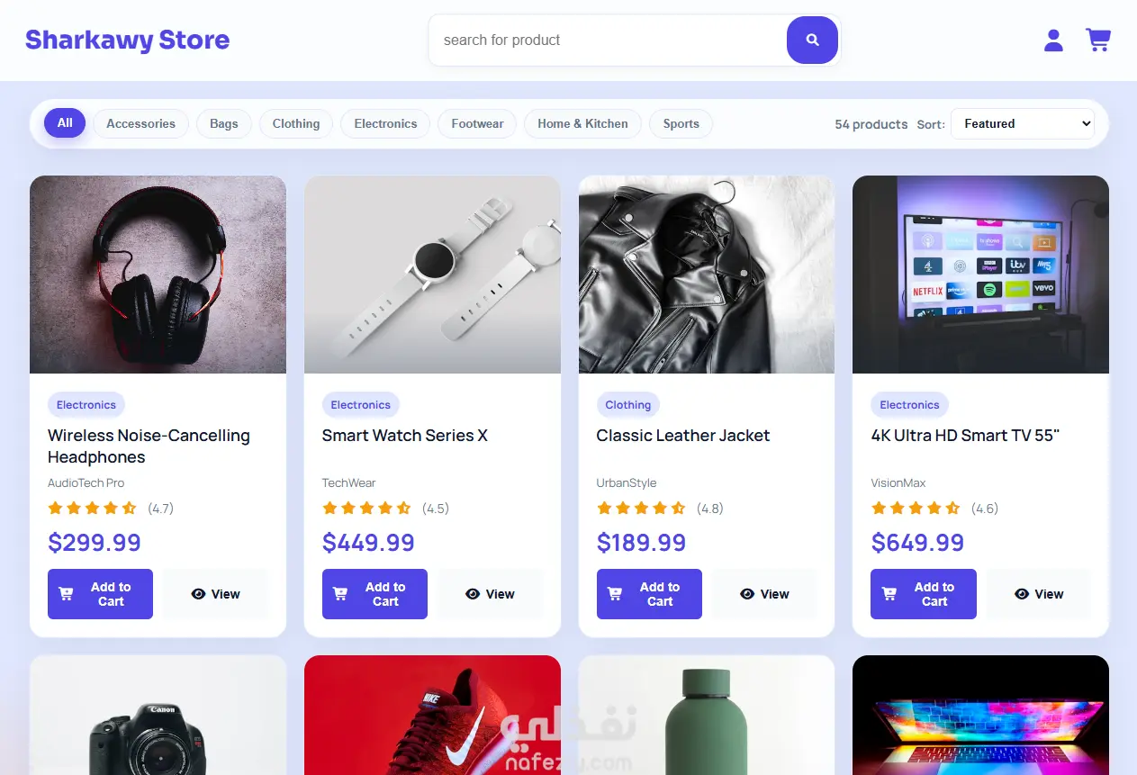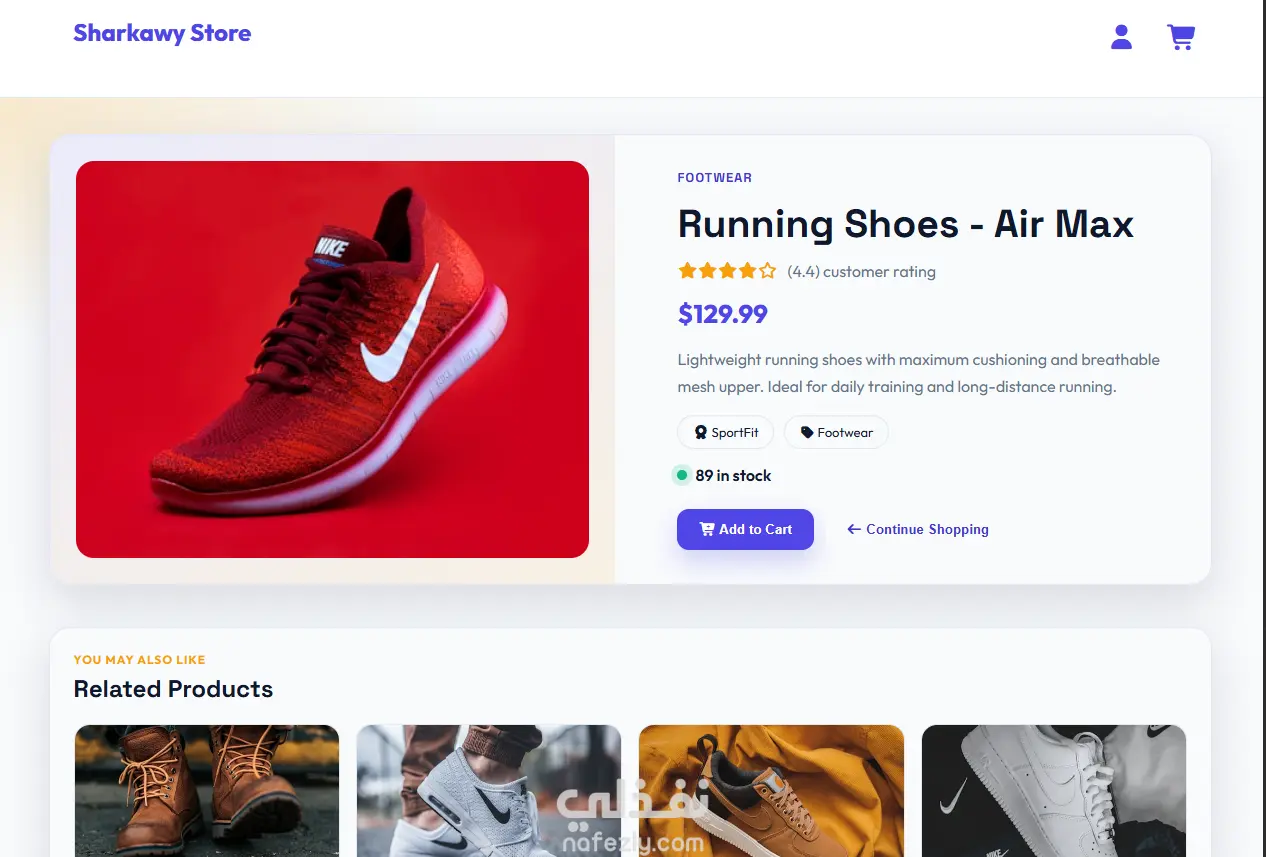 Sharkawy Store is a front-end e‑commerce web application that showcases a product catalog and allows users to browse items, view detailed product information, manage a shopping cart, and complete a checkout flow. The entire experience is built with static HTML, CSS, and JavaScript, using a local JSON file as the data source instead of a remote API.