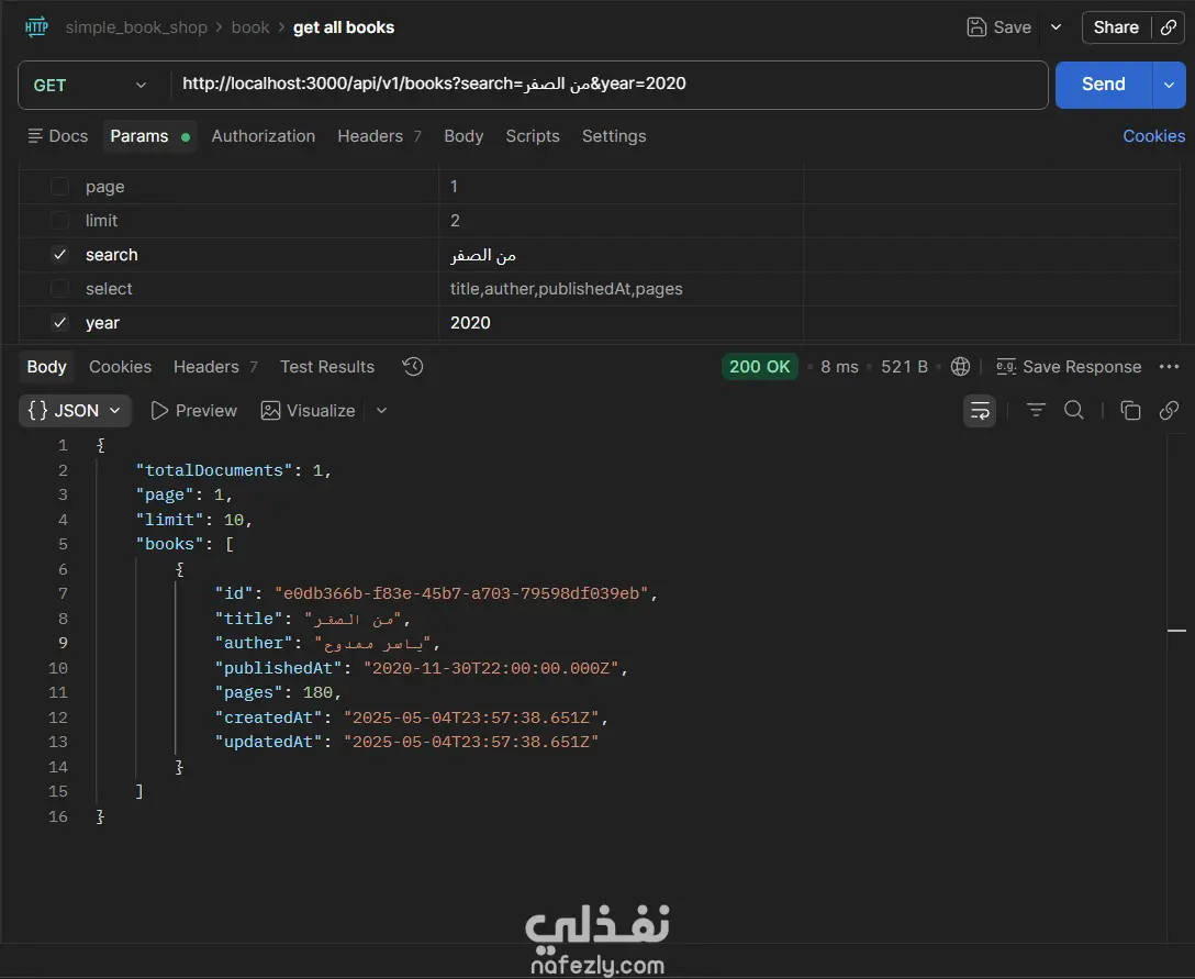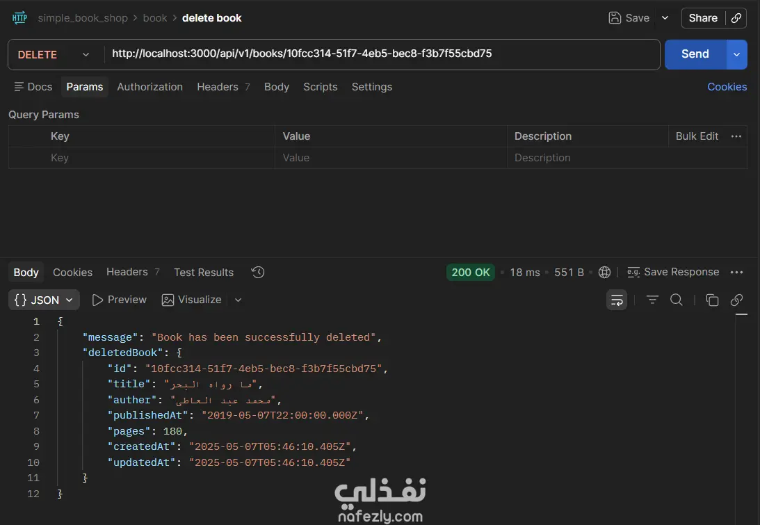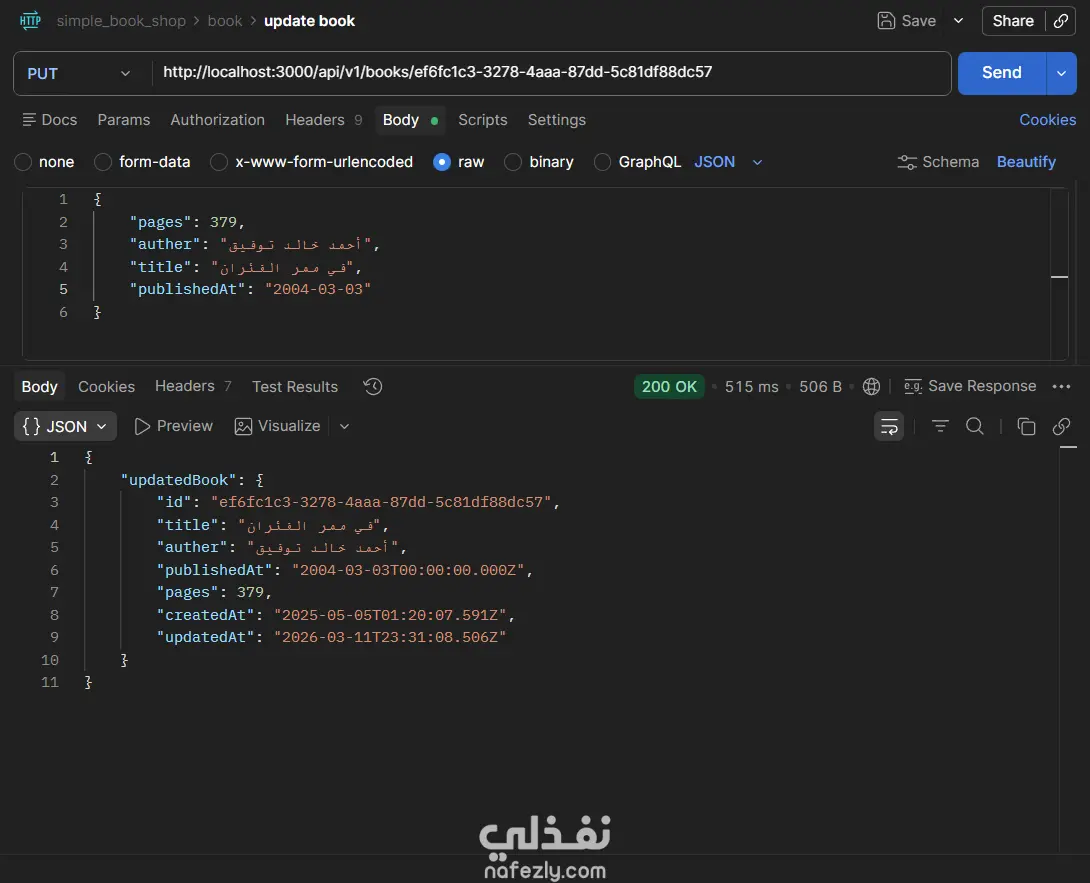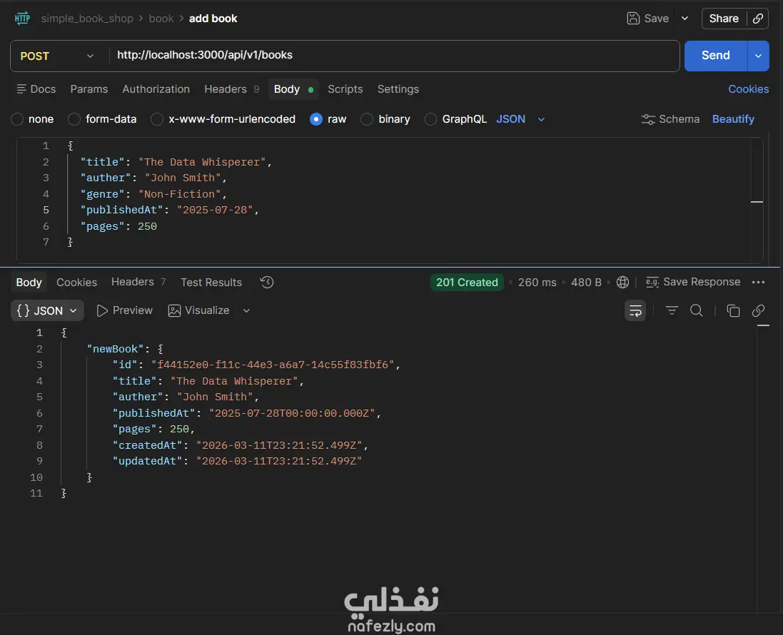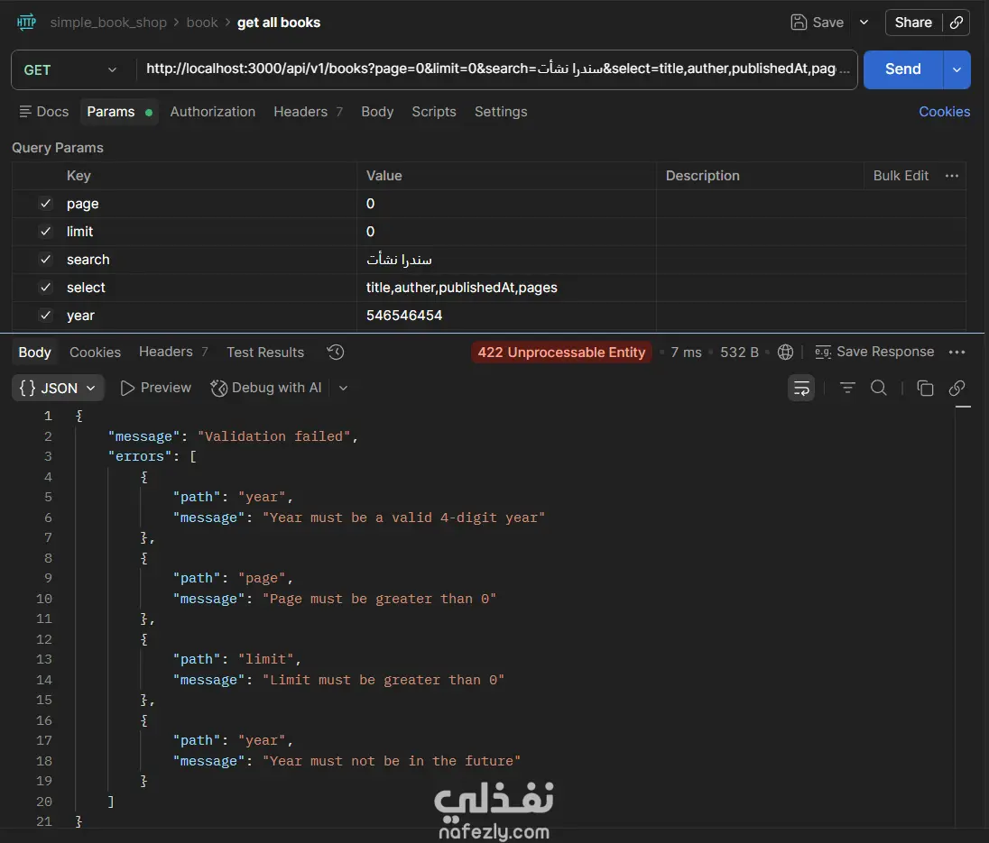 مشروع Book Store API هو تطبيق(Back-End) كامل لإدارة متجر كتب إلكتروني، مبني بـ Node.js و TypeScript باستخدام إطار عمل Express، مع قاعدة بيانات PostgreSQL يتم التعامل معها عبر Prisma ORM. يتيح التطبيق إجراء جميع عمليات CRUD على الكتب (إضافة، عرض، تعديل، حذف)، مع دعم كامل للبحث النصي، والتصفية بالسنة، وتقسيم النتائج إلى صفحات (Pagination)، والتحكم في الحقول المُرجَعة في الاستجابة. يعتمد المشروع على Zod لإجراء التحقق من صحة بيانات الطلبات (Request Validation) سواء في body أو query params أو route params، مع مُعالج مركزي للأخطاء (Global Error Handler) يُصنِّف ويُرجع رسائل خطأ واضحة ومنظمة. التقنيات المستخدمة: Node.js · TypeScript · Express · Prisma ORM · PostgreSQL · Zod