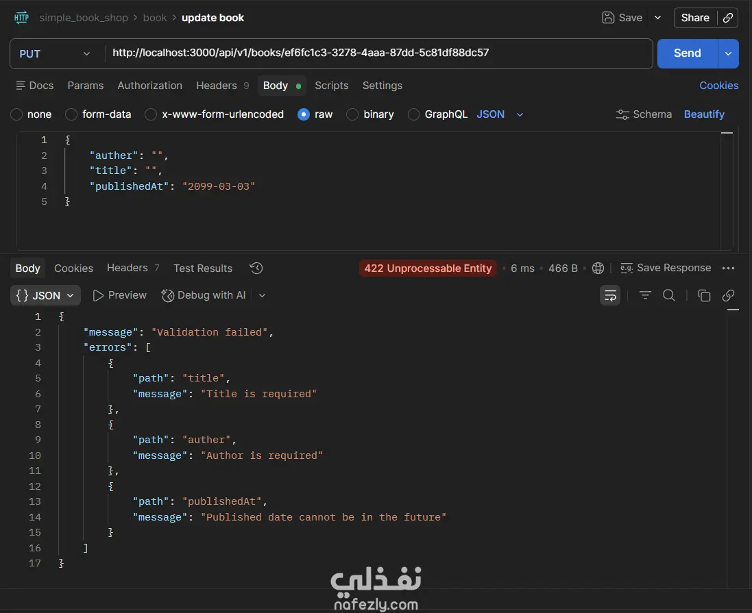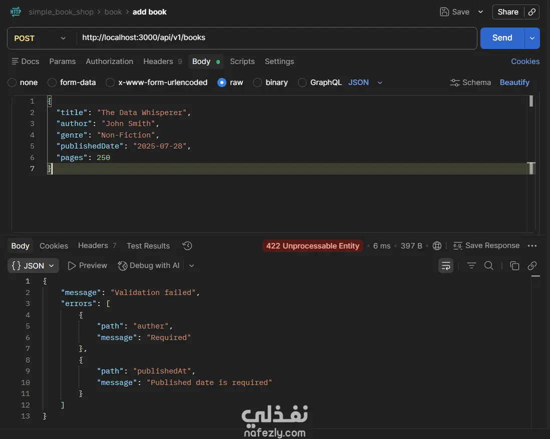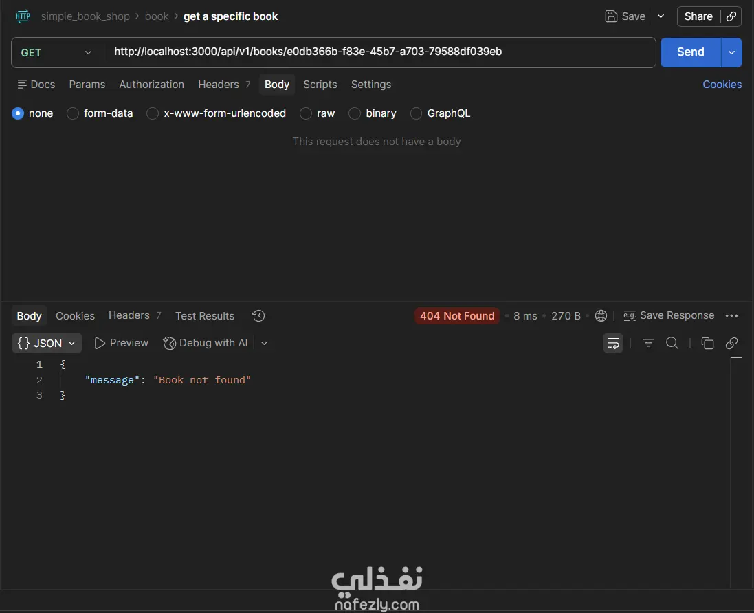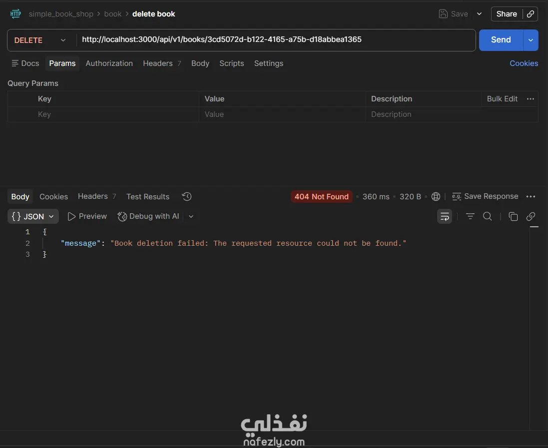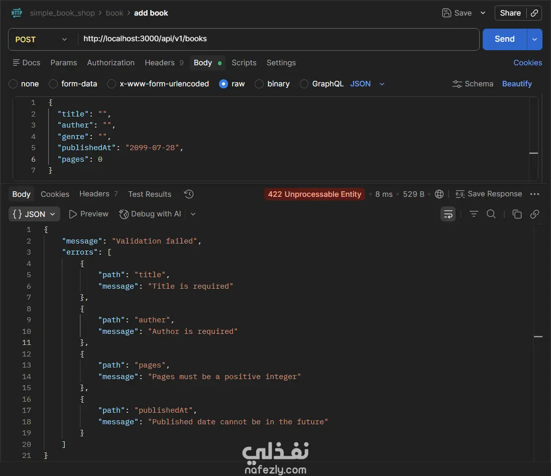 مشروع Book Store API هو تطبيق(Back-End) كامل لإدارة متجر كتب إلكتروني، مبني بـ Node.js و TypeScript باستخدام إطار عمل Express، مع قاعدة بيانات PostgreSQL يتم التعامل معها عبر Prisma ORM. يتيح التطبيق إجراء جميع عمليات CRUD على الكتب (إضافة، عرض، تعديل، حذف)، مع دعم كامل للبحث النصي، والتصفية بالسنة، وتقسيم النتائج إلى صفحات (Pagination)، والتحكم في الحقول المُرجَعة في الاستجابة. يعتمد المشروع على Zod لإجراء التحقق من صحة بيانات الطلبات (Request Validation) سواء في body أو query params أو route params، مع مُعالج مركزي للأخطاء (Global Error Handler) يُصنِّف ويُرجع رسائل خطأ واضحة ومنظمة. التقنيات المستخدمة: Node.js · TypeScript · Express · Prisma ORM · PostgreSQL · Zod