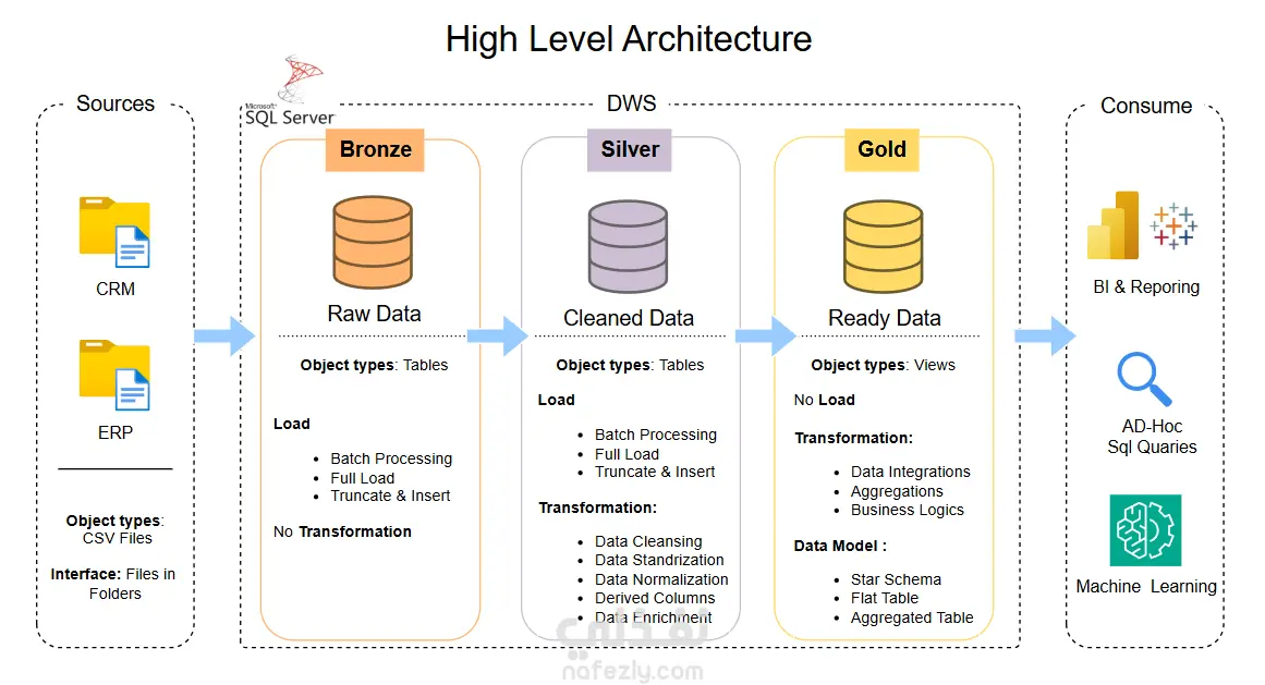 هذا المشروع يوضح عملية تصميم وتنفيذ مستودع بيانات (Data Warehouse) باستخدام بنية الطبقات (Bronze, Silver, Gold) لتنظيم البيانات وتحويلها إلى معلومات جاهزة للتحليل.