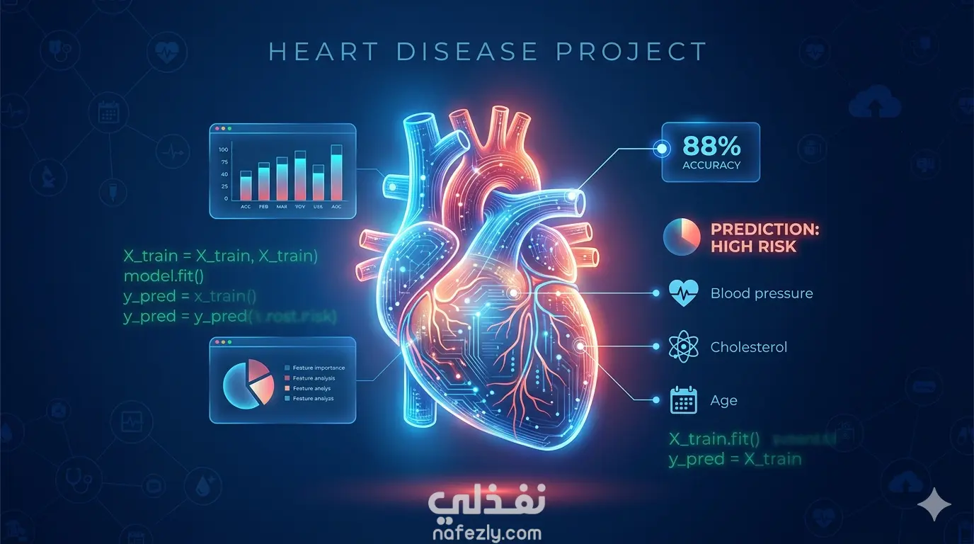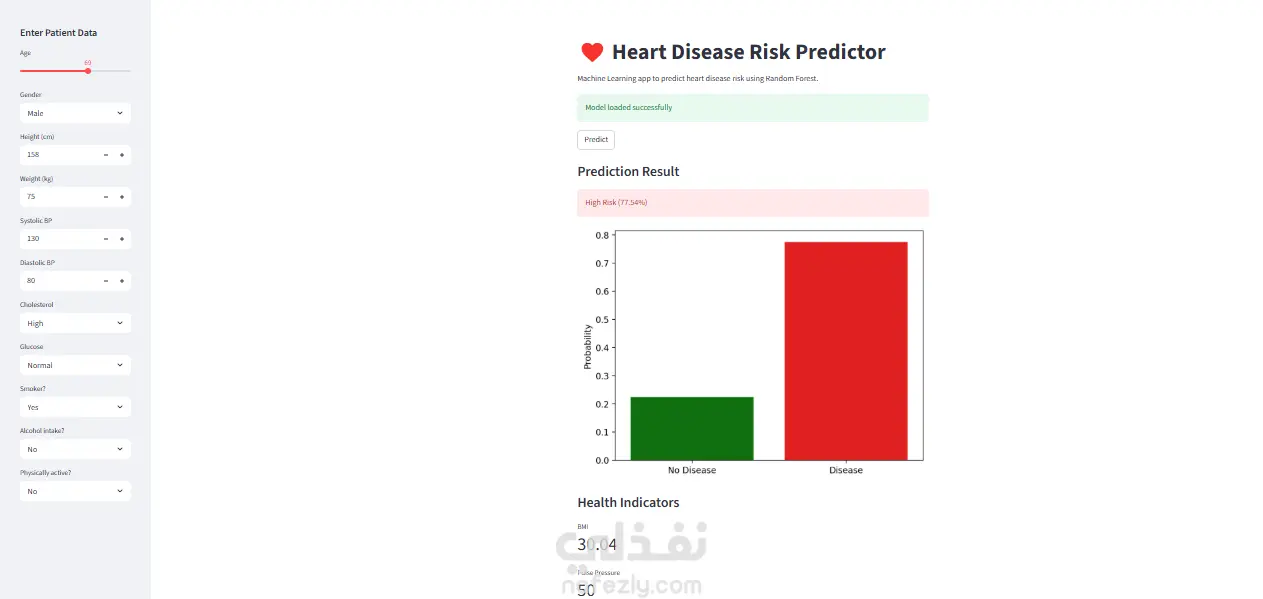 تطبيق ويب متكامل يعتمد على الذكاء الاصطناعي (تعلم الآلة) لتحليل المؤشرات الحيوية وتقدير احتمالية الإصابة بأمراض القلب. يقوم النظام بمعالجة بيانات طبية معقدة وتقديم تقييم فوري لمستوى الخطورة بناءً على خوارزميات تصنيف متقدمة.