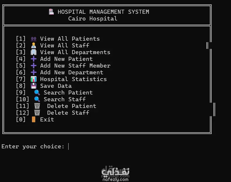 قمت بتطوير نظام إدارة مستشفى متكامل باستخدام لغة Python بالاعتماد على مبادئ البرمجة كائنية التوجه (OOP) لتنظيم العمليات الإدارية والطبية داخل المستشفى. يعتمد النظام على تصميم كائنات تمثل الكيانات الأساسية مثل Patient و Staff و Department، مع تنظيم العلاقات بينها وتطبيق مفاهيم Encapsulation و Inheritance لضمان كود منظم وقابل للتوسعة. يوفر النظام الوظائف التالية: - عرض جميع المرضى والموظفين والأقسام - إضافة مرضى وموظفين وأقسام جديدة - البحث عن مريض أو موظف - حذف بيانات المرضى والموظفين - عرض إحصائيات المستشفى - حفظ البيانات واسترجاعها تم بناء واجهة تفاعلية عبر سطر الأوامر (CLI Interface) مع التحقق من صحة الإدخال ومعالجة الأخطاء لضمان استقرار النظام. الأدوات المستخدمة: Python – OOP – File Handling – Data Validation – CLI Application Design