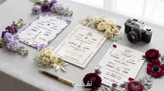تنوع الأنماط: أقدم تصاميم متنوعة تشمل (النمط الزهري الرومانس، النمط الملكي المذهب، والنمط المودرن البسيط) لتناسب مختلف ثيمات الزفاف.