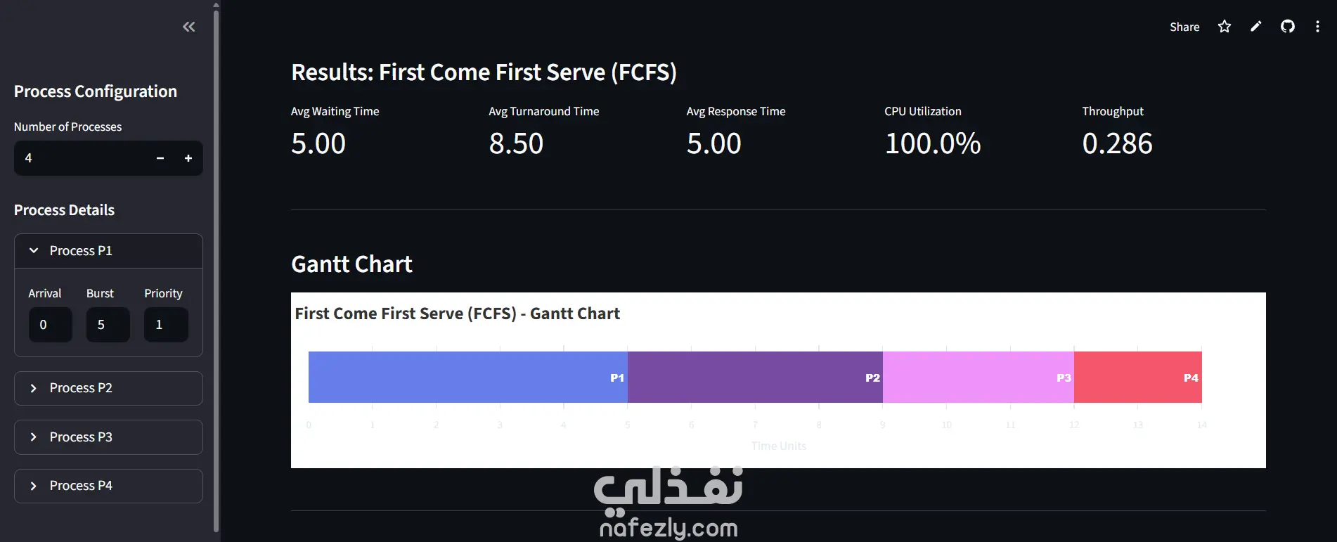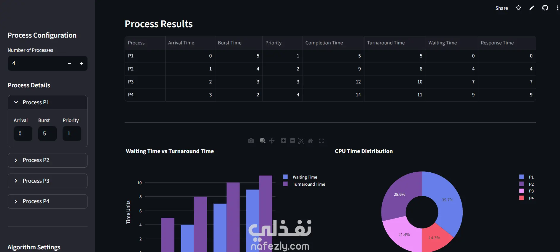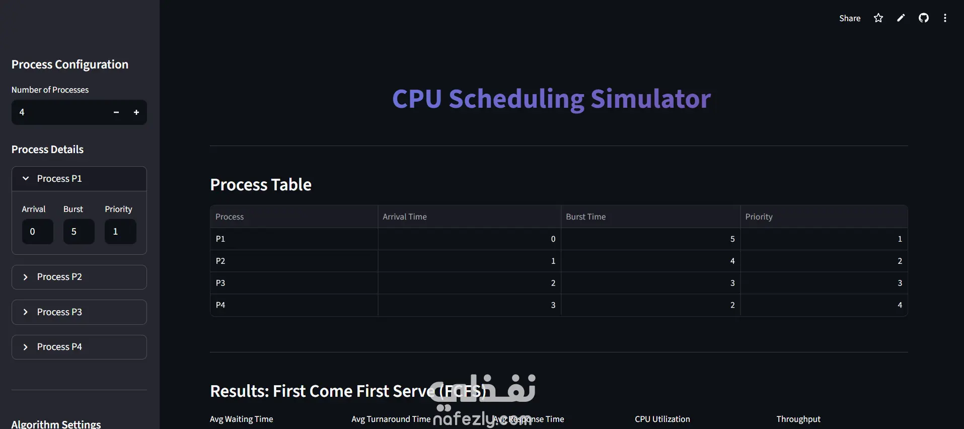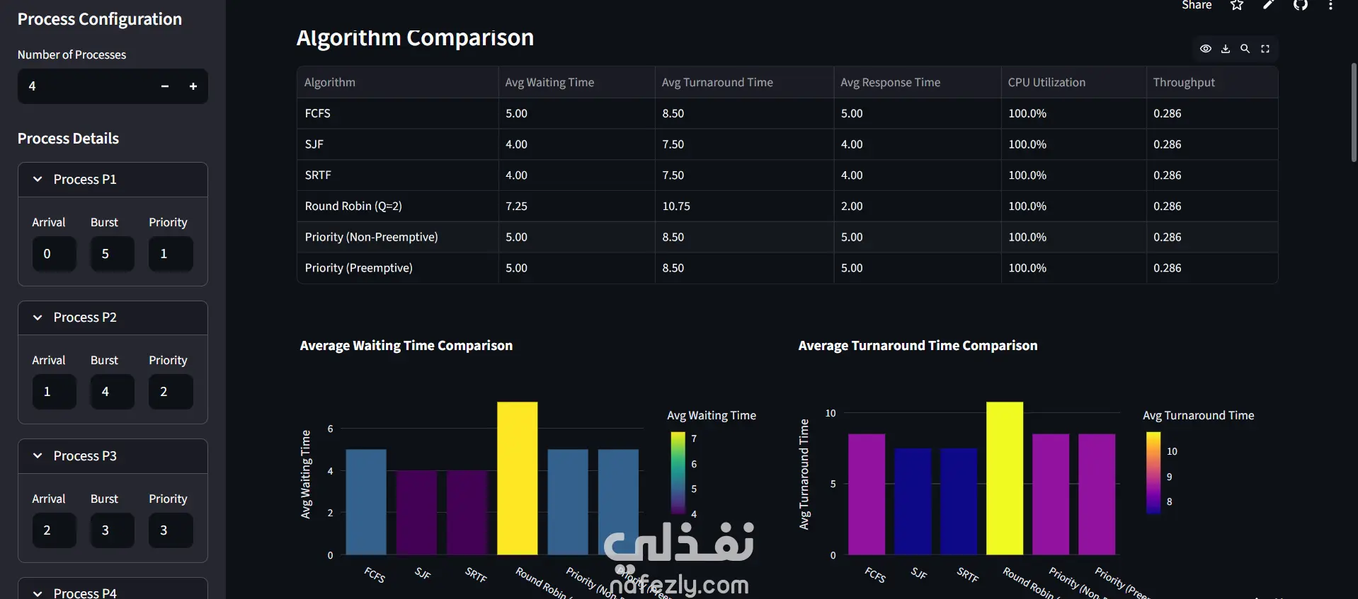 تطبيق ويب متقدم صُمم خصيصاً لمحاكاة وتحليل خوارزميات جدولة المعالج في نظم التشغيل. يتميز المشروع بواجهة مستخدم تفاعلية (Interactive UI) تحول العمليات الحسابية المعقدة إلى رسوم بيانية ومخططات زمنية سهلة القراءة، مما يجعله أداة تعليمية وتحليلية قوية