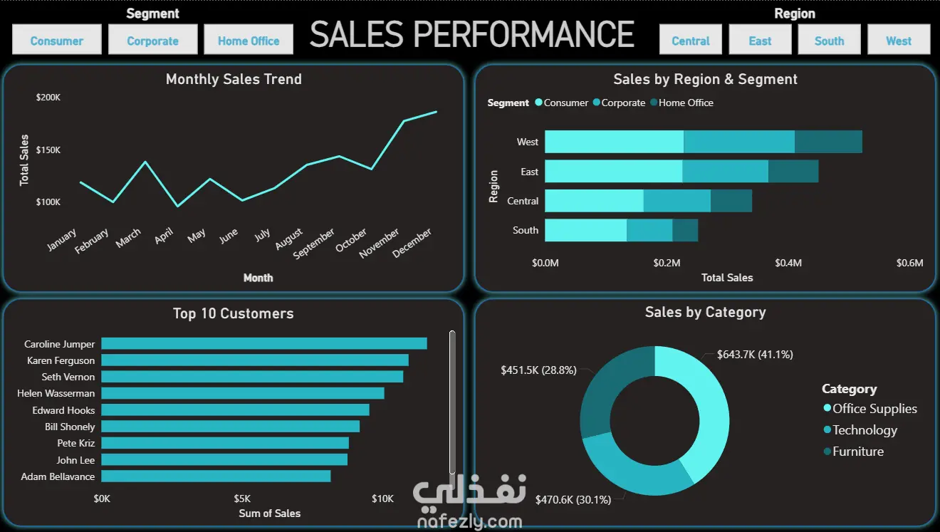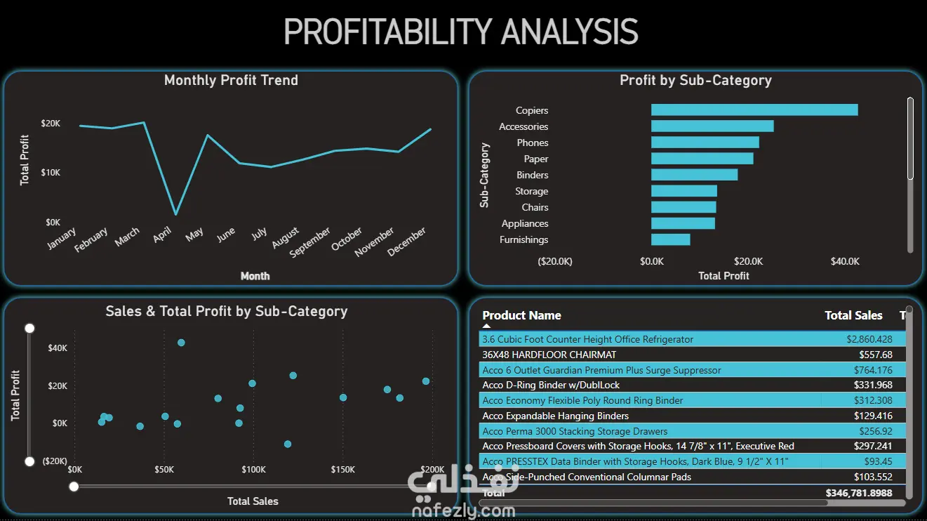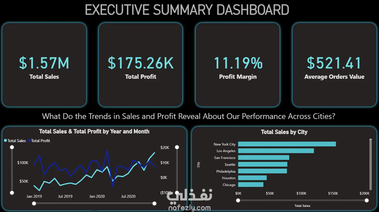 حل عبر Power BI يدمج المبيعات، مؤشرات الأداء، والربحية في لوحة واحدة. المبيعات بلغت ذروتها عند 180 ألف دولار شهرياً، وإقليم الغرب يقود بـ 0.55 مليون دولار. إجمالي المبيعات 1.57 مليون دولار، الأرباح 175 ألف دولار، والهامش 11.19%، مع نيويورك الأعلى بإيرادات 200 ألف دولار. التحليل يكشف فرص منتجات مثل آلات النسخ (+45 ألف دولار) وفئات بخسائر، موجهاً الاستراتيجية. A Power BI dashboard unifies sales, KPIs, and profitability. Monthly sales peak at $180K, West region leads with $0.55M. Totals: $1.57M sales, $175K profit, 11.19% margin, NYC highest at $200K. Analysis shows product opportunities like Copiers (+$45K) and loss-making sub-categories, guiding strategy