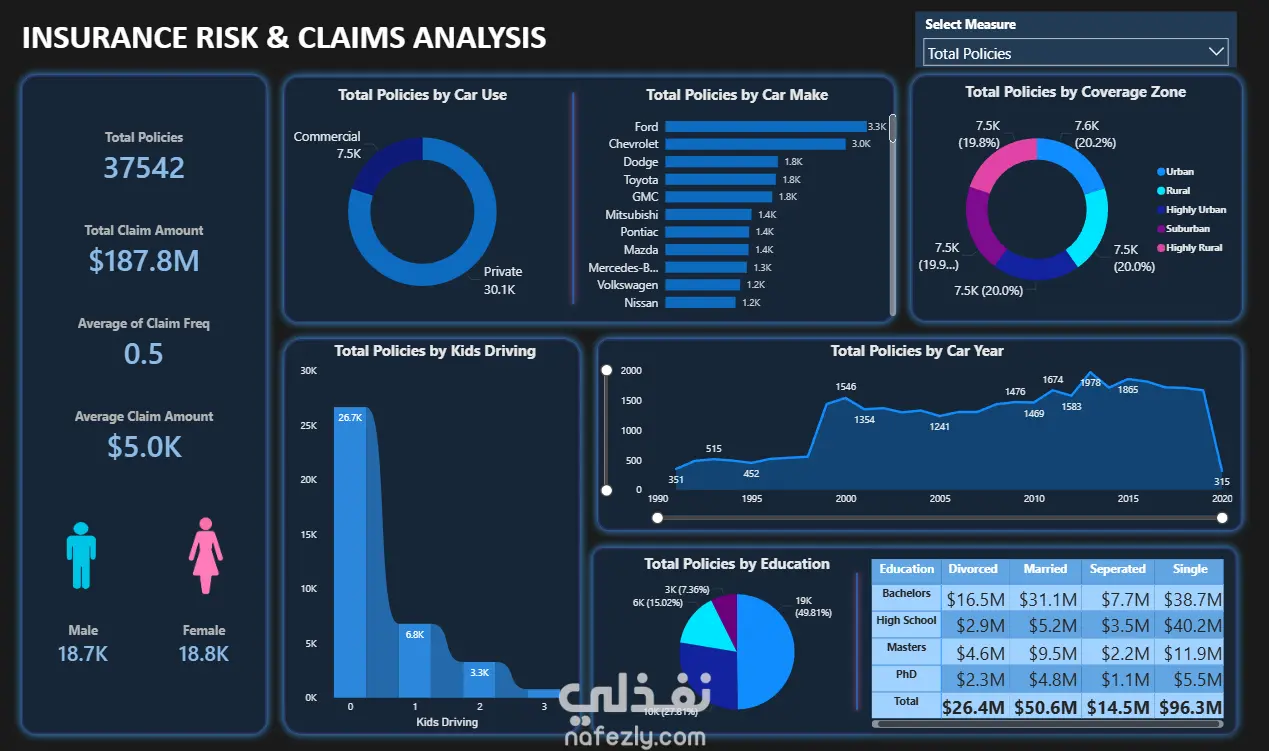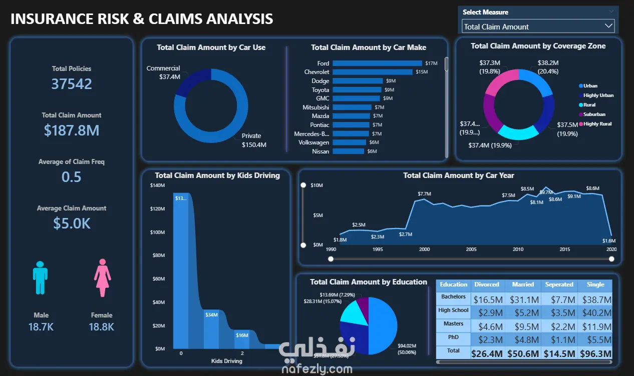 Developed a Power BI dashboard to analyze $187.8M in claims and 37,542 policies for a car insurance company. Goal: Identify high-risk segments to inform underwriting and marketing strategy. Solution: Created interactive visuals breaking down Total Claim Amount by Car Use (Private vs. Commercial), Car Make, Coverage Zone, and Marital/Education status. Impact: Provided clarity on claims drivers, revealing that Private use accounts for $150.4M and the Single/Married segments (regardless of education) drive the highest claim costs, enabling targeted risk management. طوّرت لوحة معلومات تفاعلية باستخدام Power BI لتحليل بيانات بقيمة 187.8 مليون دولار من المطالبات و 37,542 وثيقة تأمين سيارات. الهدف: تحديد الشرائح عالية المخاطر لدعم استراتيجيات الاكتتاب والتسويق. الحل: إنشاء تصورات تفاعلية توضّح إجمالي المطالبات حسب استخدام السيارة (خاص مقابل تجاري)، نوع السيارة، منطقة التغطية، والحالة الاجتماعية/التعليمية. الأثر: وفّرت وضوحاً فورياً حول العوامل المؤثرة في المطالبات، حيث أظهرت النتائج أن الاستخدام الخاص يمثل 150.4 مليون دولار، وأن الشرائح (أعزب/متزوج) بغض النظر عن المستوى التعليمي هي الأكثر تكلفة في المطالبات، مما مكّن الشركة من إدارة المخاطر بشكل موجّه وأكثر فعالية.
