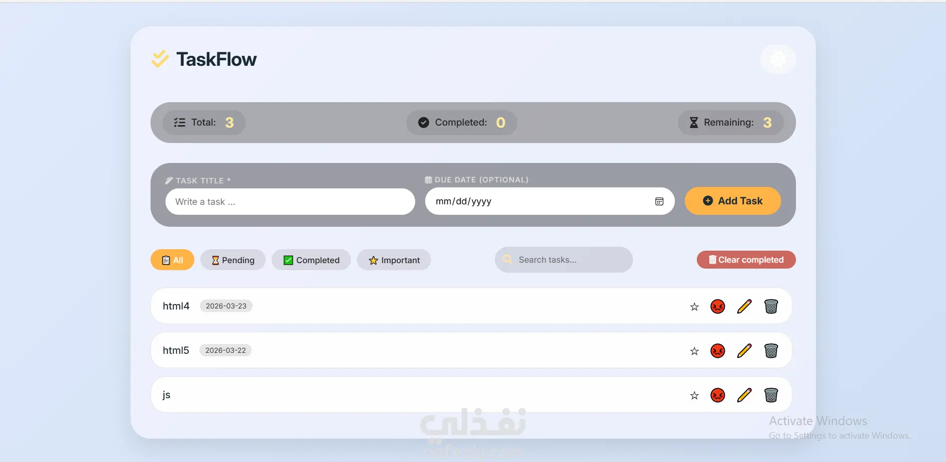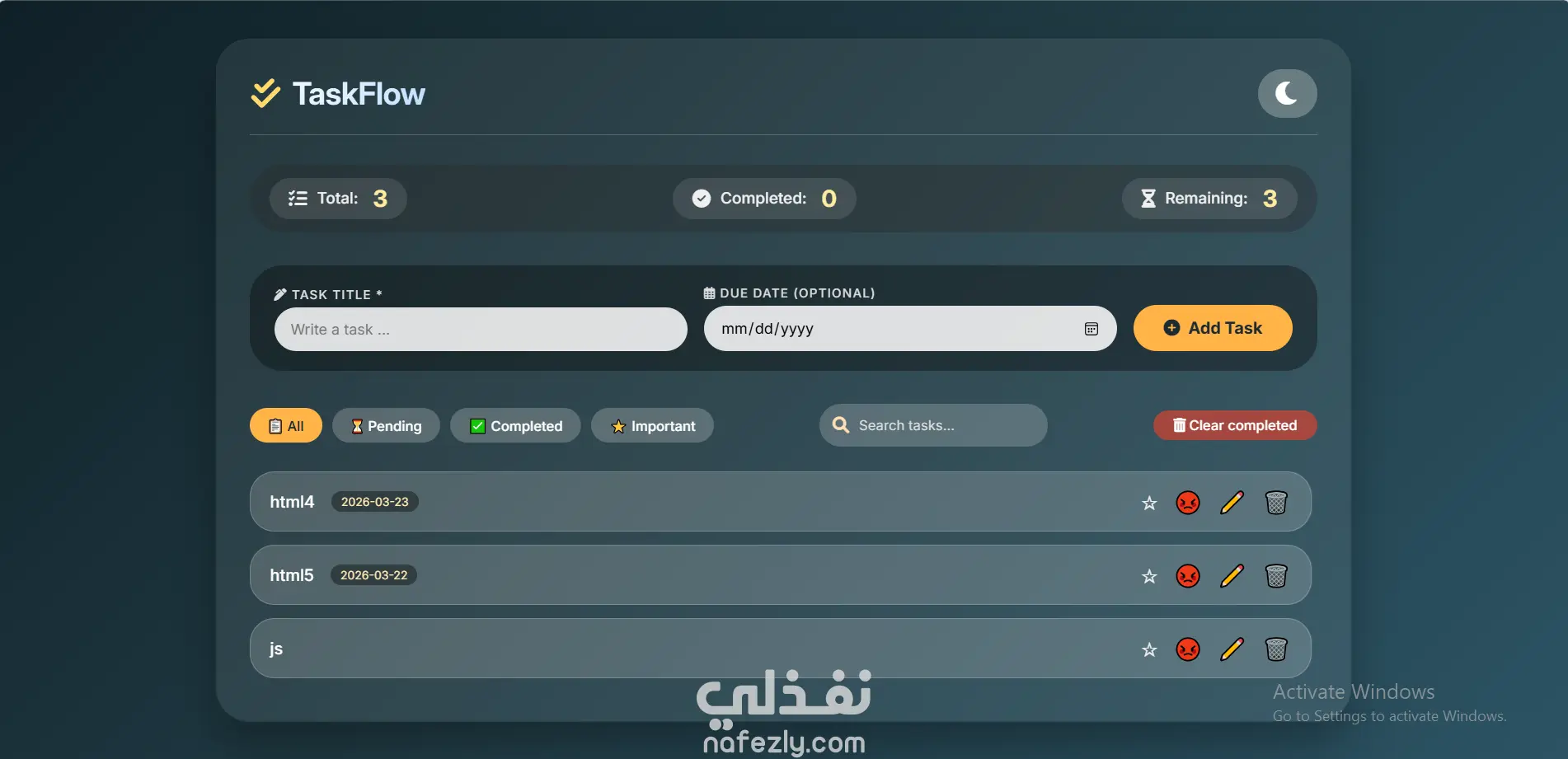 تطبيق ويب لإدارة المهام اليومية يتيح للمستخدم إضافة المهام، حذفها، تحديدها كمكتملة، وترتيبها حسب الأهمية. تم التطوير باستخدام HTML، CSS، وJavaScript الخالص (Vanilla JS) مع استخدام Local Storage لحفظ المهام تلقائياً بحيث تبقى متاحة بعد إعادة تحميل الصفحة. يتميز التطبيق بواجهة أنيقة بتأثير الزجاج (Glassmorphism)، وإحصائيات فورية للمهام (إجمالي، مكتمل، متبقي)، وإمكانية البحث والتصفية، وتحرير المهام، وحذف المهام المكتملة دفعة واحدة.
