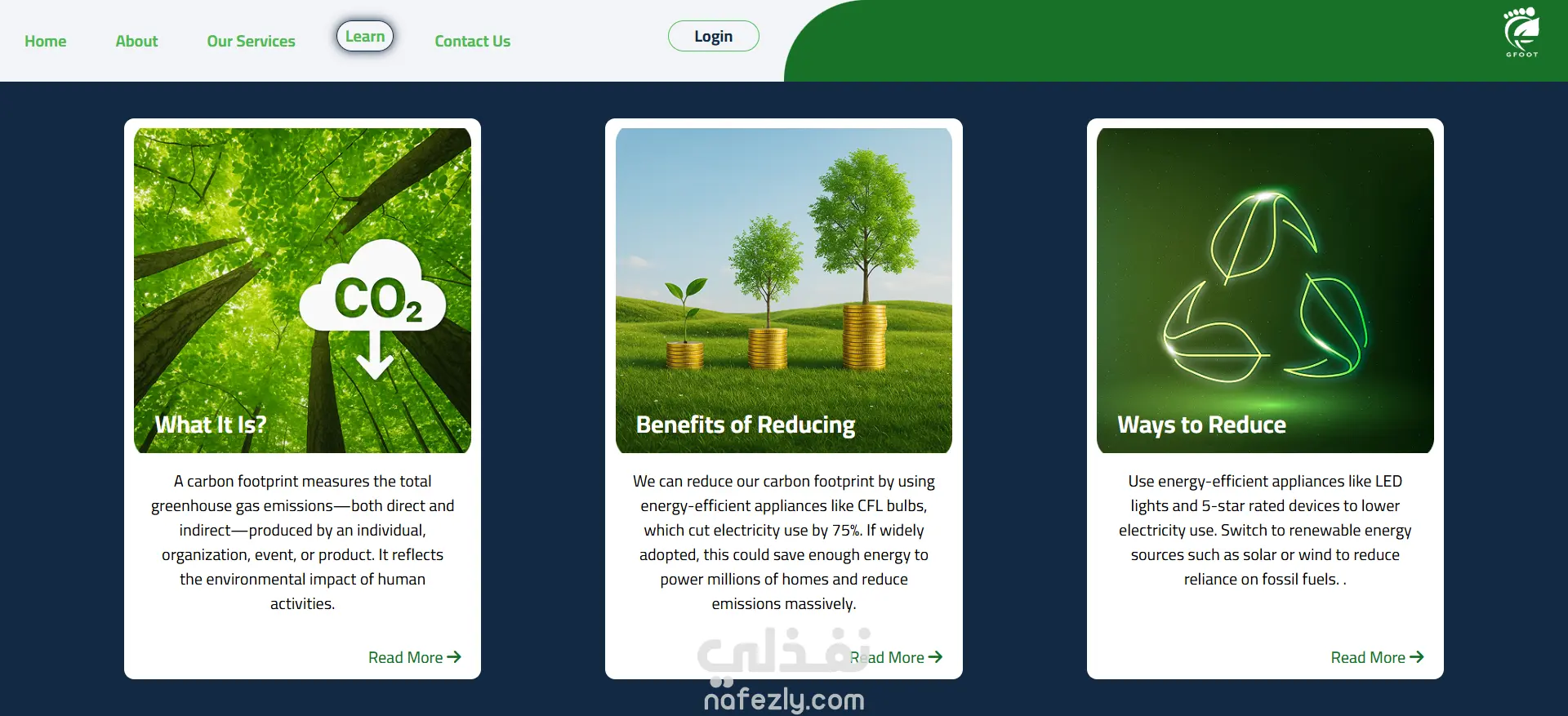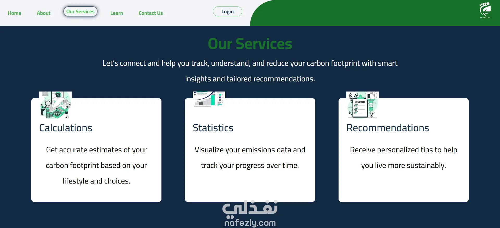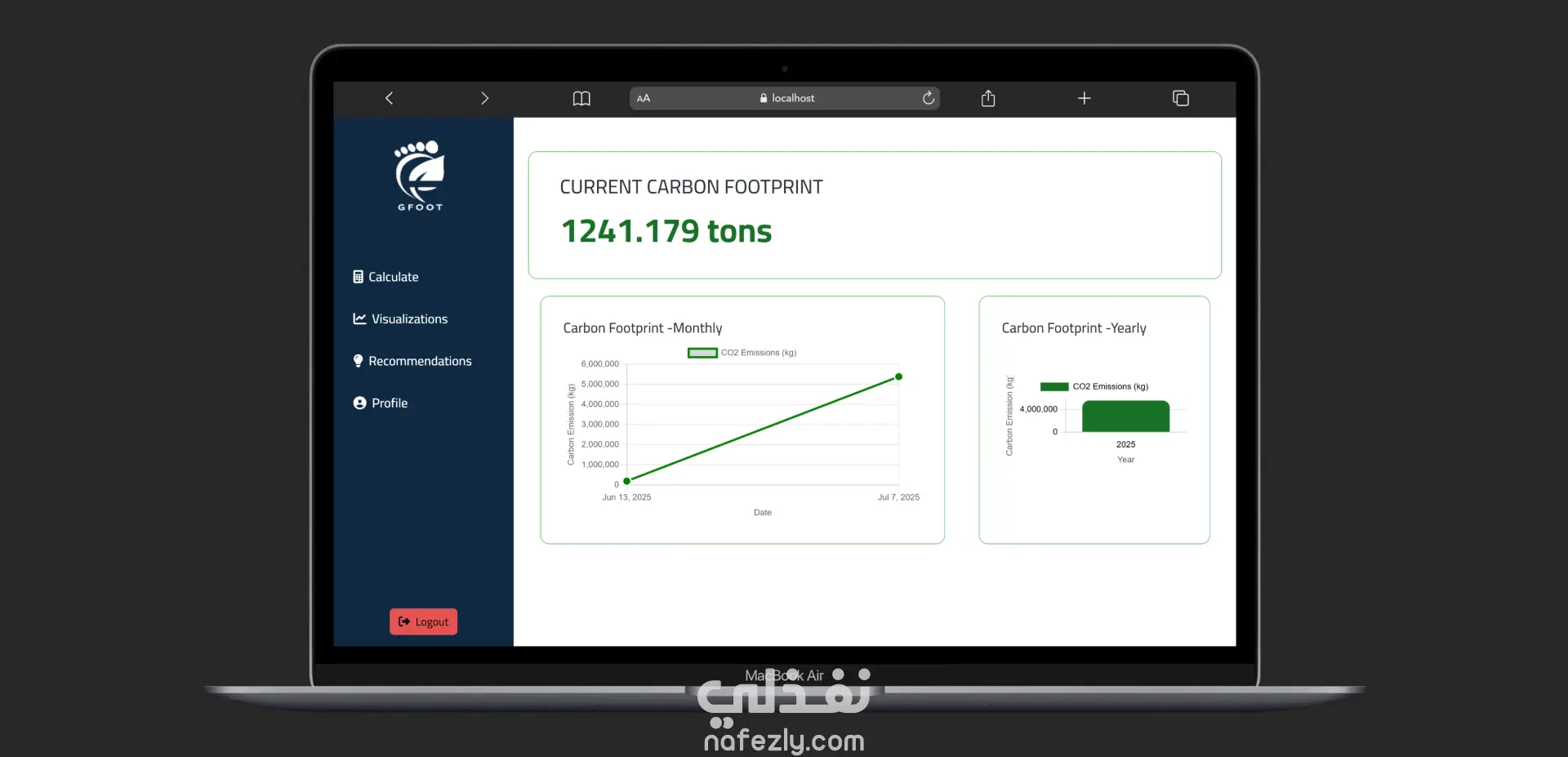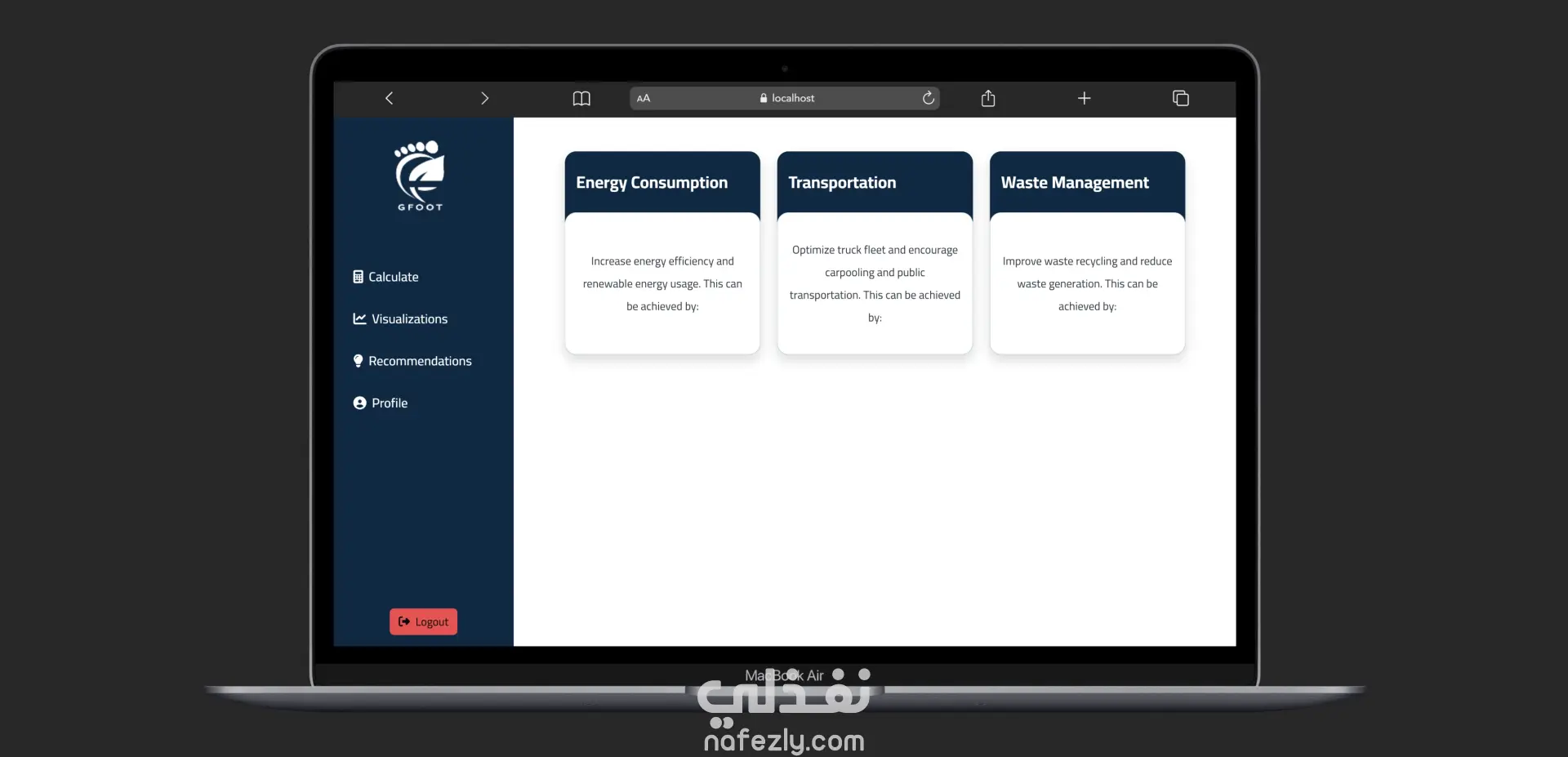 GFoot هو تطبيق ويب تفاعلي تم تطويره كمشروع تخرج، يهدف إلى تمكين المستخدمين من حساب وتقدير البصمة الكربونية الخاصة بهم بناءً على أنشطتهم اليومية مثل وسائل المواصلات، استهلاك الطاقة، والعادات الاستهلاكية.