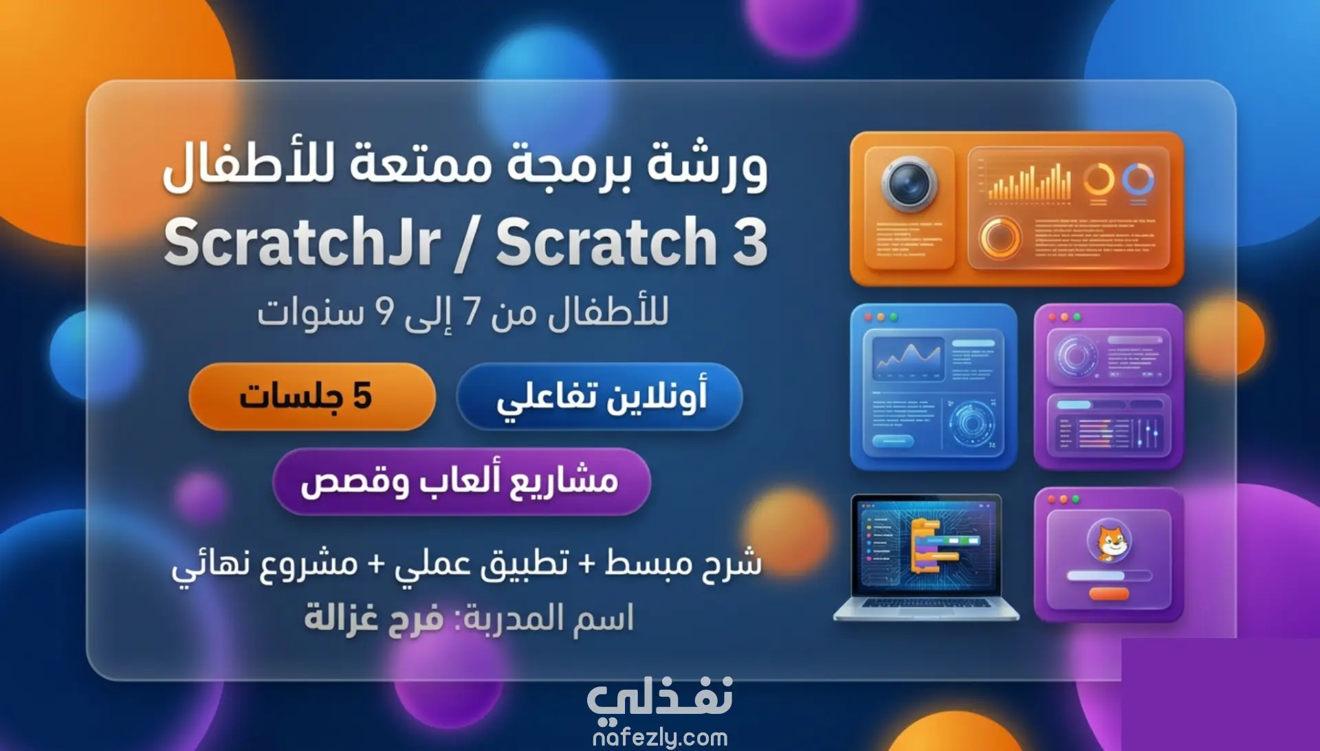 أقدّم ورشة تفاعلية أونلاين لتعليم البرمجة للأطفال (7–9 سنوات) باستخدام ScratchJr أو Scratch 3 عبر 5 سيشنات (Workshop) بأسلوب مبسط وممتع يعتمد على التطبيق العملي. خلال الورشة سيتعلم الطفل: أساسيات التفكير المنطقي والتسلسل (Sequence) التكرار (Loops) والشروط (If) بشكل مبسّط تصميم شخصيات وخلفيات وتحريكها إنشاء قصة/لعبة قصيرة في نهاية الورشة كمشروع نهائي شكل التدريب: 5 سيشنات تفاعلية (أونلاين) + تطبيق مباشر أثناء الشرح واجبات/تمارين بسيطة بعد كل سيشن (اختياري) متابعة تقدّم الطفل وإرشاد لطيف يناسب عمره النتيجة النهائية: بنهاية الورشة سيكون لدى الطفل مشروع/مشروعين (قصة أو لعبة) جاهزين للتشغيل، مع فهم واضح للمفاهيم الأساسية للبرمجة. عدد الجلسات: 5 جلسات مدة الجلسة: (45 دقيقة) المنصة: Zoom / Google Meet محتوى: شرح + تطبيق + مشروع تدريجي مخرجات: مشروع نهائي و عرض تقديمي + ملفات المشروع