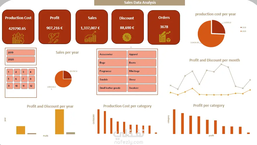 يحلّل هذا المشروع أداء المبيعات عبر فئات منتجات متعددة وفترات زمنية مختلفة، بهدف تقييم: -الربحية -تكاليف الإنتاج -الخصومات -سلوك الطلب والهدف هو مساعدة أصحاب القرار على فهم: -مصادر تحقيق الإيرادات -الفئات الأكثر ربحية -تأثير الخصومات والتكاليف على الأداء العام المشكلة (Problem): كانت الشركة تفتقر إلى رؤية موحدة لبيانات المبيعات والتكاليف، مما صعّب: -تتبع اتجاهات الأرباح والمبيعات وتكاليف الإنتاج عبر الزمن -تحديد الفئات الأعلى أداءً والأقل أداءً -فهم العلاقة بين الخصومات والأرباح -مقارنة الأداء بين السنوات والأشهر لذلك، كان من الضروري إنشاء لوحة تحكم تفاعلية مركزية لدعم اتخاذ القرار المبني على البيانات الأدوات (Tools): Microsoft Excel إعداد البيانات والنمذجة (Data Preparation & Modeling): تنظيف وتوحيد بيانات: -المبيعات -التكاليف -الأرباح -الخصومات -إنشاء مقاييس محسوبة (Calculated Measures) بناء نموذج Star Schema يربط بيانات المبيعات مع: -جدول التاريخ -جدول الفئات ملخص مؤشرات الأداء (KPI Summary): تم إنشاء بطاقات KPI لعرض: -إجمالي المبيعات -إجمالي الأرباح -إجمالي تكلفة الإنتاج -إجمالي الخصومات -إجمالي عدد الطلبات لتوفير نظرة سريعة وفورية على أداء الأعمال التصفية الزمنية (Time Filtering): إضافة فلاتر (Slicers) للسنة والشهر لتمكين التصفية الديناميكية والمقارنة بين الفترات بسهولة المبيعات والتكلفة حسب السنة: استخدام مخططات دائرية (Pie Charts) لمقارنة: -المبيعات السنوية -تكلفة الإنتاج السنوية لتحديد: أقوى سنة من حيث الأداء وأكثر سنة من حيث التكاليف اتجاهات الأرباح والخصومات الشهرية: إنشاء مخطط خطي (Line Chart) لتحليل: تغير الأرباح تغير الخصومات عبر الأشهر لاكتشاف: الفترات الأعلى أداءً الفترات الأقل أداءً مقارنة الأرباح والخصومات السنوية: استخدام مخططات أعمدة (Column Charts) لمقارنة: إجمالي الأرباح إجمالي الخصومات بين السنوات تحليل الفئات (Category Analysis): إنشاء مخططات شريطية (Bar Charts) لعرض: تكلفة الإنتاج لكل فئة الأرباح لكل فئة لتحديد: الفئات الأعلى تكلفة الفئات الأكثر ربحية