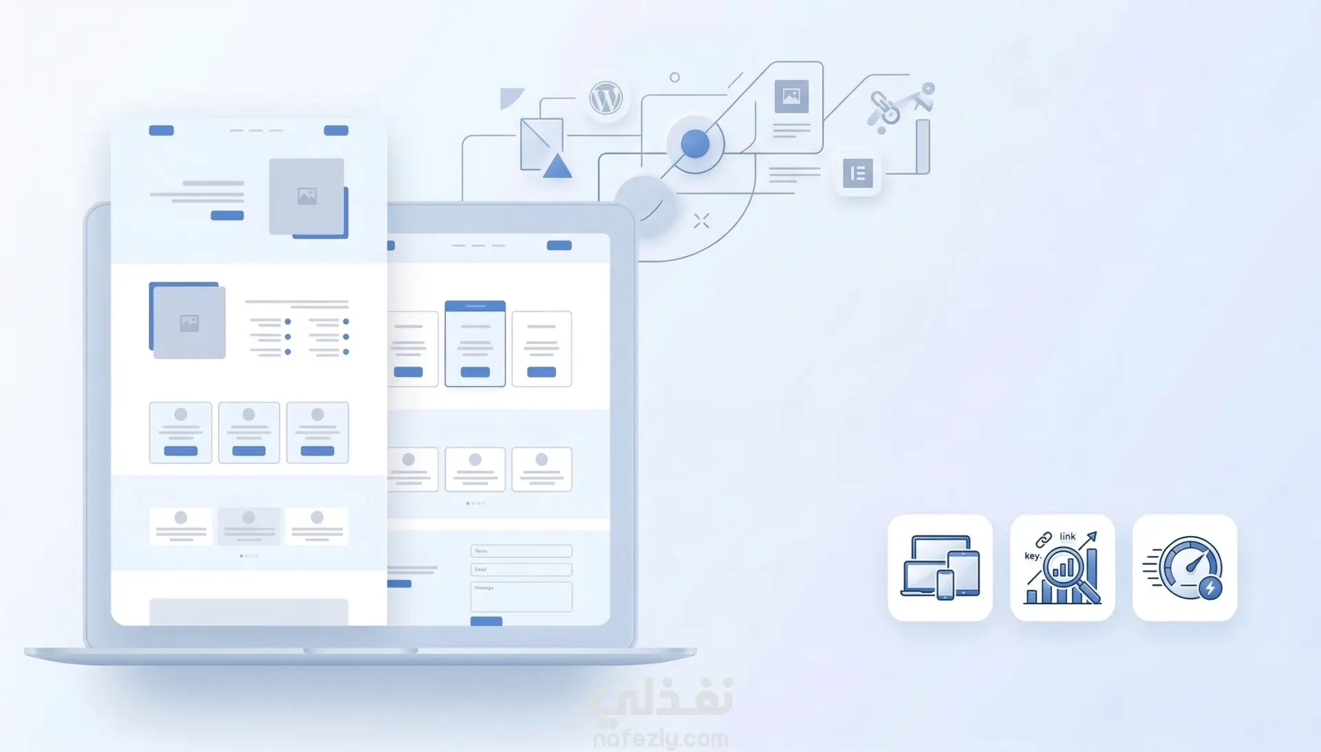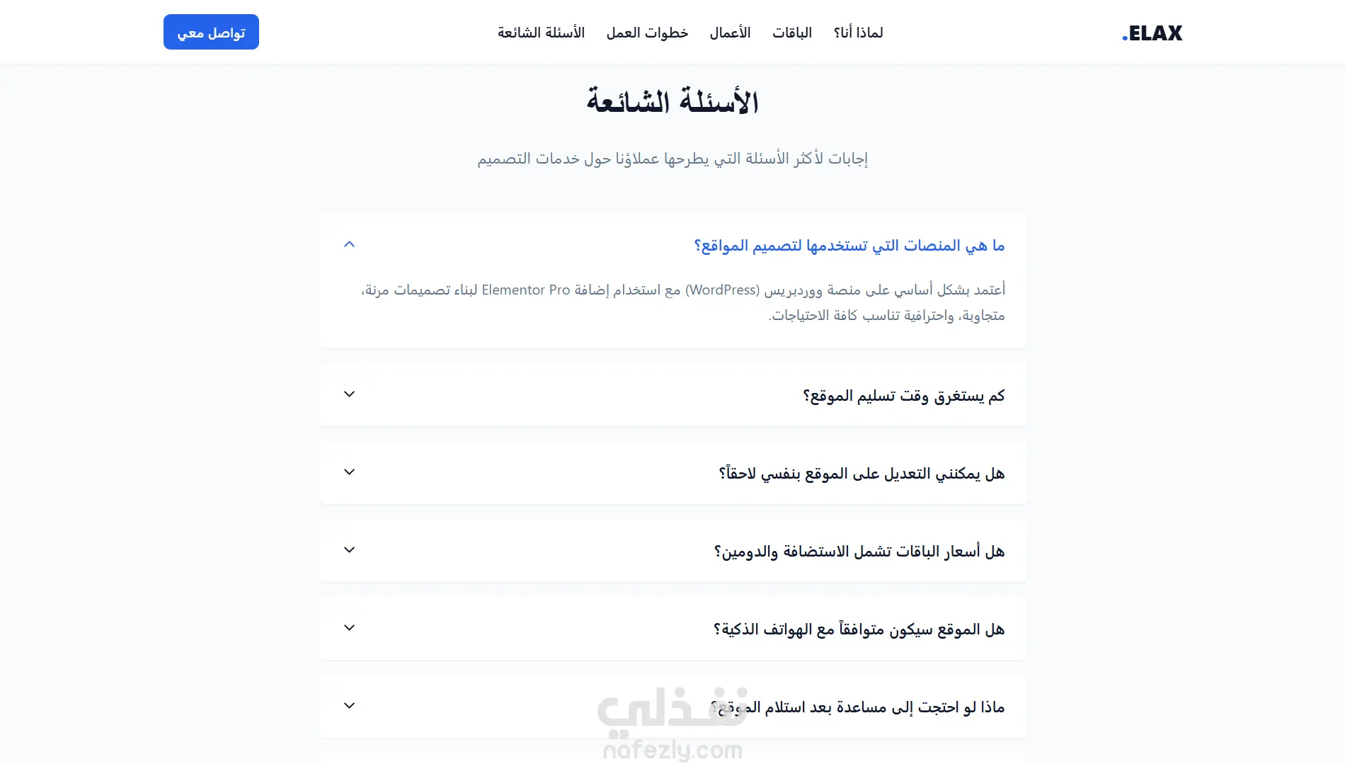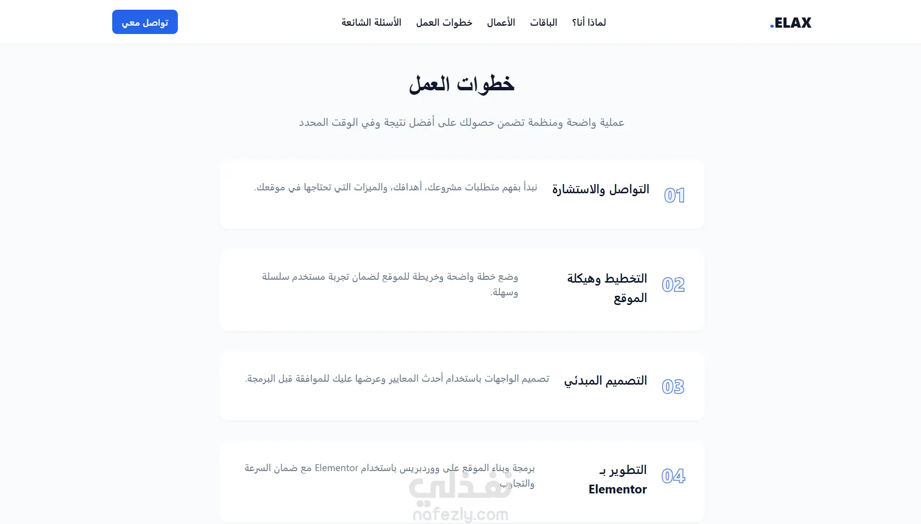 تصميم صفحة هبوط ووردبريس احترافية ومتجاوبة باستخدام Elementor بنفس أسلوب نماذجي وبأقسام جاهزة (باقات، أعمال، خطوات، FAQ، وتواصل).