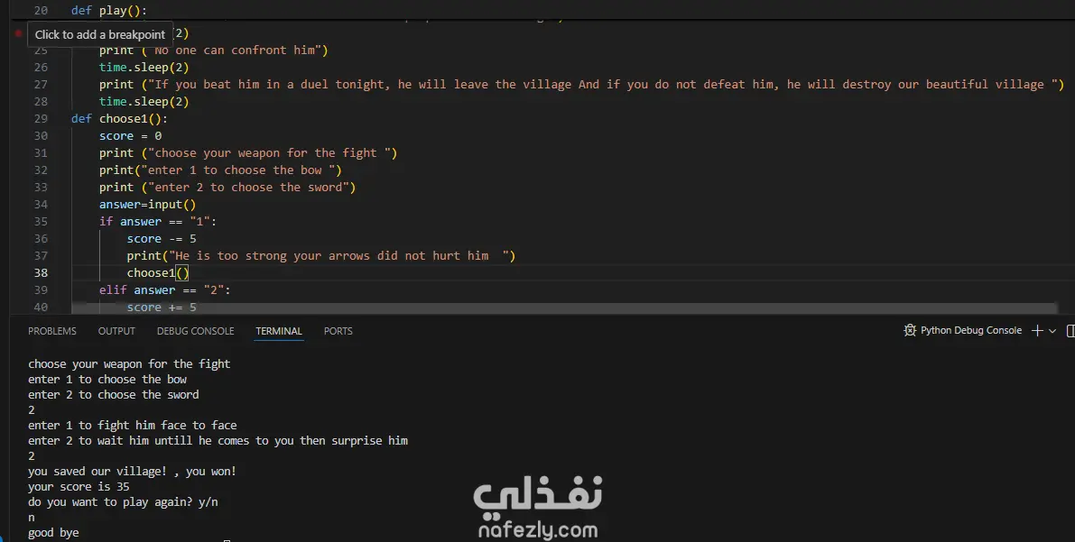 Developed a text-based interactive game using Python, focused on clean logic structuring and modular design. Key features include: Structured game flow using functions Conditional logic and loops for state management Input validation and user interaction handling Scoring system implementation Organized and readable code architecture The project emphasizes problem-solving, control flow design, and structured programming practices.