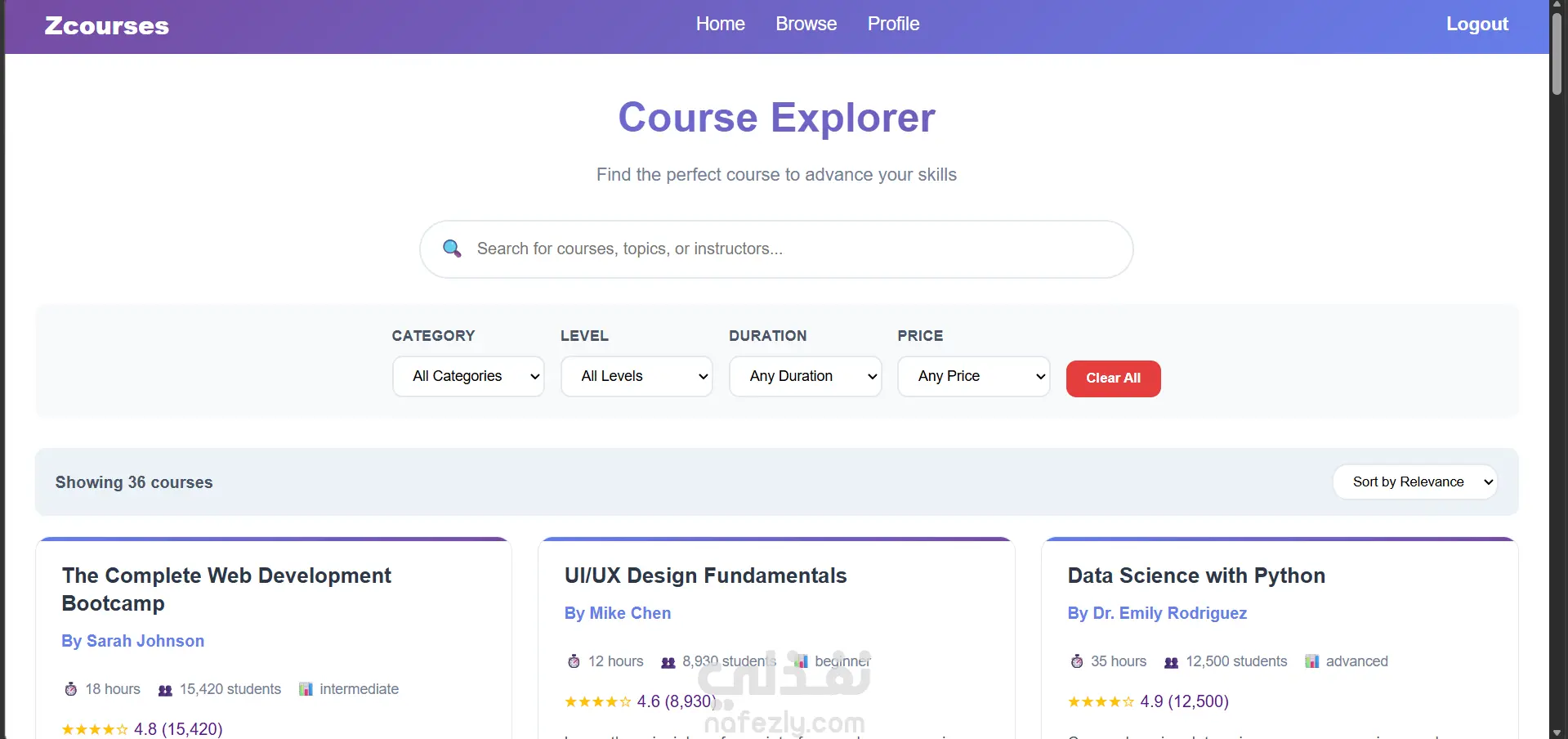 صفحة مخصصة لعرض جميع الدورات مع إمكانية تصنيفها.