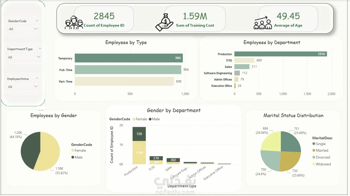 Built key HR KPIs including Total Salary, Employee Count, Training Cost, and Average Age