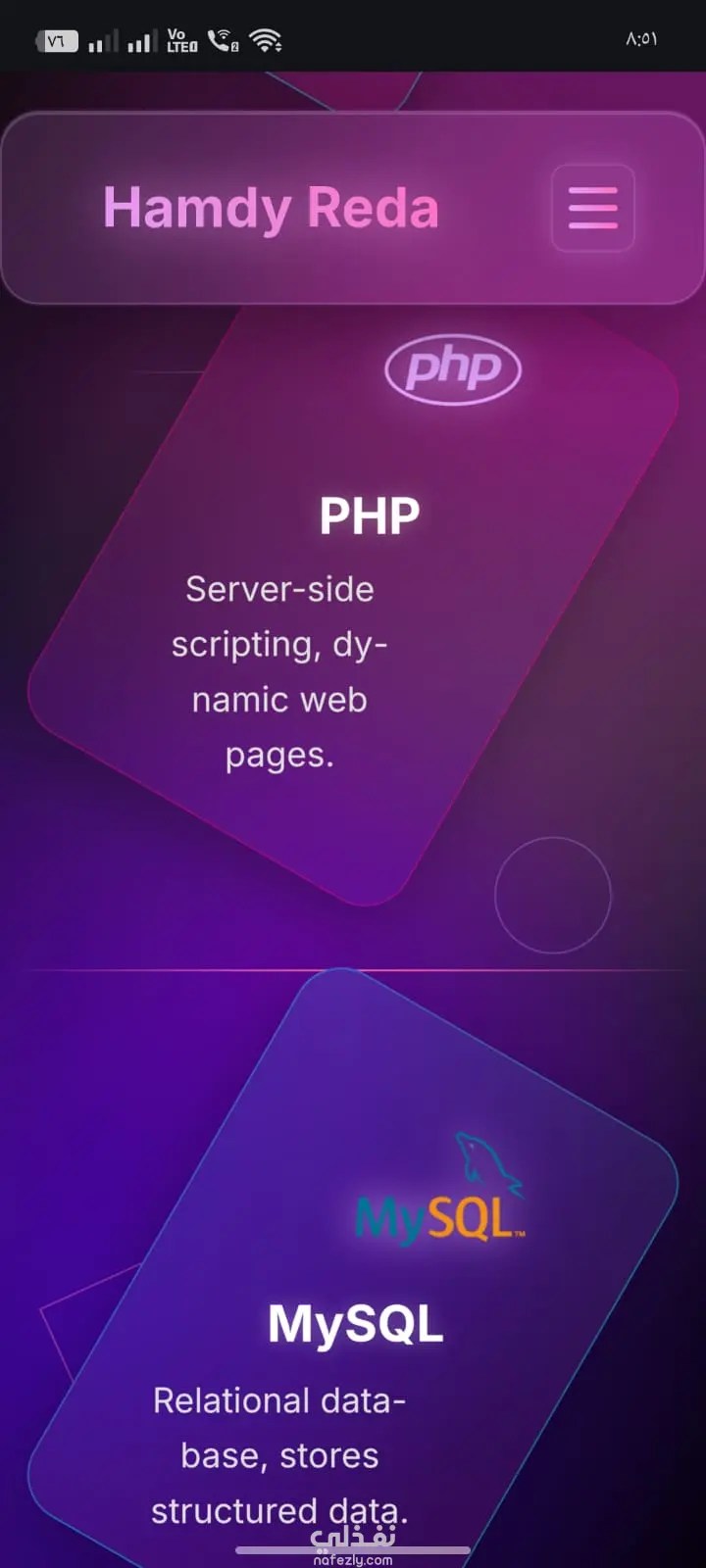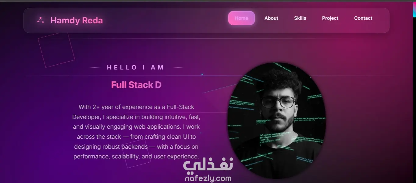 تم تطوير موقع **Portfolio شخصي** لعرض الأعمال والخدمات بطريقة احترافية تساعد على إبراز المهارات والخبرات بشكل منظم وجذاب.
