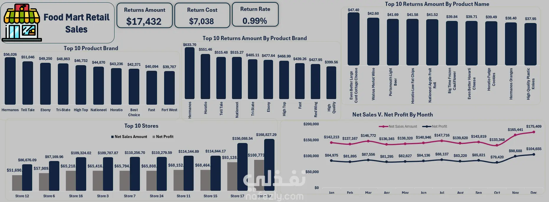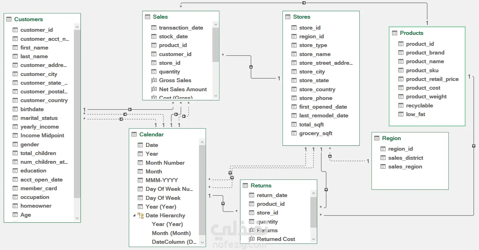 تم تصميم نموذج بيانات بنظام Star Schema، وتطوير مؤشرات أداء متقدمة تشمل صافي الربح، هامش الربح، معدل الإرجاع، ونمو المبيعات.