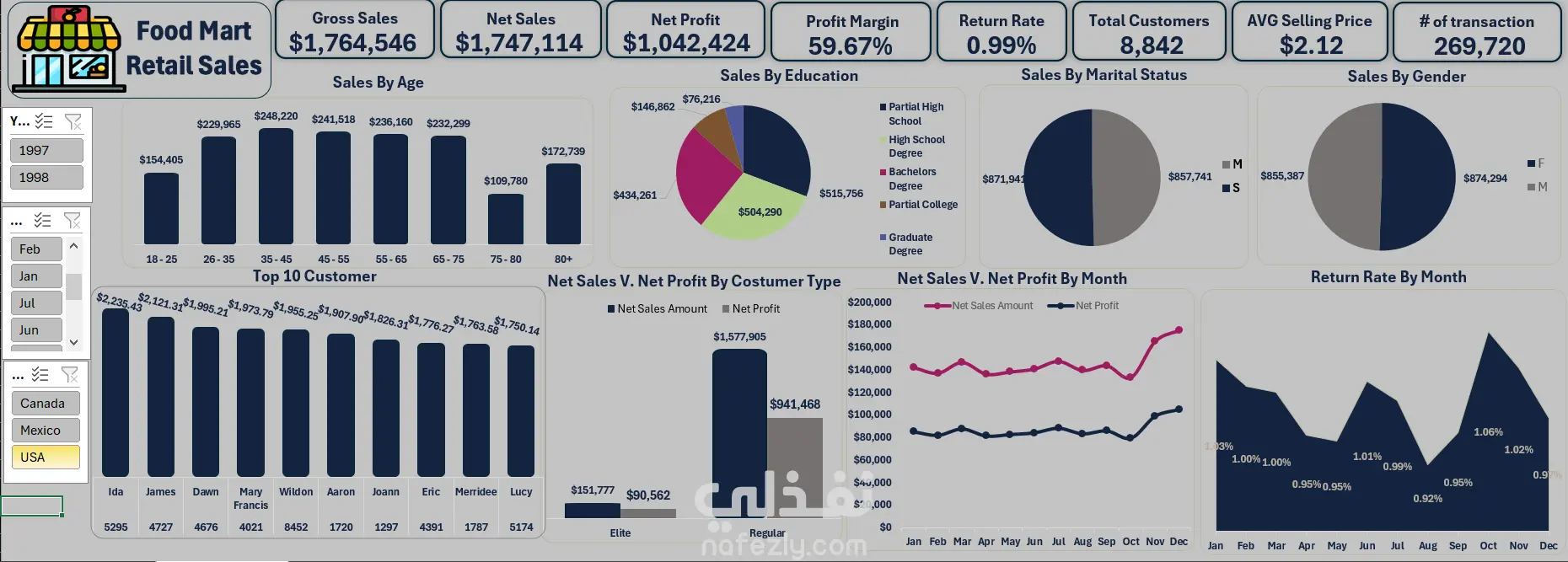 تم بناء حل تحليلي شامل لمبيعات قطاع التجزئة باستخدام Excel وPower Pivot وDAX بهدف تحليل الأداء المالي، تقسيم شرائح العملاء، وتتبع معدلات إرجاع المنتجات.
