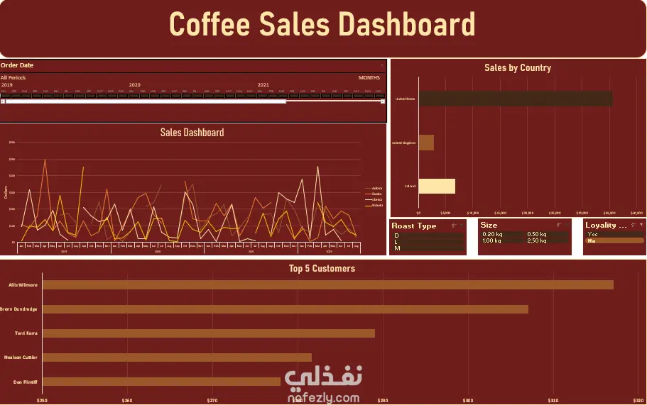 تم عمل تحليل للبيانات لمقهى باستخدام اكسيل و تم عمل داش بورد و التركيز على تحليل مبيعات خلال عدد سنين العمل و تحليل اعلى خمس عملاء للمقهى