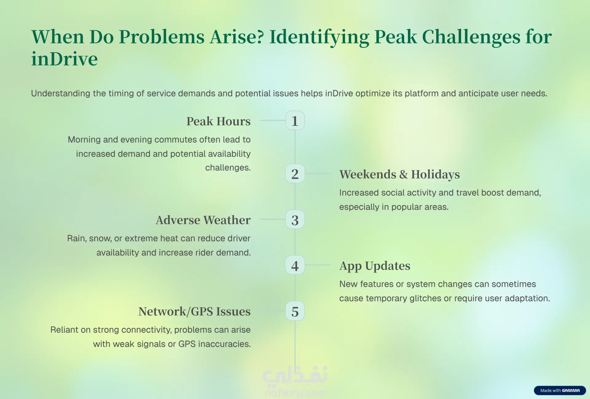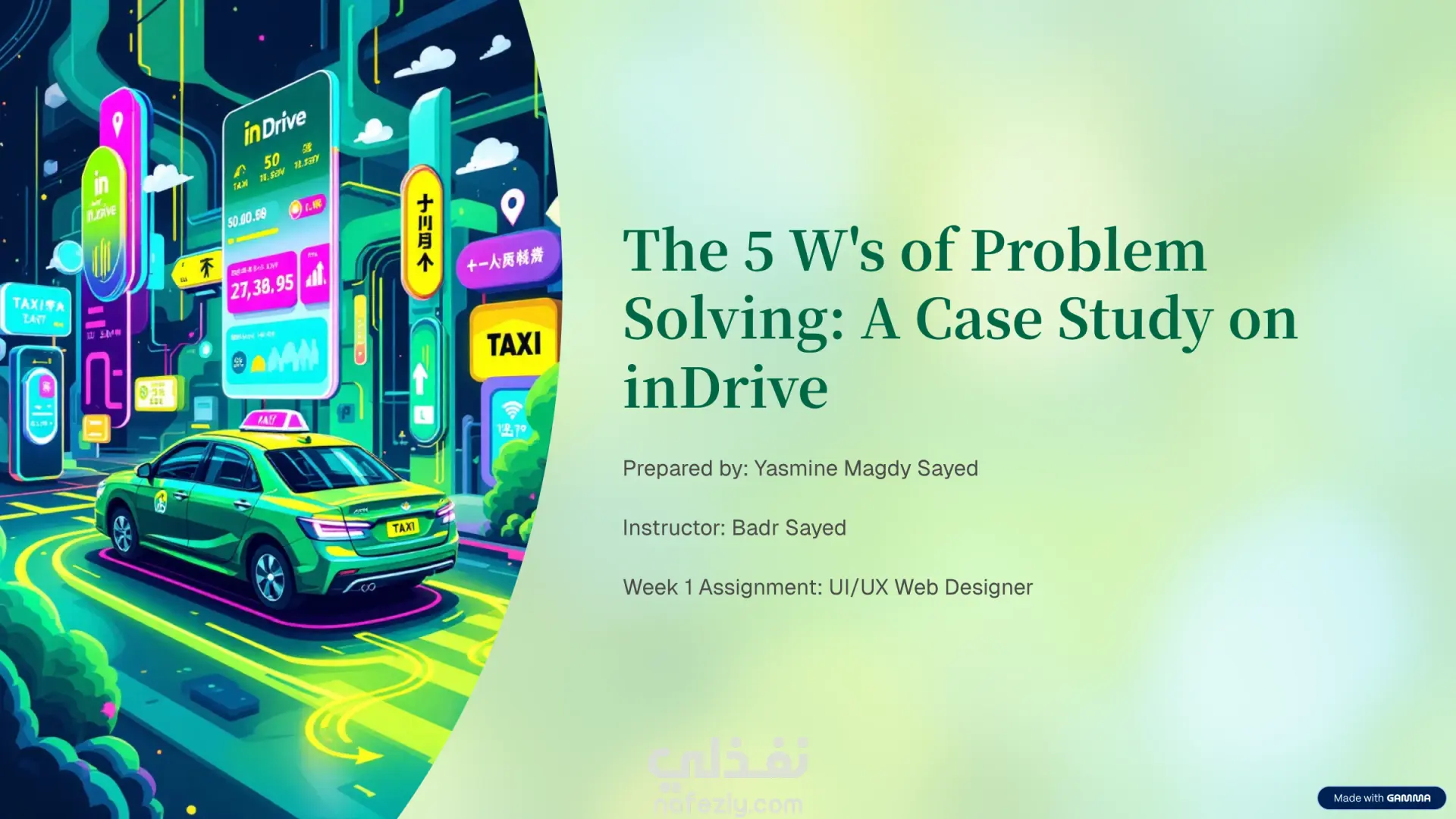 برزنتيشن يوضح خطوات حل المشكلات باستخدام إطار 5W’s، مع تحليل تفصيلي لتحديات Indrive وكيفية معالجتها بطريقة عملية ومنهجية."
