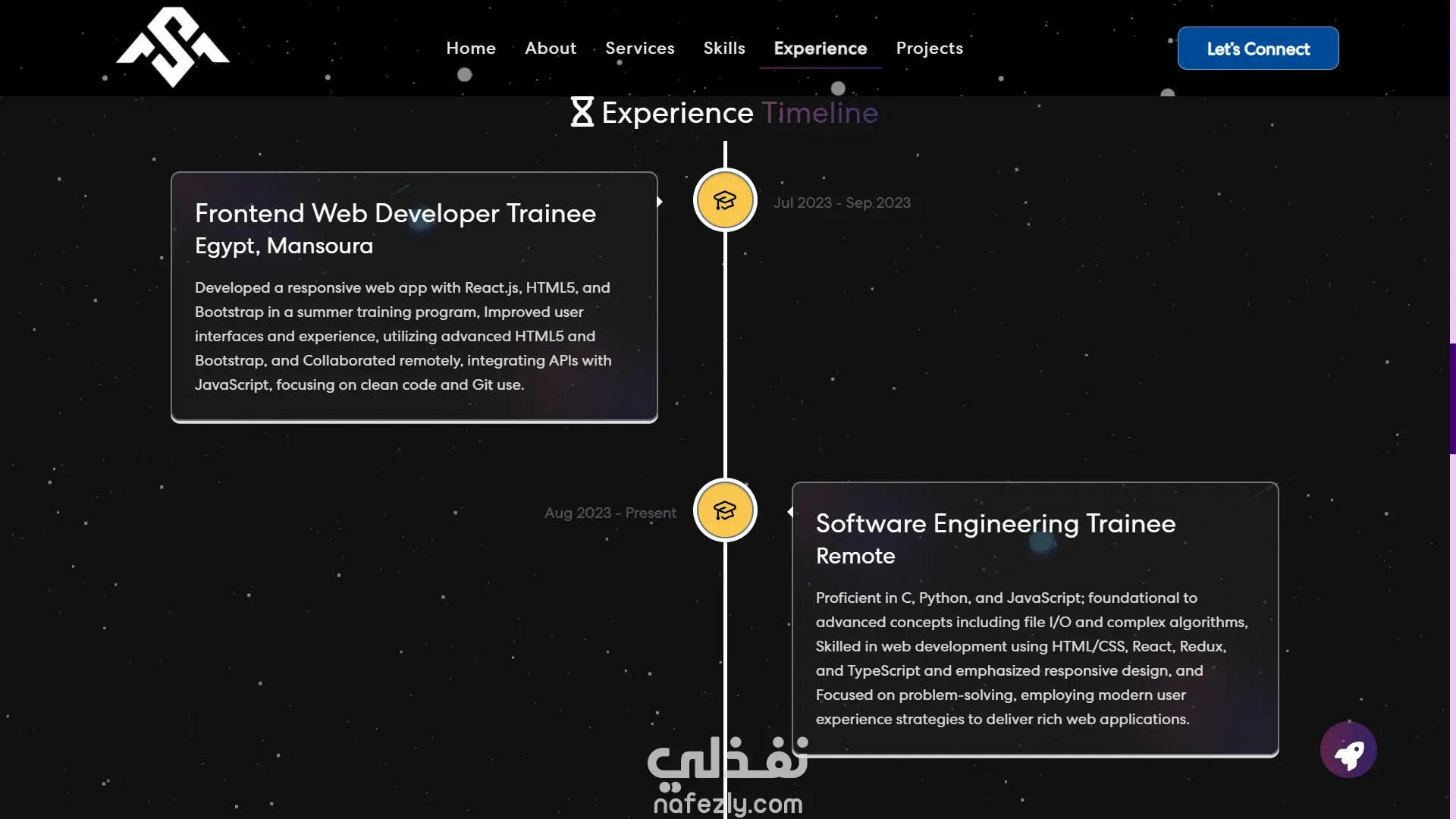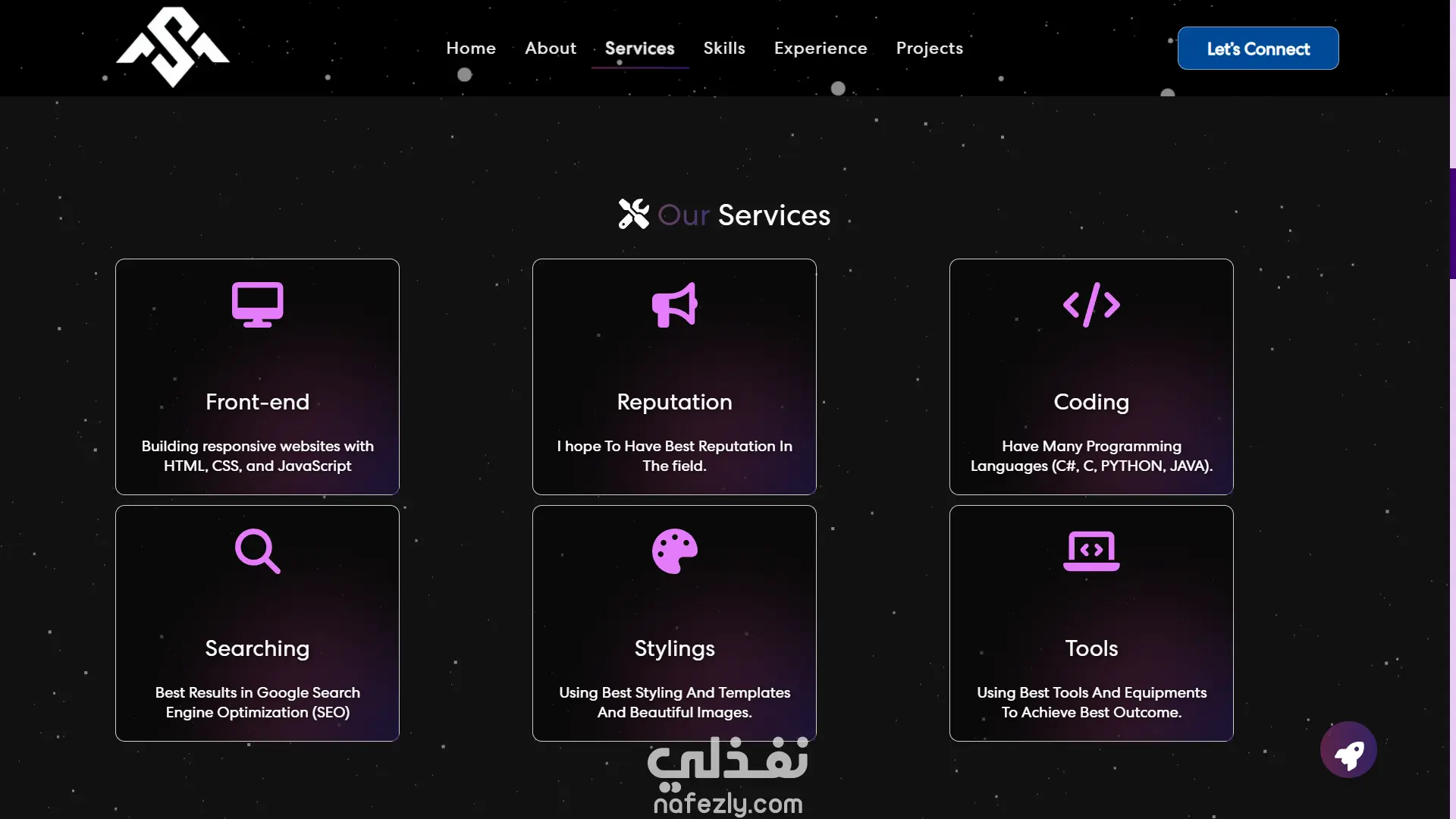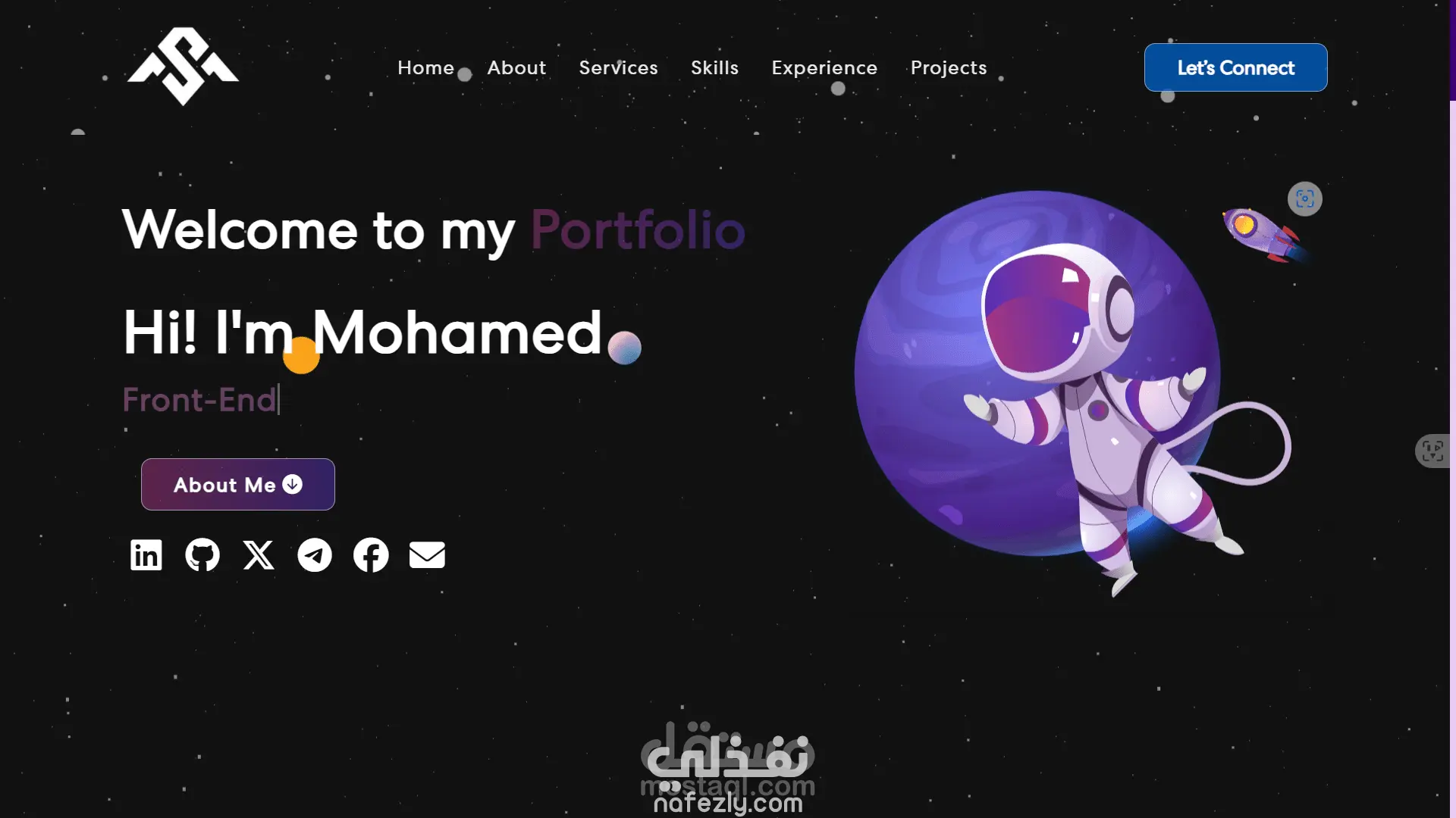 موقع Portfolio شخصي مخصص لعرض المهارات والمشاريع السابقة بتصميم عصري وجذاب. مبني بـ React وCSS3 مع التركيز على سرعة الأداء وسهولة التنقل بين الأقسام.