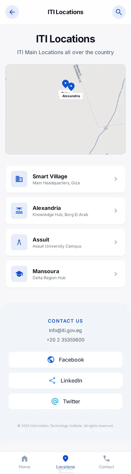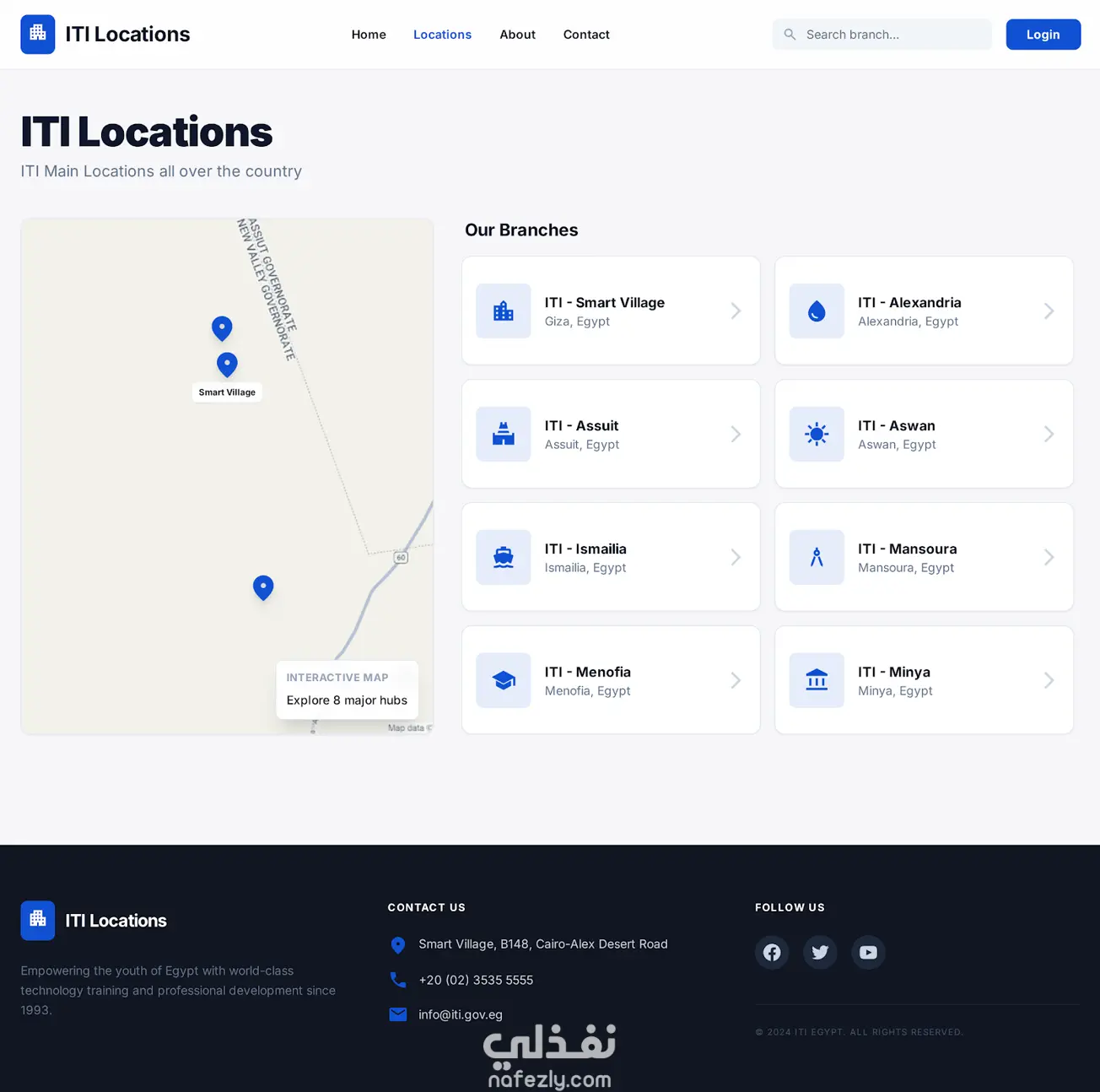 تصميم واجهة مستخدم (UI) متكاملة لمنصة عرض فروع معهد تكنولوجيا المعلومات (ITI)، مع التركيز على تقديم تجربة مستخدم (UX) سلسة عبر مختلف الشاشات.