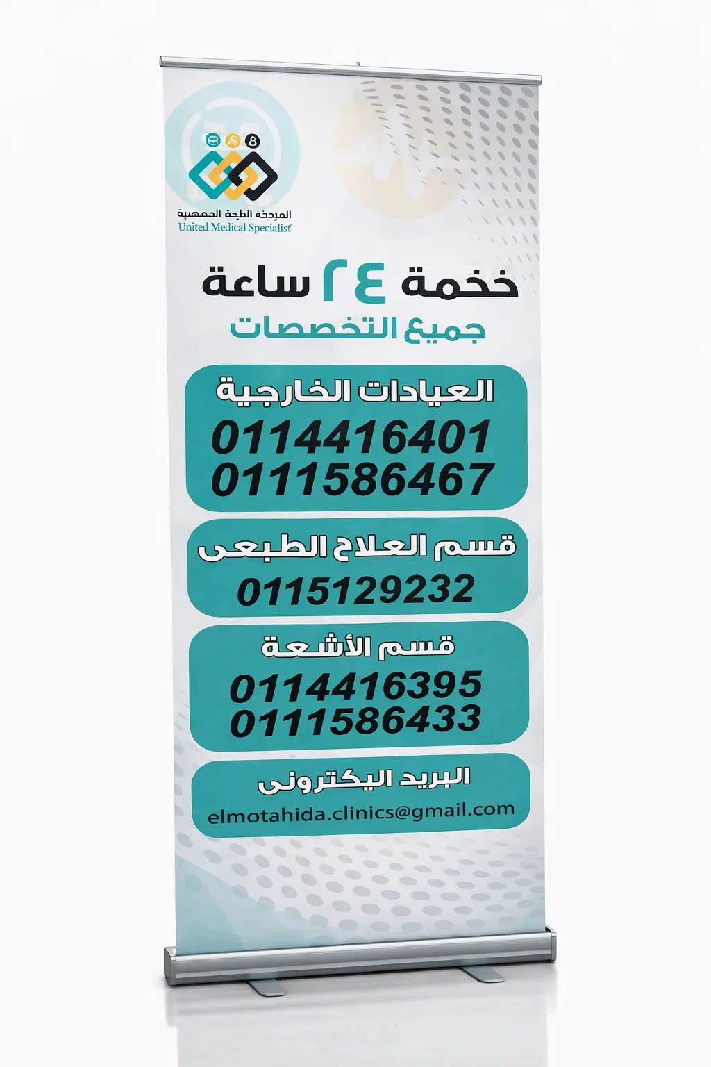 تم تصميم رول أب احترافي لعيادة طبية يعكس الهوية البصرية بشكل عصري وواضح، مع التركيز على إبراز الخدمات الطبية وسهولة قراءة البيانات للمرضى. 🔹 مميزات التصميم: تصميم حديث يناسب المجال الطبي توزيع بصري منظم وواضح للمحتوى استخدام ألوان هادئة تعكس الثقة والراحة إبراز الخدمات (مثل 24 ساعة – جميع التخصصات) تنسيق احترافي لأرقام التواصل والأقسام جاهز للطباعة بجودة عالية (High Resolution) 🔹 الهدف من التصميم: تقديم وسيلة دعائية قوية داخل العيادات والمراكز الطبية تساعد على جذب الانتباه وتعزيز ثقة العملاء.