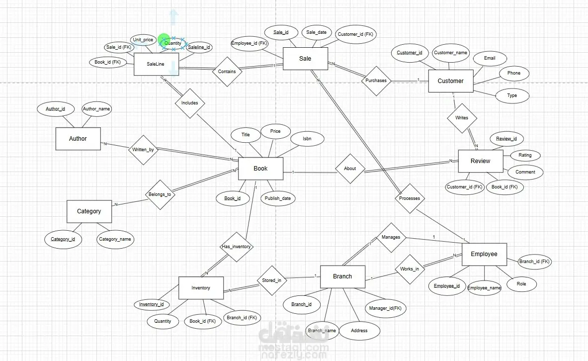 يهدف هذا المشروع إلى تصميم قاعدة بيانات متكاملة لنظام إدارة متجر كتب، بحيث يساعد النظام في تنظيم عمليات بيع الكتب، وإدارة المخزون، ومتابعة العملاء والموظفين، بالإضافة إلى إدارة الفروع والمراجعات الخاصة بالكتب. يعتمد النظام على مجموعة من الكيانات الرئيسية التي تمثل العناصر الأساسية في النظام. حيث يحتوي النظام على كيان الكتاب (Book) الذي يتضمن معلومات مثل عنوان الكتاب، السعر، رقم ISBN، وتاريخ النشر. ويرتبط الكتاب بكيان المؤلف (Author) حيث يمكن أن يكتب المؤلف عدة كتب، كما يمكن تصنيف الكتب ضمن فئات (Category) مختلفة. كما يتضمن النظام كيان العميل (Customer) الذي يحتوي على بيانات مثل اسم العميل والبريد الإلكتروني ورقم الهاتف ونوع العميل. يستطيع العملاء شراء الكتب من خلال عمليات البيع (Sale)، حيث يتم تسجيل تاريخ البيع والموظف المسؤول عن العملية والعميل الذي قام بالشراء. تتكون عملية البيع من عدة عناصر تسمى تفاصيل البيع (SaleLine) والتي تحدد الكتب التي تم بيعها، والكمية، وسعر الوحدة لكل كتاب. ويتم ربط هذه العمليات مع كيان الموظف (Employee) الذي يقوم بتنفيذ عملية البيع. يدعم النظام أيضاً إدارة المخزون (Inventory) بحيث يتم تتبع كمية كل كتاب في كل فرع (Branch) من فروع المتجر. كما يتم تسجيل الموظفين العاملين في كل فرع، ويمكن أن يكون لكل فرع مدير مسؤول عنه. إضافة إلى ذلك، يسمح النظام للعملاء بكتابة مراجعات (Review) للكتب التي قاموا بقراءتها، حيث تتضمن المراجعة التقييم والتعليق الخاص بالعميل على الكتاب.ساعد هذا التصميم في تنظيم البيانات وتقليل التكرار وضمان ترابط المعلومات بين مختلف أجزاء النظام، مما يسهل عمليات الإدارة، البحث، والتقارير داخل متجر الكتب.