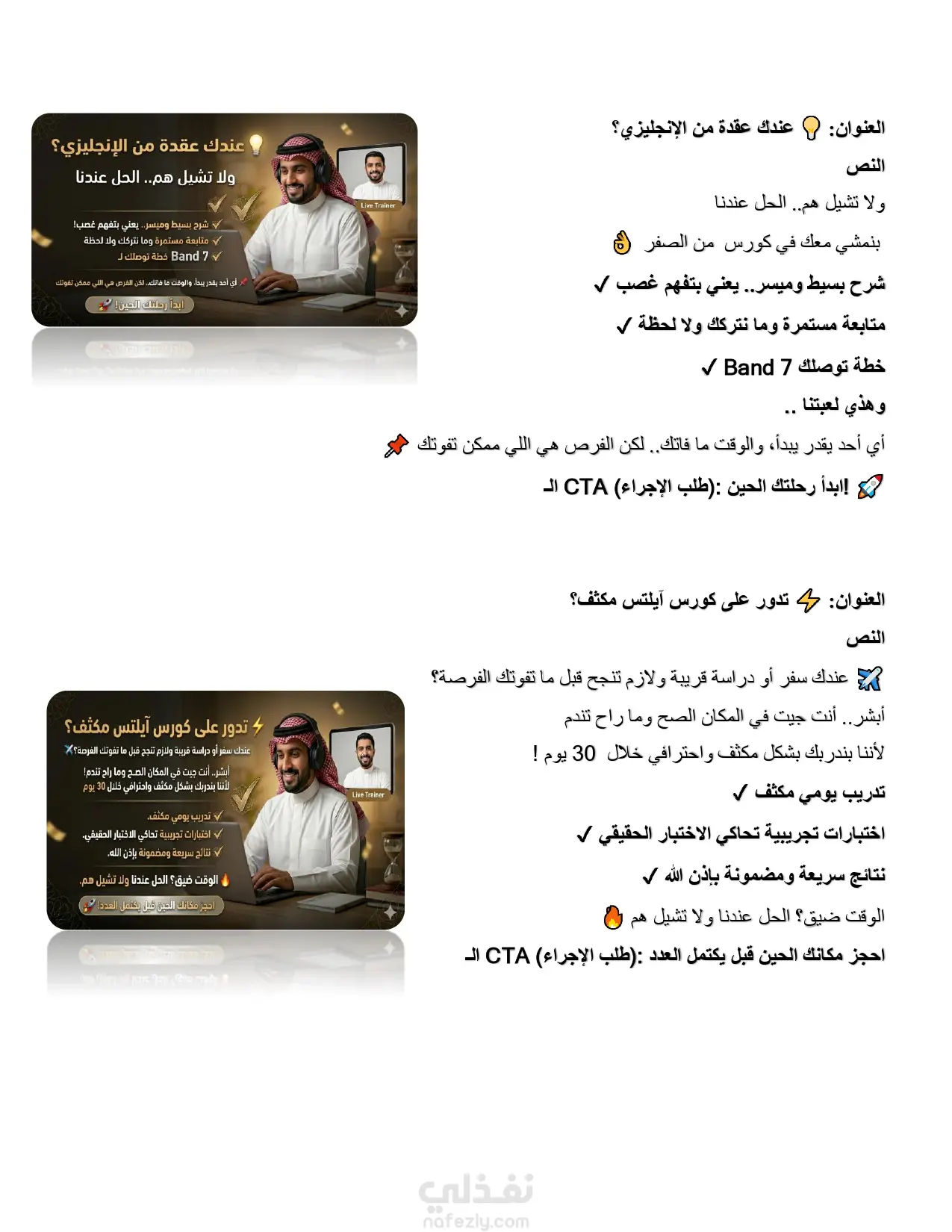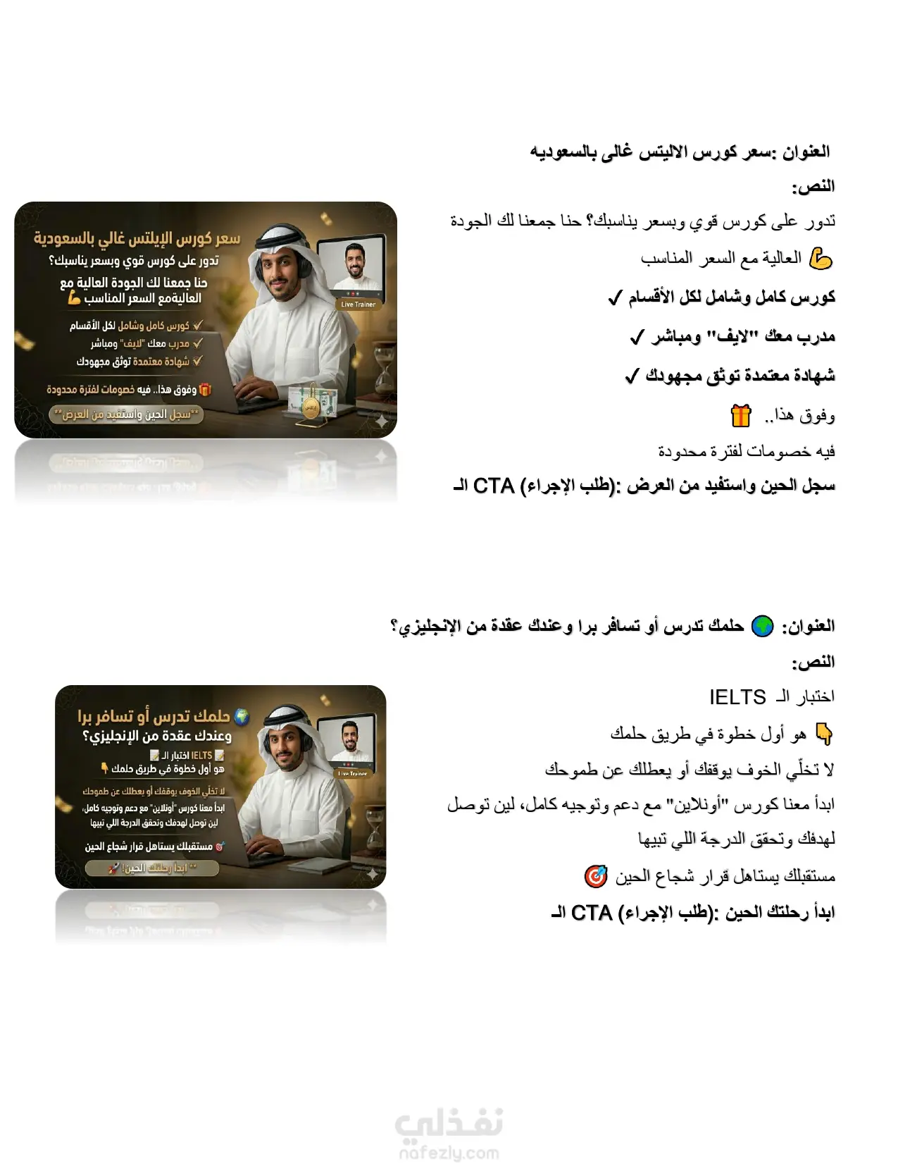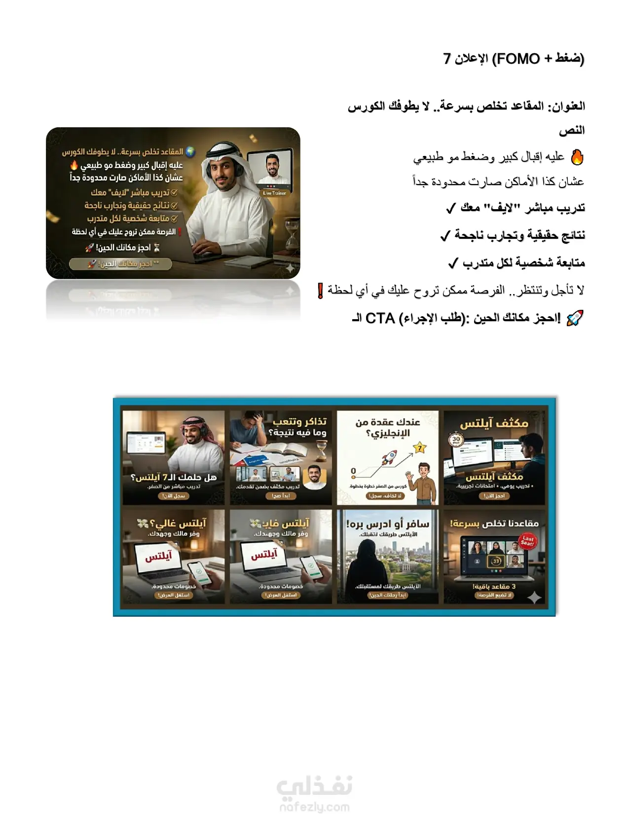 عملت على إنشاء وإدارة حملة إعلانية متكاملة لكورس IELTS بهدف زيادة عدد التسجيلات وجذب طلاب مهتمين فعليًا بالتحضير للاختبار. بدأت بدراسة الجمهور المستهدف (طلاب الجامعات والخريجين الراغبين في السفر أو الدراسة بالخارج، خاصة في دول الخليج)، ثم قمت بإعداد استراتيجية إعلانية تعتمد على استهداف دقيق واهتمامات مرتبطة بـ IELTS وتعلم اللغة الإنجليزية. قمت بكتابة نصوص إعلانية جذابة تركز على النتائج مثل الحصول على Band 7+، مع استخدام أسلوب نفسي يحفّز المستخدم على اتخاذ قرار التسجيل. كما قمت بتصميم أفكار إبداعية للإعلانات (Creatives) توضح رحلة الطالب من مستوى ضعيف إلى تحقيق نتيجة عالية، مما ساعد في زيادة معدل التفاعل والتحويل. ? نتائج الحملة: تحقيق عدد كبير من الـ Leads المهتمين بالكورس تقليل تكلفة الحصول على العميل (Cost Per Lead) تحسين معدل التحويل (Conversion Rate) ? ما يميز عملي: فهم عميق لسوق كورسات IELTS خبرة في كتابة الإعلانات الإقناعية (Copywriting) استخدام استراتيجيات استهداف دقيقة التركيز على النتائج وليس مجرد تشغيل الإعلانات