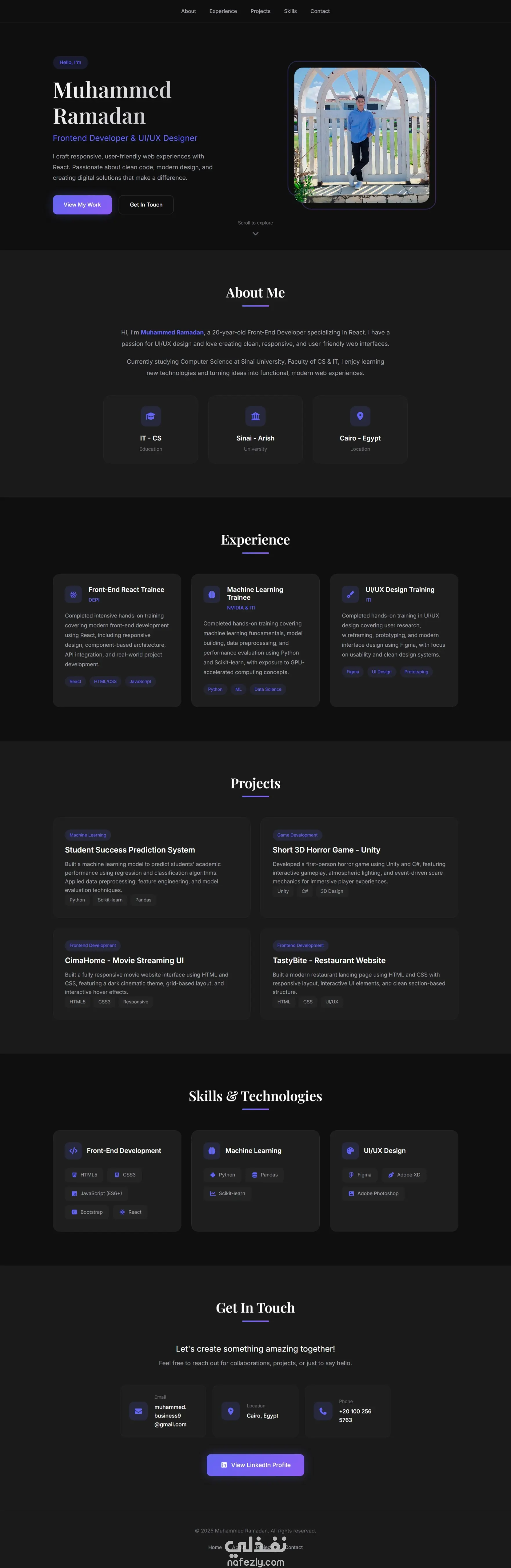 معرض اعمالي عبارة عن موقع كامل متجاوب لعرض الأعمال الشخصية والمهارات والخبرات. الموقع مصمم بشكل مرتب وعصري، مع التركيز على تجربة المستخدم وسهولة التصفح على كل الأجهزة (كمبيوتر، موبايل، تابلت). أقسام الموقع: • Landing Page (الصفحة الرئيسية): صفحة جذابة تعرض شعار الموقع وملخص عن صاحب الموقع وبعض الصور البارزة للأعمال. • Personal Info (المعلومات الشخصية): عرض معلومات عن صاحب الموقع مثل التعليم، الخبرات السابقة، وسائل التواصل، وأي معلومات تعريفية مهمة. • Skills & Expertise (المهارات والخبرات): قسم يعرض المهارات التقنية والخبرات العملية بطريقة منظمة وجذابة، مع أيقونات ورسوم توضيحية. • Contact Us (تواصل معنا): نموذج اتصال بسيط يسمح للزوار بإرسال استفساراتهم أو رسائل مباشرة، مع تفاصيل التواصل الأخرى. مميزات المشروع: • Responsive Design: الموقع متوافق مع كل الأجهزة والشاشات المختلفة. • Clean HTML & CSS: كود نظيف ومنظم لتسهيل الصيانة والتعديل. • User-Friendly: تصميم بسيط وسهل الاستخدام لتجربة أفضل للزوار. • Modern Layout: ألوان جذابة وتنسيق متناسق لكل الأقسام. الأدوات المستخدمة: • HTML5 • CSS3 • Javascript • Bootstrap
