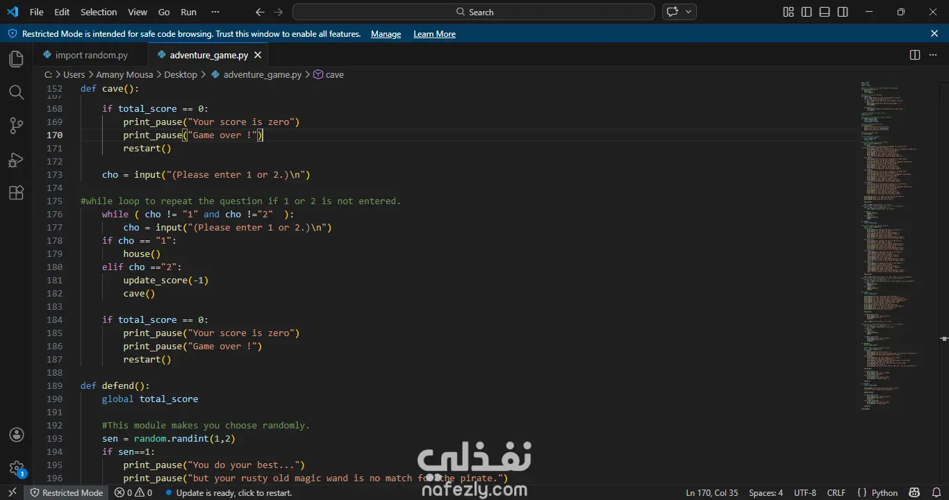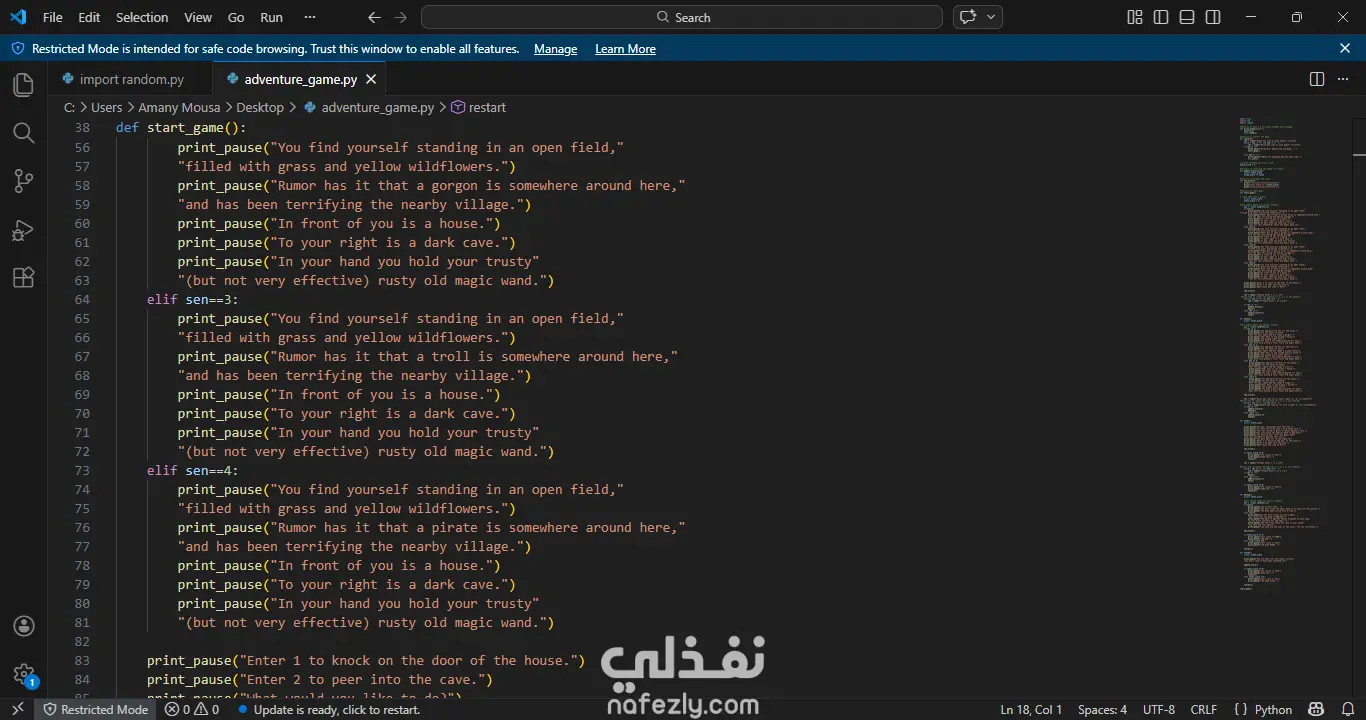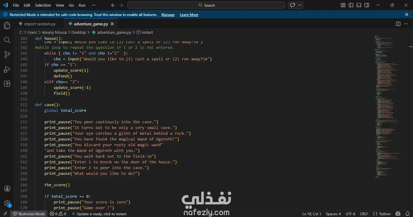 اسم المشروع: Adventure Game Using Python وصف المشروع: قمت بتطوير لعبة تفاعلية باستخدام لغة Python تعمل من خلال سطر الأوامر (CLI)، حيث يعيش المستخدم مغامرة خيالية مليئة بالاختيارات التي تؤثر على سير اللعبة ونهايتها. تعتمد اللعبة على اتخاذ القرارات (Decision Making) مثل دخول المنزل أو الكهف، ومواجهة أعداء مختلفين مثل (troll – pirate – dragon)، مع نظام نقاط (Score System) يحدد نتيجة اللاعب (فوز أو خسارة). ما يميز المشروع: لعبة تفاعلية تعتمد على اختيارات المستخدم سيناريو عشوائي في كل مرة (Random Events) نظام نقاط (Score System) أكثر من نهاية (Win / Lose) استخدام دوال (Functions) لتنظيم الكود تحسين تجربة المستخدم باستخدام التأخير الزمني (Time Delay) التقنيات المستخدمة: Python Random Time Control Flow (if / while) Functions