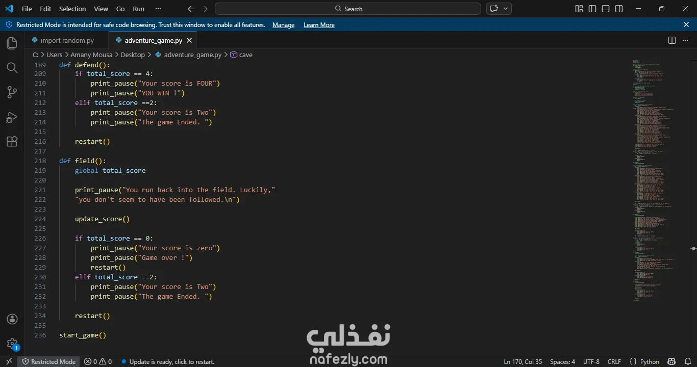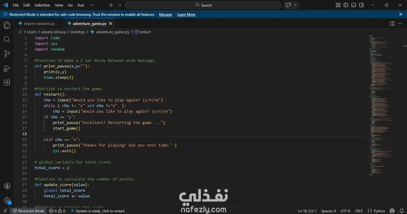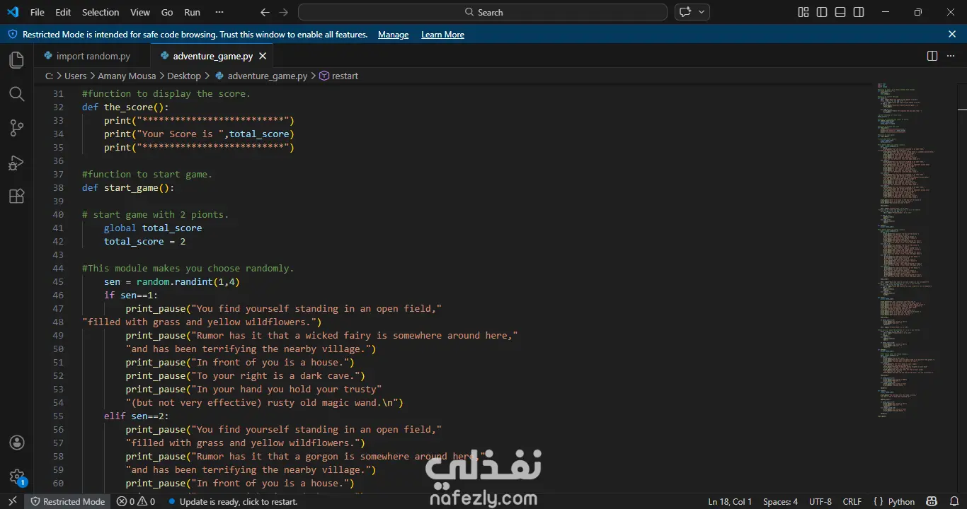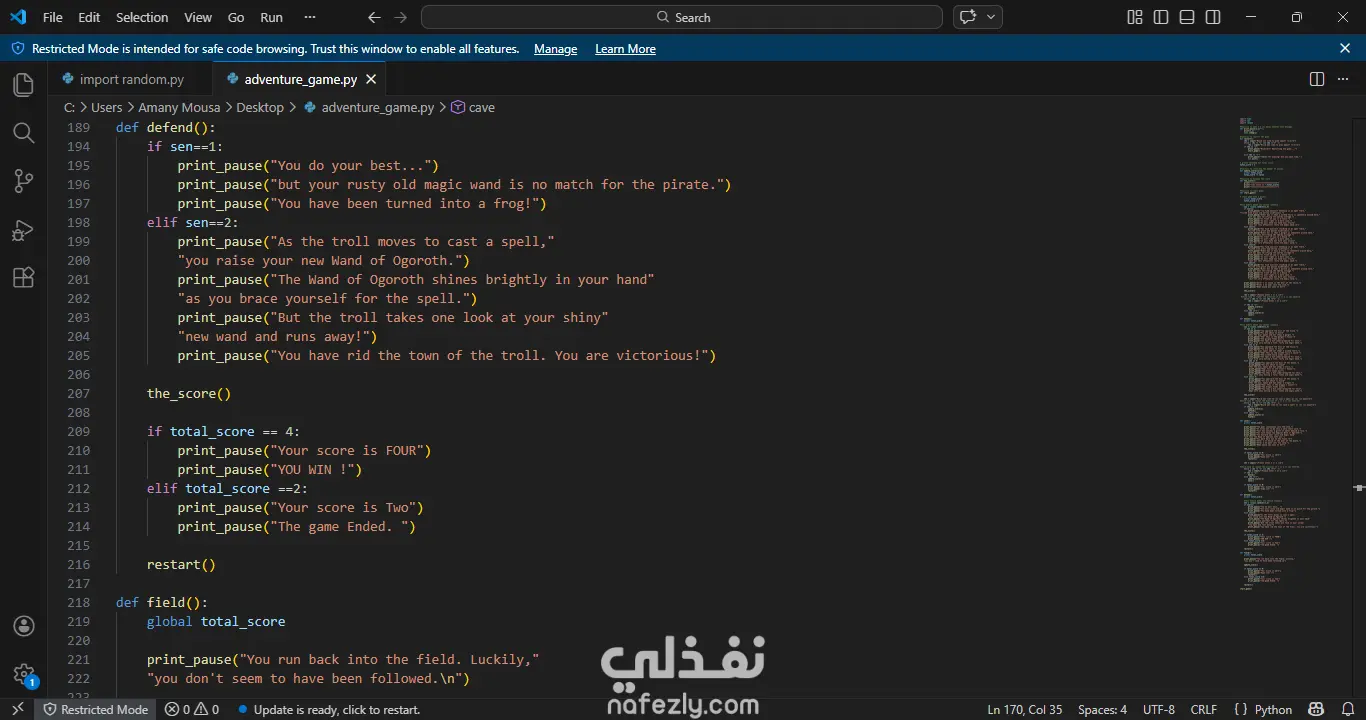 اسم المشروع: Adventure Game Using Python وصف المشروع: قمت بتطوير لعبة تفاعلية باستخدام لغة Python تعمل من خلال سطر الأوامر (CLI)، حيث يعيش المستخدم مغامرة خيالية مليئة بالاختيارات التي تؤثر على سير اللعبة ونهايتها. تعتمد اللعبة على اتخاذ القرارات (Decision Making) مثل دخول المنزل أو الكهف، ومواجهة أعداء مختلفين مثل (troll – pirate – dragon)، مع نظام نقاط (Score System) يحدد نتيجة اللاعب (فوز أو خسارة). ما يميز المشروع: لعبة تفاعلية تعتمد على اختيارات المستخدم سيناريو عشوائي في كل مرة (Random Events) نظام نقاط (Score System) أكثر من نهاية (Win / Lose) استخدام دوال (Functions) لتنظيم الكود تحسين تجربة المستخدم باستخدام التأخير الزمني (Time Delay) التقنيات المستخدمة: Python Random Time Control Flow (if / while) Functions