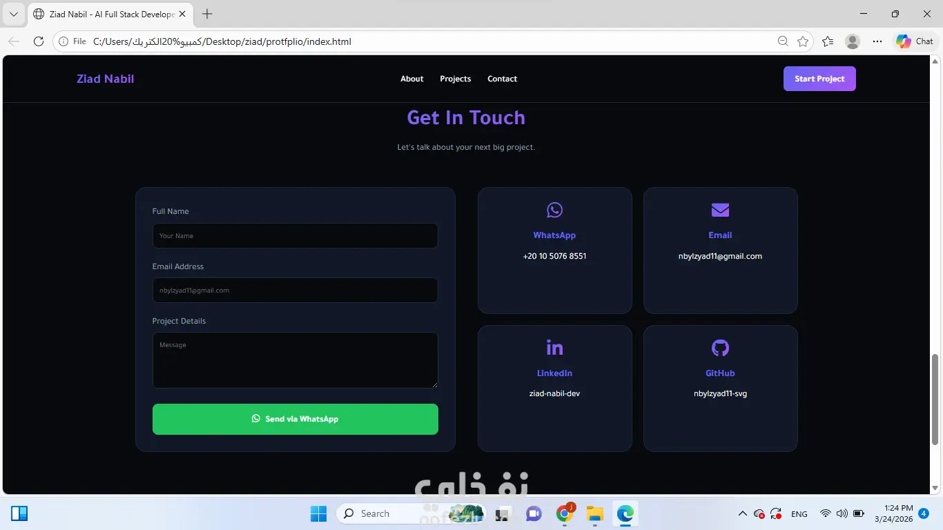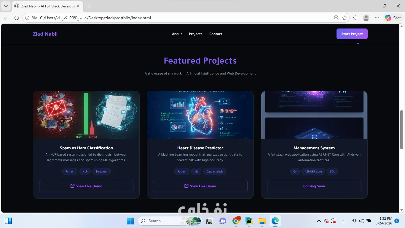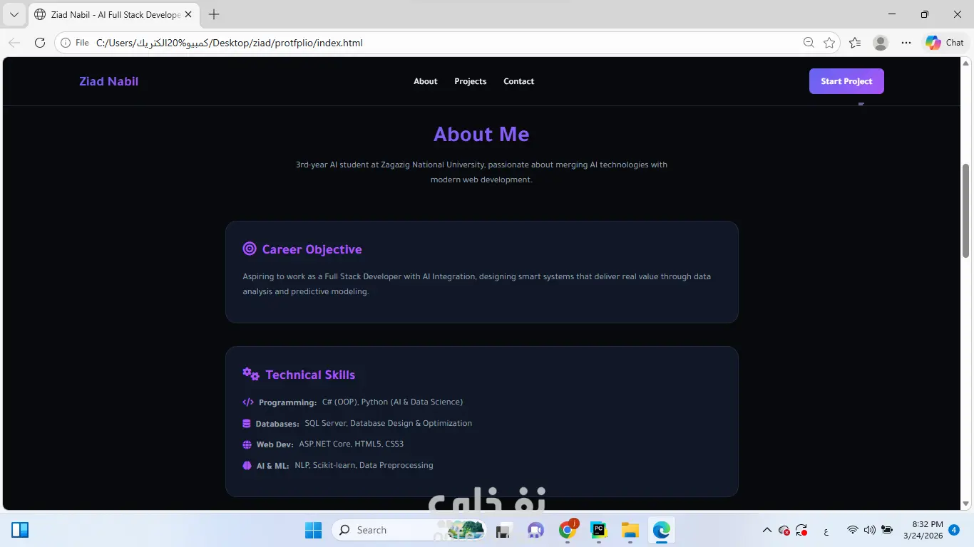 تصميم وتطوير موقع معرض أعمال (Portfolio) احترافي يجمع بين الأداء التقني العالي والتصميم العصري الجذاب، مع التركيز على تجربة المستخدم (UX) لإبراز المهارات والمشاريع بشكل تفاعلي. أبرز مميزات المشروع: تصميم عصري (Dark Mode): واجهة مستخدم مريحة للعين تعتمد على أحدث صيحات التصميم البسيط (Minimalist Design). سرعة الاستجابة (Responsive): الموقع متوافق تماماً مع جميع الشاشات (الهواتف، الأجهزة اللوحية، والحواسيب). تكامل التقنيات: بناء الهيكل البرمجي ليكون سريع التحميل وصديقاً لمحركات البحث (SEO). سهولة التصفح: تنظيم المشاريع والخدمات بشكل يسهل على العميل الوصول للمعلومات الهامة بسرعة.