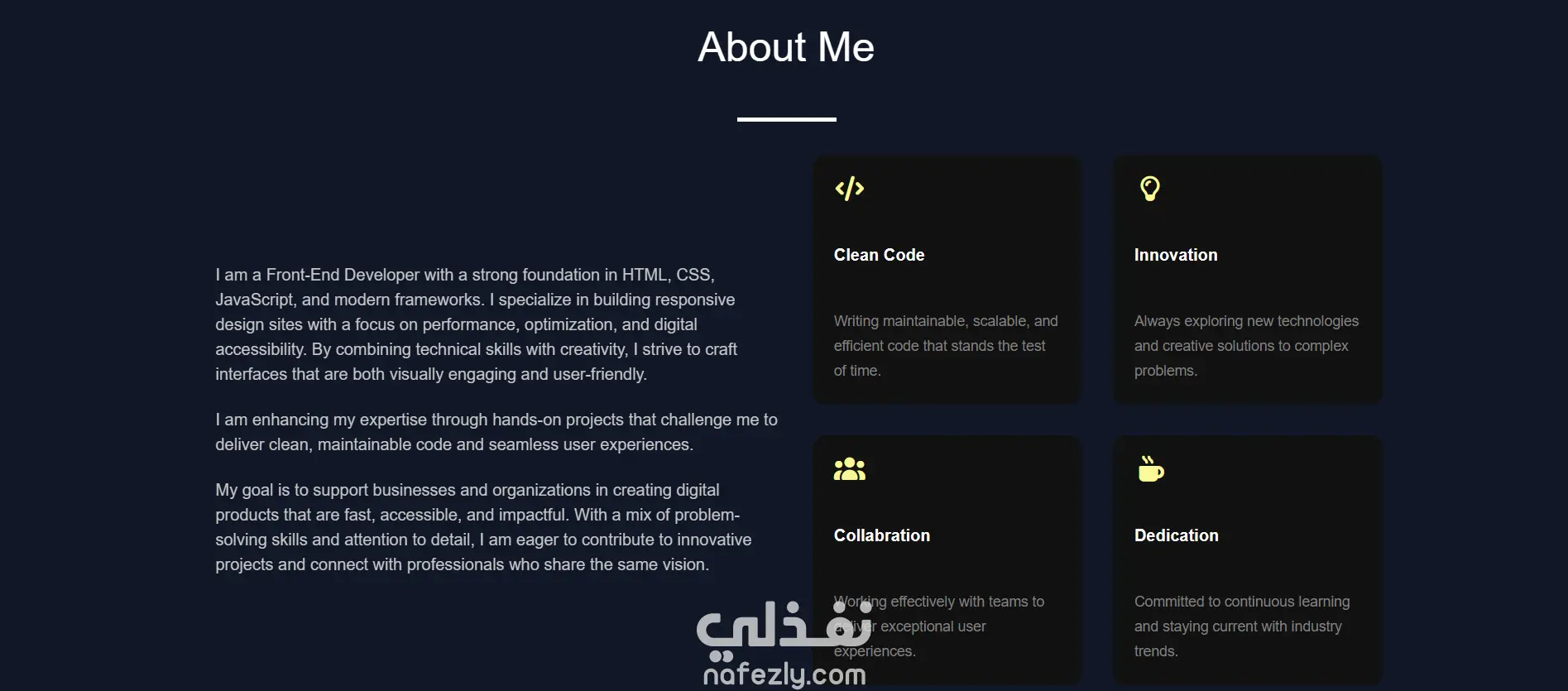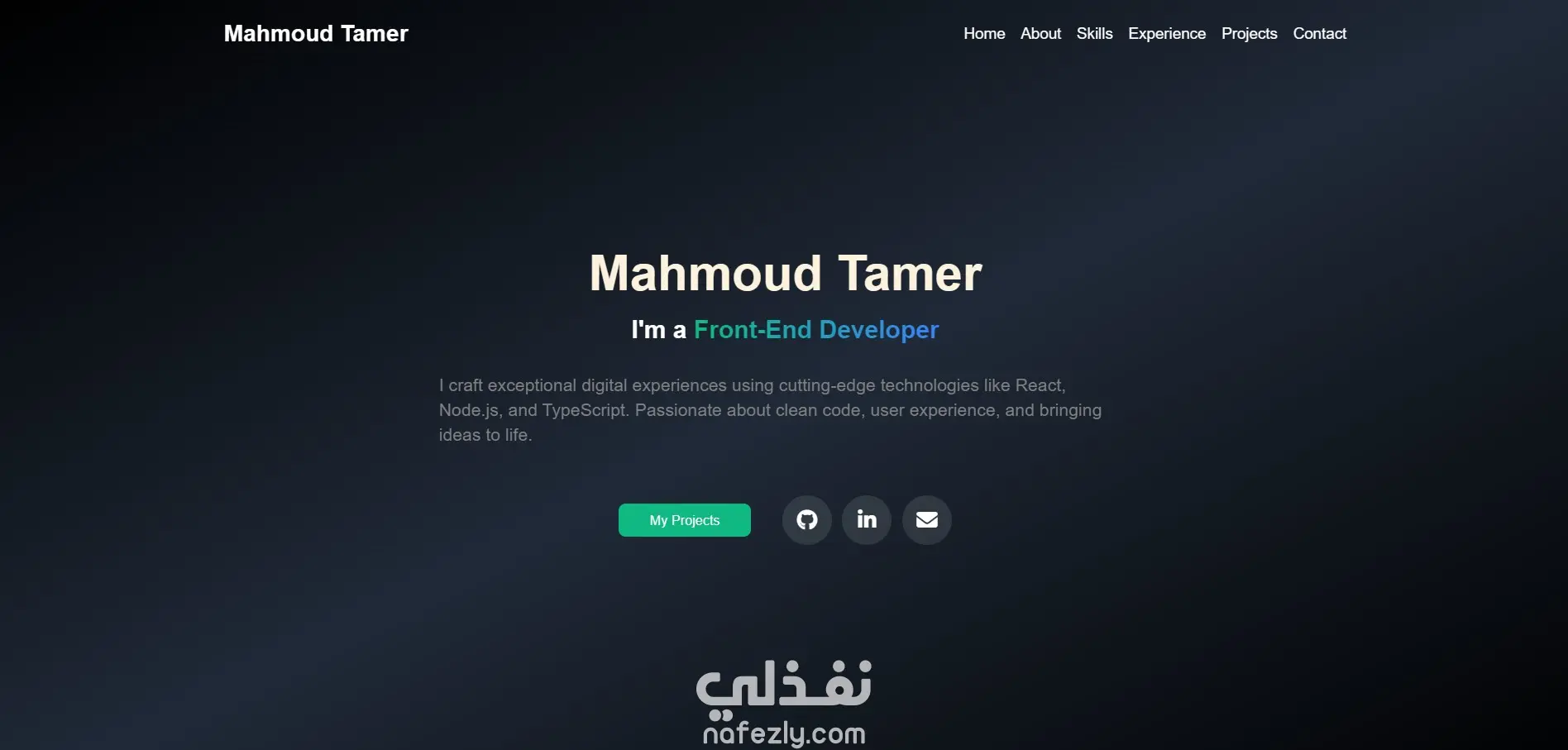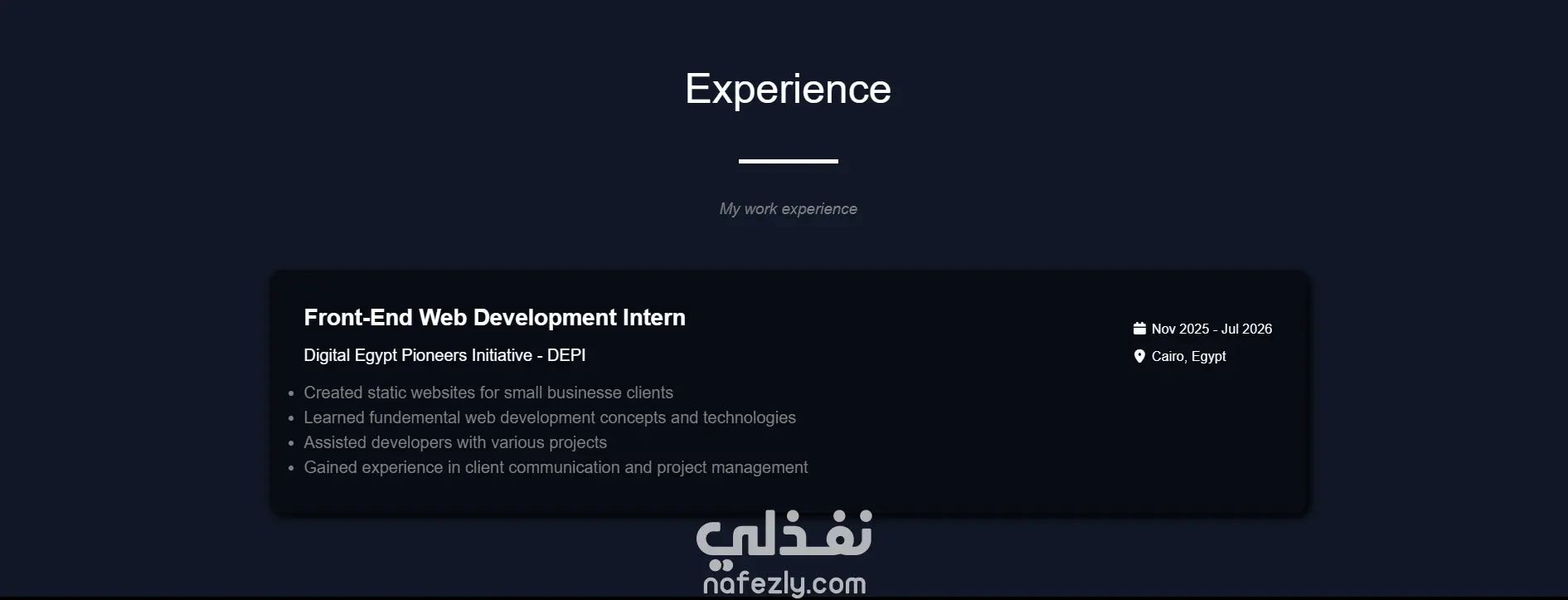 هذا المشروع هو موقع Portfolio شخصي قمت بتصميمه وتطويره لعرض مهاراتي وأعمالي في مجال الـ Front-End Development بشكل احترافي وعصري.