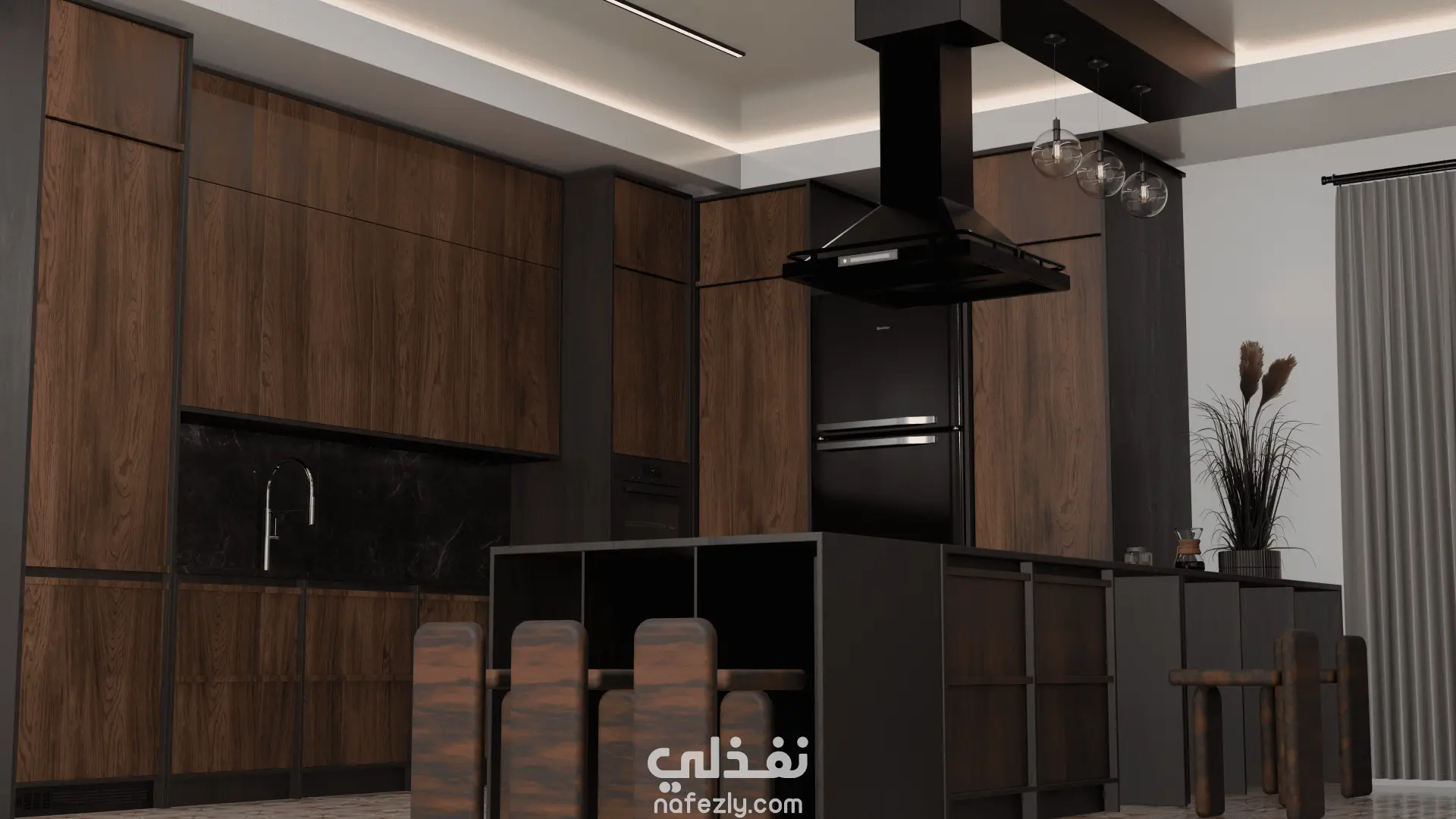 تصميم داخلي 3D لمطبخ 4x4 ) Modern + Industrial ) بالاعتماد على الاثاث المتواجدة لدى الموردين المتعاقدين مع الشركة المنفذة للتصميم قمت بتصميم Modern industrial النتائج المبتغات : خطوط نظيفة ومستقيمة. غياب الزخرفة والتفاصيل المعقدة. توزيع عملي للمساحات. استخدام اللون الأسود بكثرة (الشفاط، الإطار، الأجهزة). خامات داكنة مثل المعدن والخشب. الإضاءة المعلقة البسيطة ذات الطابع الخام. اللون الرئيسي: بني غامق (خشب طبيعي أو مقلد) ألوان داعمة: أسود + رمادي + أبيض النتيجة الجمالية: إحساس بالفخامة والدفء في نفس الوقت. توازن بين الظلام (الأسود) والراحة (الخشب). لهدف: خلق تباين بين: خامة دافئة (الخشب) خامة باردة (المعدن/الحجر) توزيع المساحة (Layout) نظام حرف L مع جزيرة وسطية الجزيرة تخدم: تحضير الطعام الجلوس (وجود كراسي عالية) استغلال الجدران بالكامل بالخزائن (Storage Maximization)