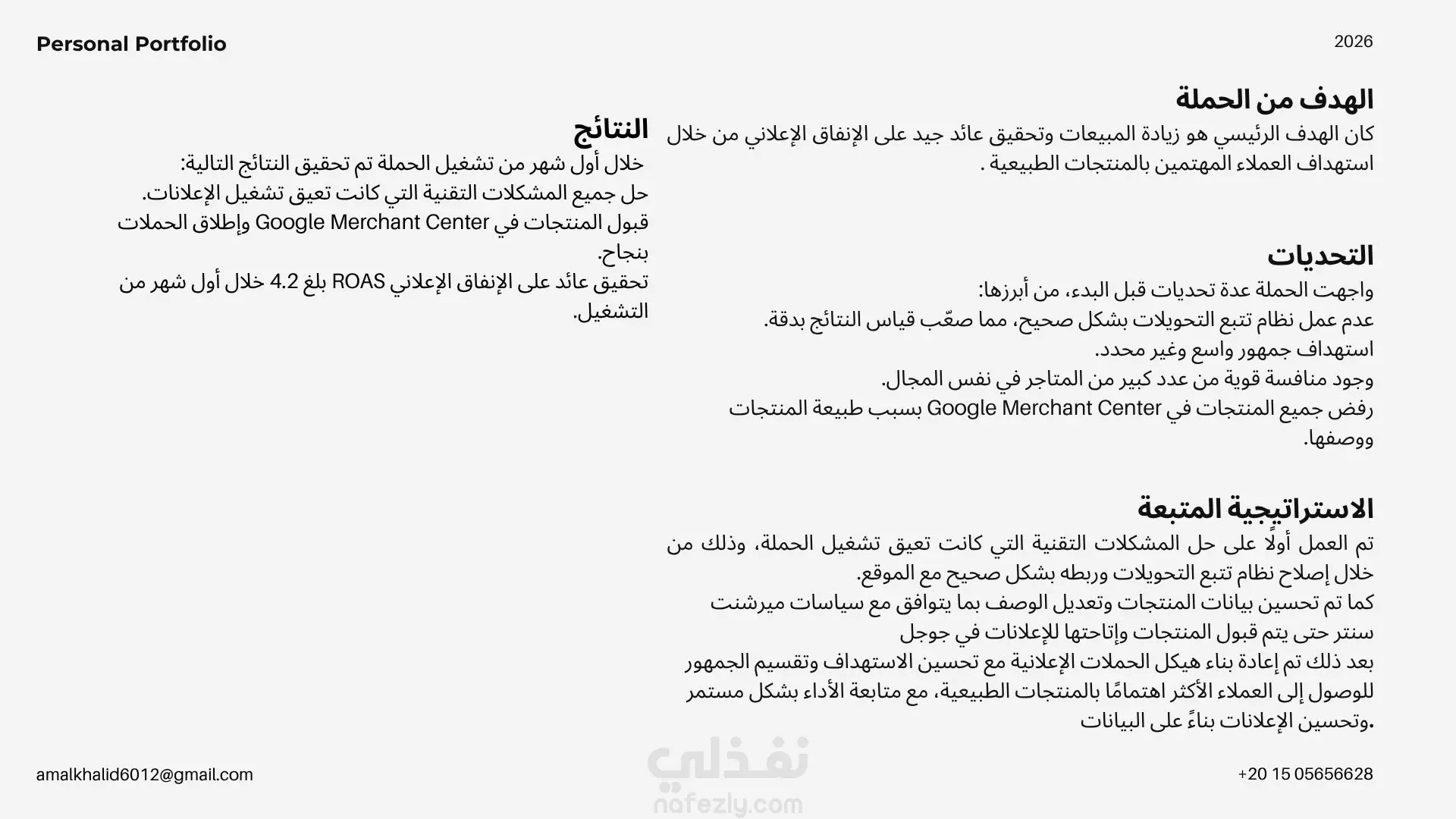 الهدف من الحملة كان الهدف الرئيسي هو زيادة المبيعات وتحقيق عائد جيد على الإنفاق الإعلاني من خلال استهداف العملاء المهتمين بالمنتجات الطبيعية . التحديات واجهت الحملة عدة تحديات قبل البدء، من أبرزها: عدم عمل نظام تتبع التحويلات بشكل صحيح، مما صعّب قياس النتائج بدقة. استهداف جمهور واسع وغير محدد. وجود منافسة قوية من عدد كبير من المتاجر في نفس المجال. رفض جميع المنتجات في Google Merchant Center بسبب طبيعة المنتجات ووصفها. الاستراتيجية المتبعة تم العمل أولًا على حل المشكلات التقنية التي كانت تعيق تشغيل الحملة، وذلك من خلال إصلاح نظام تتبع التحويلات وربطه بشكل صحيح مع الموقع. كما تم تحسين بيانات المنتجات وتعديل الوصف بما يتوافق مع سياسات ميرشنت سنتر حتى يتم قبول المنتجات وإتاحتها للإعلانات في جوجل بعد ذلك تم إعادة بناء هيكل الحملات الإعلانية مع تحسين الاستهداف وتقسيم الجمهور للوصول إلى العملاء الأكثر اهتمامًا بالمنتجات الطبيعية، مع متابعة الأداء بشكل مستمر وتحسين الإعلانات بناءً على البيانات. النتائج خلال أول شهر من تشغيل الحملة تم تحقيق النتائج التالية: حل جميع المشكلات التقنية التي كانت تعيق تشغيل الإعلانات. قبول المنتجات في Google Merchant Center وإطلاق الحملات بنجاح. تحقيق عائد على الإنفاق الإعلاني ROAS بلغ 4.2 خلال أول شهر من التشغيل.