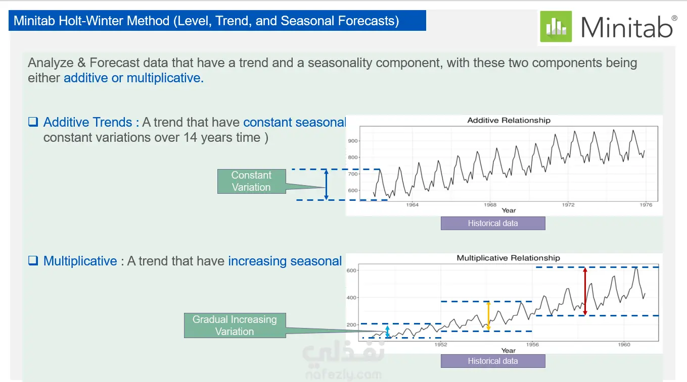 عمل محاكاة لمؤشر الأداء الخاص بالمبيعات و عمل توقع predictive Forecast للأداء البيعي للسنين القادمة بناءا علي السلوك البياني لمؤشر الأداء للسنين السابقة باستخدام ميني تاب Minitab .
