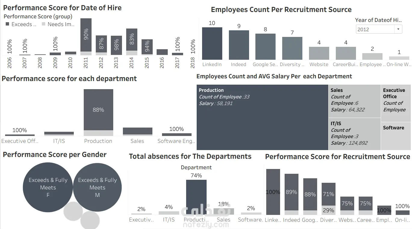 في هذا المشروع، قمت بتصميم لوحة تحكم تفاعلية وشاملة لتحليل بيانات الموارد البشرية باستخدام أداة Tableau. يهدف المشروع إلى تزويد الإدارة برؤية واضحة ودقيقة حول أداء القوى العاملة وسلوكيات التوظيف والغياب لاتخاذ قرارات استراتيجية مبنية على البيانات.