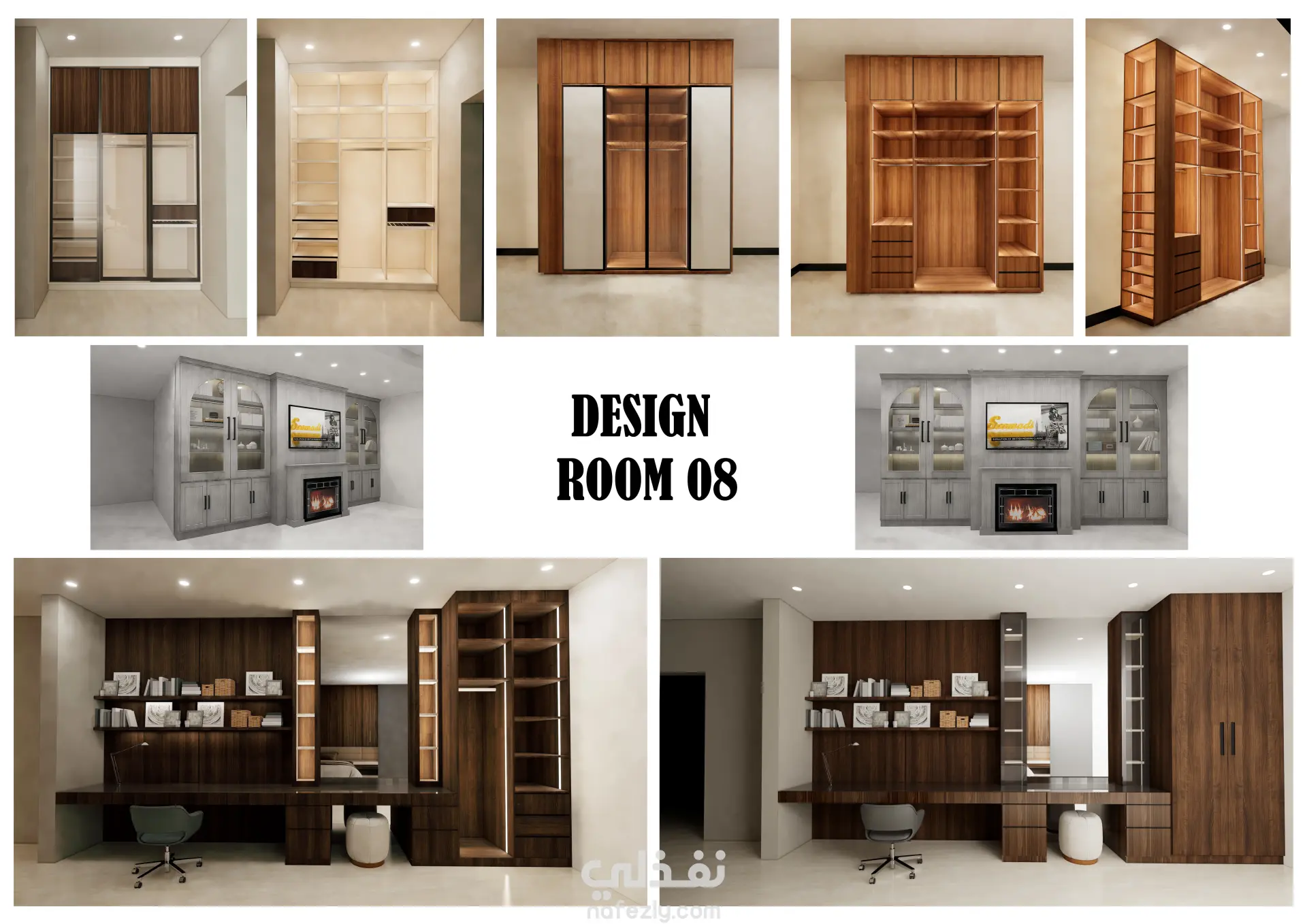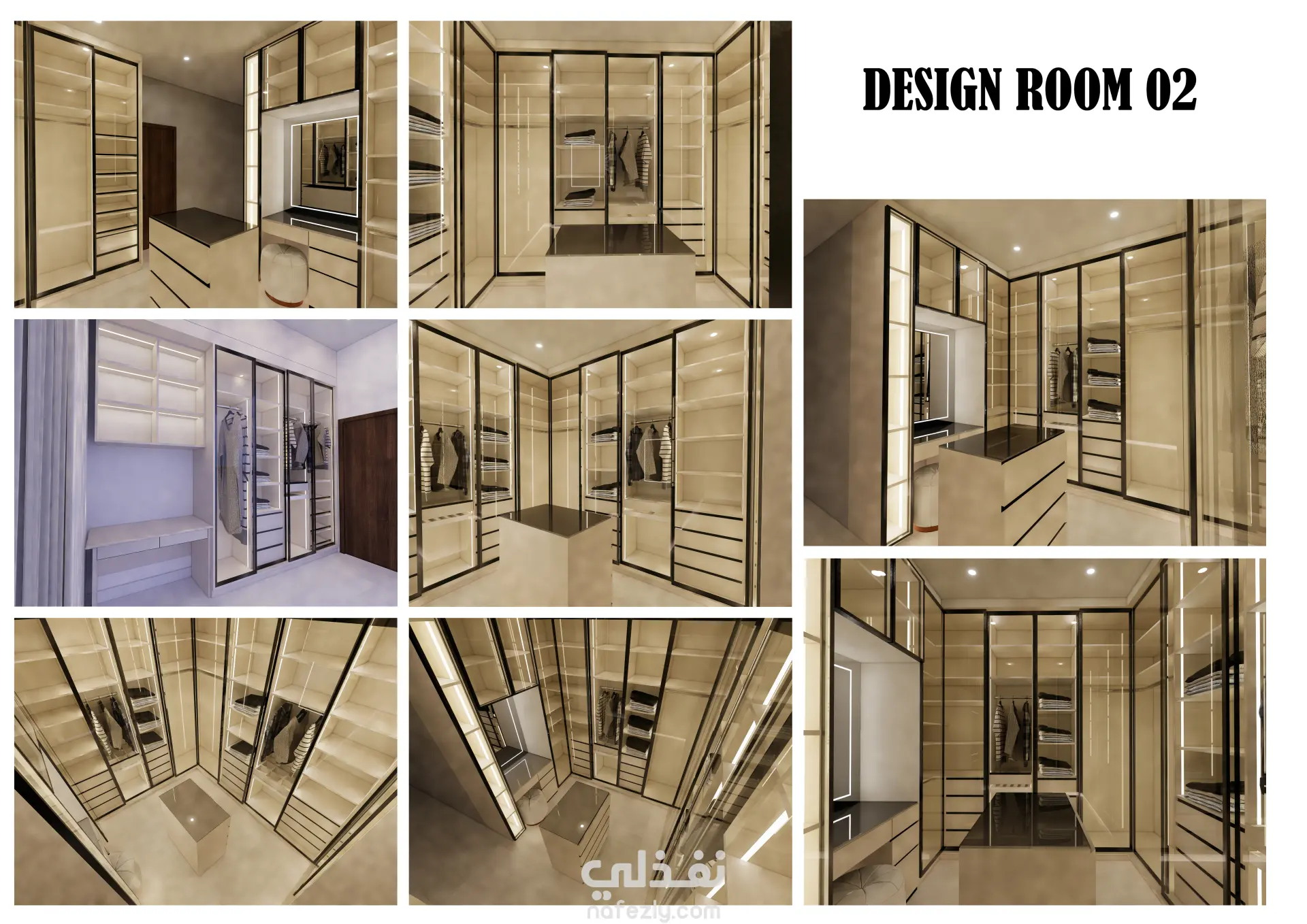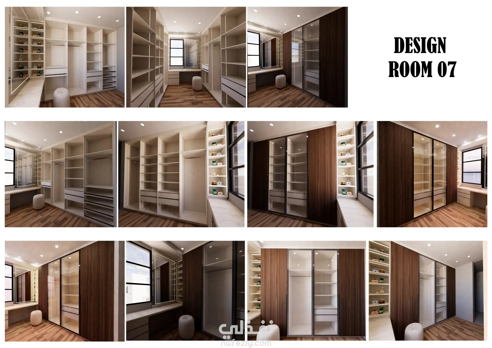 يركز هذا العمل على تحويل المساحات السكنية إلى فراغات ذكية تجمع بين الأناقة الفندقية والوظيفية العالية، مع تخصص بارز في النقاط التالية: 1. تصميم غرف الملابس المبتكرة (Bespoke Walk-in Closets): القدرة على تصميم خزائن ملابس متكاملة (من الحائط إلى الحائط ومن الأرض إلى السقف) لتعظيم مساحة التخزين. الدمج بين الخزائن المفتوحة (Open Shelving) والخزائن ذات الأبواب الزجاجية بإطارات الألومنيوم السوداء، مما يعطي إحساساً بالاتساع والرقي (كما في Room 06 و Room 11). 2. الإضاءة الديكورية والوظيفية (Integrated Lighting): مهارة عالية في توزيع إضاءة الـ LED Strips داخل الأرفف وبجوار الملابس، مما يسهل الاستخدام اليومي ويضيف لمسة جمالية "لوجستية" للمكان. تصميم مرايا التزيين (Vanity Mirrors) بإضاءات خلفية أو إطارات مضيئة مدمجة (كما في Room 12 و Room 14). 3. استغلال المساحات الصعبة (Space Optimization): تصميم وحدات "الكومودينو" المعلقة ومكاتب الدراسة/العمل المدمجة مع مكتبات التلفزيون (كما في Room 05 و Room 10). توفير حلول ذكية للغرف الصغيرة عبر دمج منطقة الملابس مع منطقة النوم أو مناطق الجلوس بشكل انسيابي. 4. اختيار الخامات والمواد (Material Palettes): التنوع في استخدام القشور الخشبية (الماهوجني، الجوز، السنديان) ومزجها مع الأسطح الرخامية أو الزجاجية. إظهار تباين لوني مدروس بين الألوان المحايدة (بيج، رمادي فاتح) وبين الأخشاب الدافئة أو العناصر السوداء المعاصرة. 5. التصميم الهادف للمستخدم (User-Centric Design): نلاحظ في Room 10 تصميم غرفة شبابية تحمل طابعاً خاصاً (Posters لأبطال خارقين) مع دمج منطقة دراسة ومنطقة ترفيه وتخزين في جدار واحد، مما يعكس قدرتك على تلبية متطلبات العميل الشخصية. الأدوات والتقنيات المستخدمة في هذه المشاريع: AutoCAD: لعمل المخططات التنفيذية وتوزيع الأرفف بدقة مليمترية. SketchUp: لبناء تفاصيل الأثاث المدمج (Joinery) وتوضيح كيفية تداخل الكتل. Enscape: لإخراج هذه الرؤية بأسلوب واقعي يوضح انعكاس الإضاءة على الأسطح الخشبية والزجاجية.