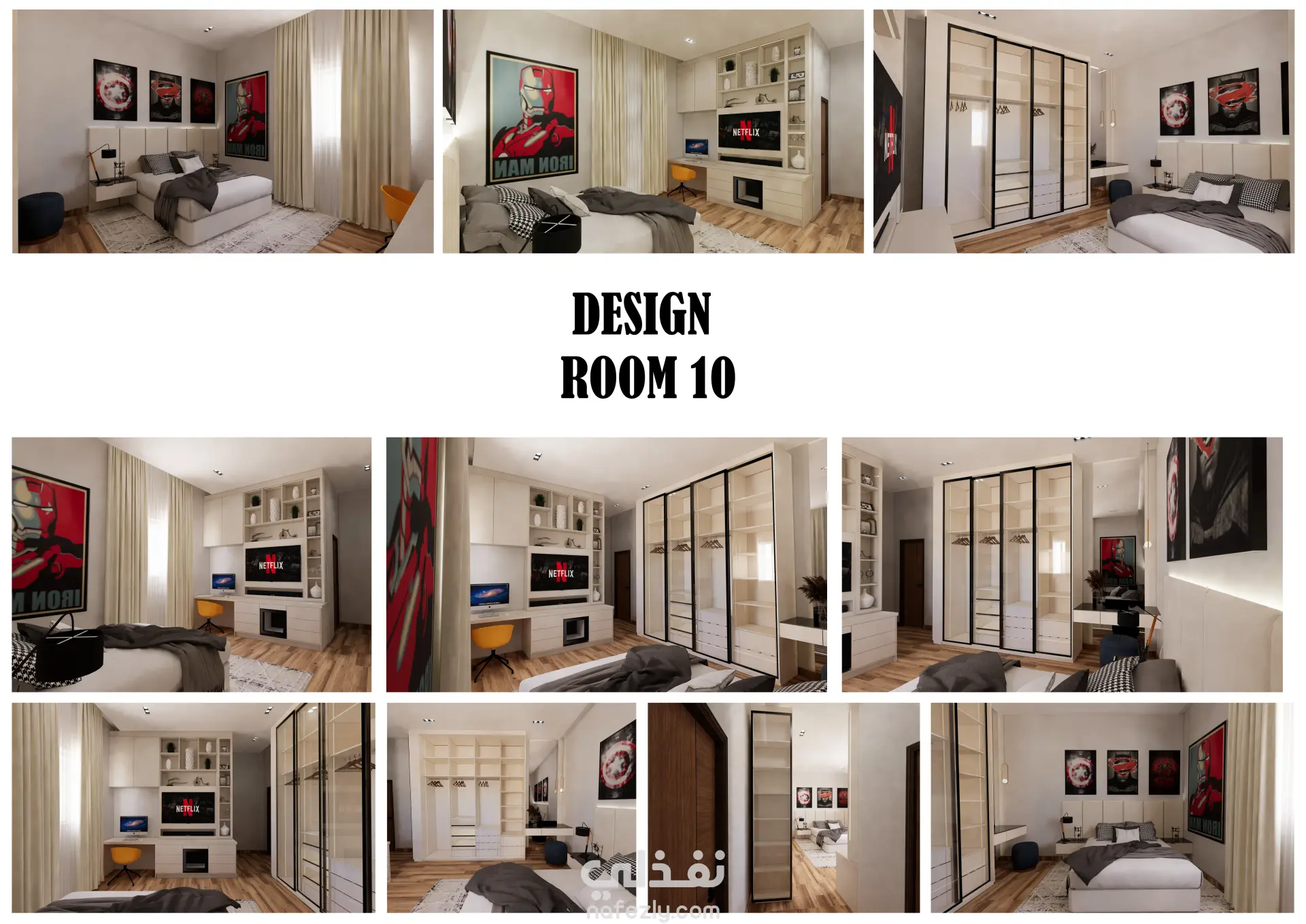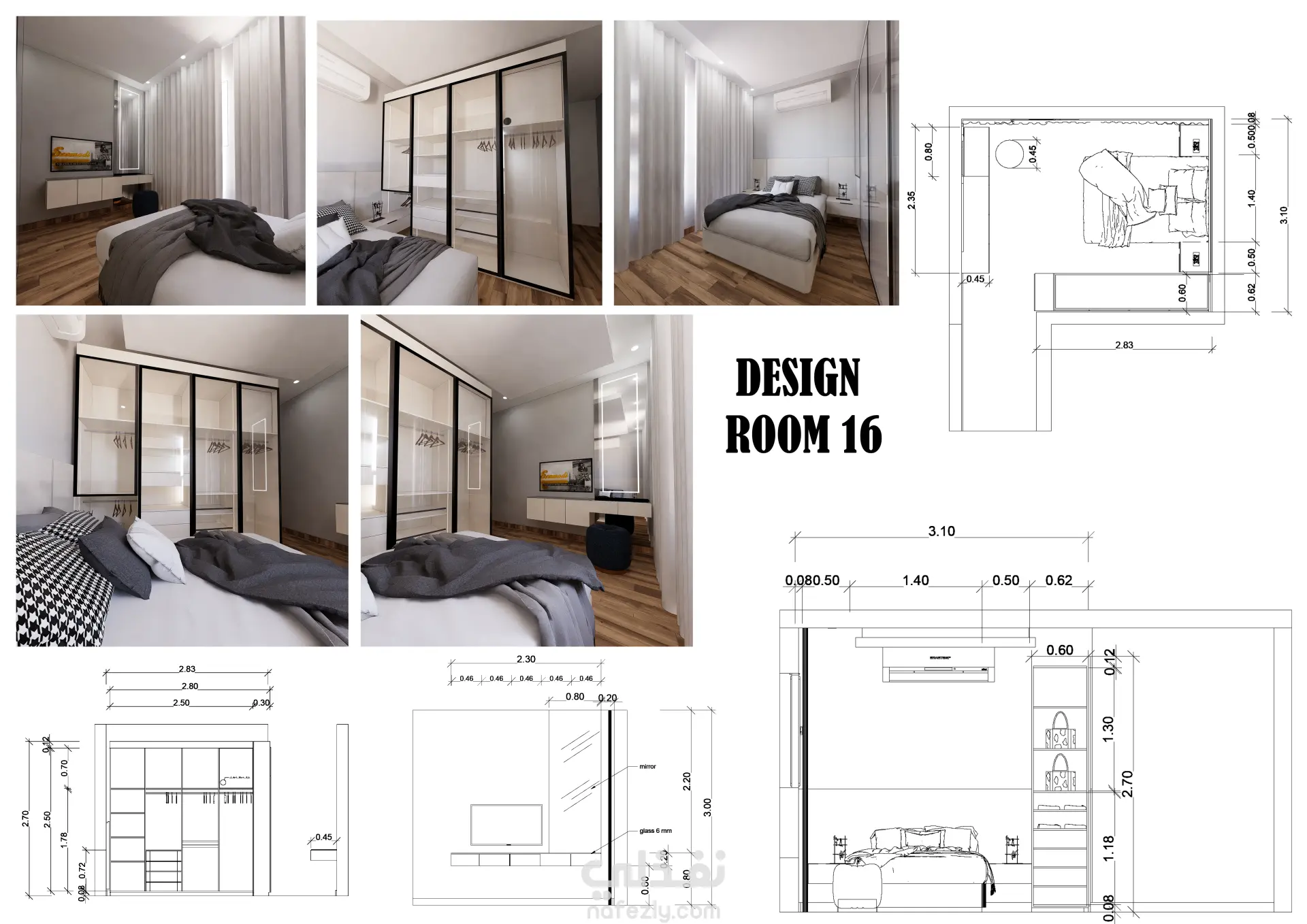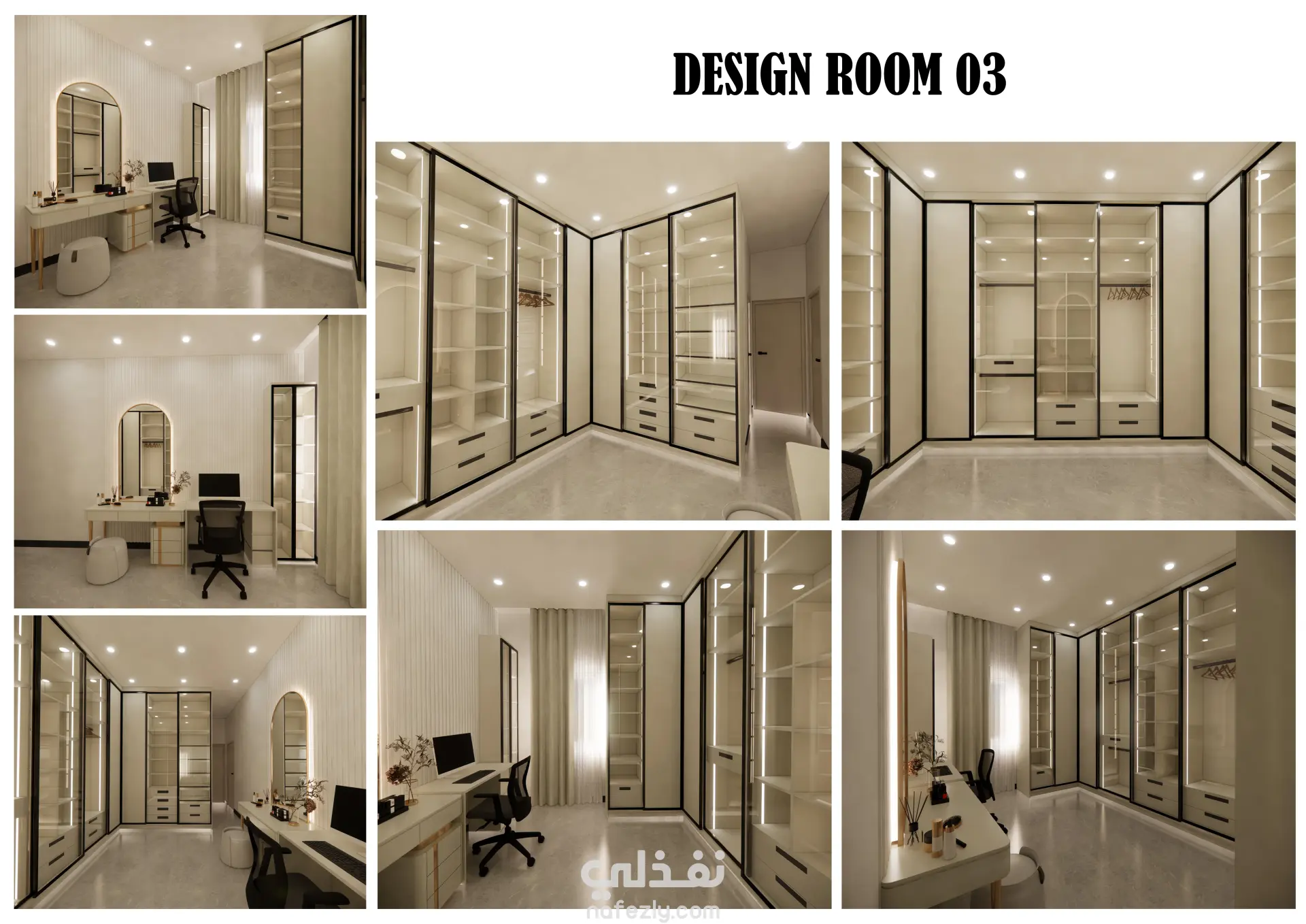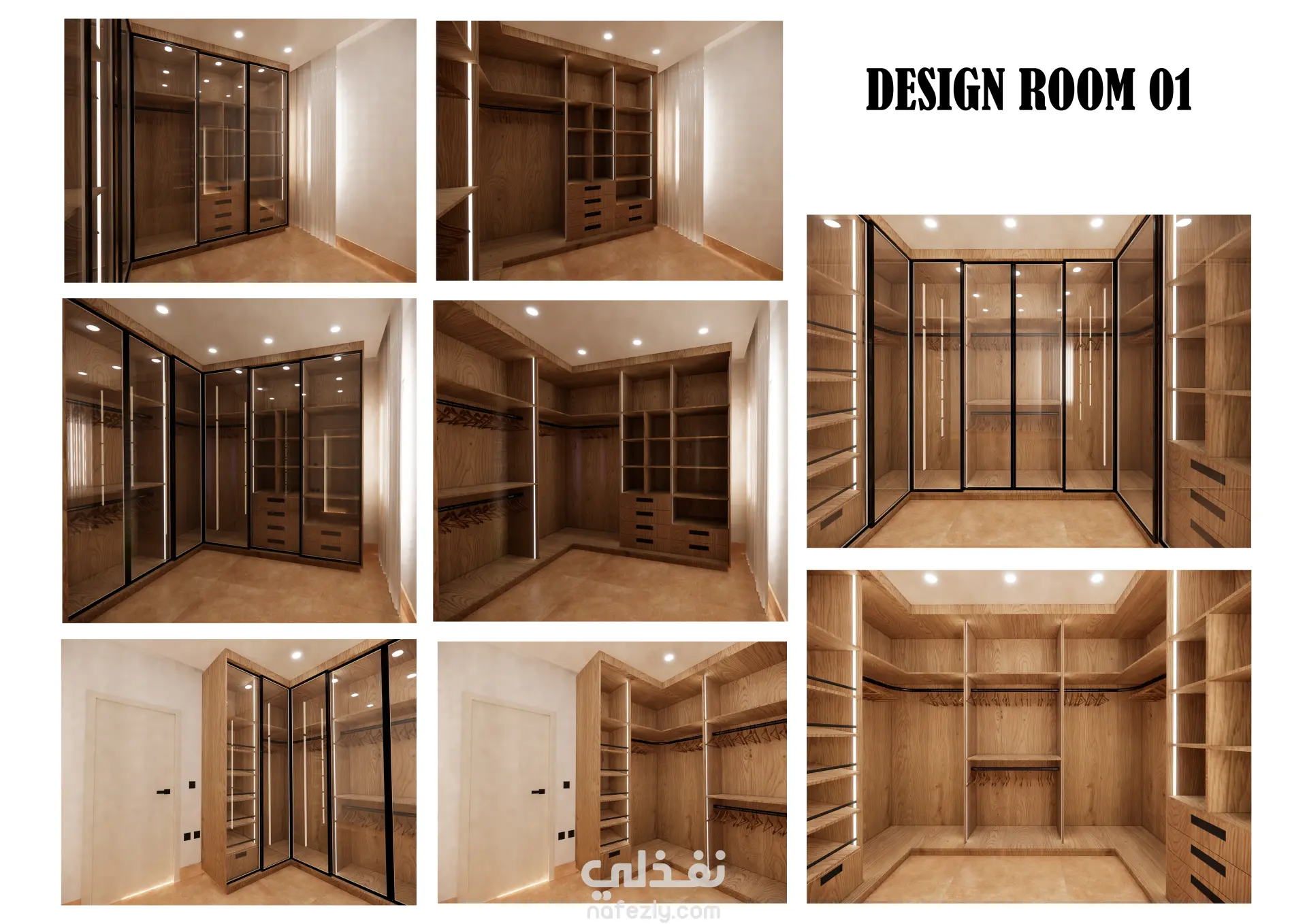يركز هذا العمل على تحويل المساحات السكنية إلى فراغات ذكية تجمع بين الأناقة الفندقية والوظيفية العالية، مع تخصص بارز في النقاط التالية: 1. تصميم غرف الملابس المبتكرة (Bespoke Walk-in Closets): القدرة على تصميم خزائن ملابس متكاملة (من الحائط إلى الحائط ومن الأرض إلى السقف) لتعظيم مساحة التخزين. الدمج بين الخزائن المفتوحة (Open Shelving) والخزائن ذات الأبواب الزجاجية بإطارات الألومنيوم السوداء، مما يعطي إحساساً بالاتساع والرقي (كما في Room 06 و Room 11). 2. الإضاءة الديكورية والوظيفية (Integrated Lighting): مهارة عالية في توزيع إضاءة الـ LED Strips داخل الأرفف وبجوار الملابس، مما يسهل الاستخدام اليومي ويضيف لمسة جمالية "لوجستية" للمكان. تصميم مرايا التزيين (Vanity Mirrors) بإضاءات خلفية أو إطارات مضيئة مدمجة (كما في Room 12 و Room 14). 3. استغلال المساحات الصعبة (Space Optimization): تصميم وحدات "الكومودينو" المعلقة ومكاتب الدراسة/العمل المدمجة مع مكتبات التلفزيون (كما في Room 05 و Room 10). توفير حلول ذكية للغرف الصغيرة عبر دمج منطقة الملابس مع منطقة النوم أو مناطق الجلوس بشكل انسيابي. 4. اختيار الخامات والمواد (Material Palettes): التنوع في استخدام القشور الخشبية (الماهوجني، الجوز، السنديان) ومزجها مع الأسطح الرخامية أو الزجاجية. إظهار تباين لوني مدروس بين الألوان المحايدة (بيج، رمادي فاتح) وبين الأخشاب الدافئة أو العناصر السوداء المعاصرة. 5. التصميم الهادف للمستخدم (User-Centric Design): نلاحظ في Room 10 تصميم غرفة شبابية تحمل طابعاً خاصاً (Posters لأبطال خارقين) مع دمج منطقة دراسة ومنطقة ترفيه وتخزين في جدار واحد، مما يعكس قدرتك على تلبية متطلبات العميل الشخصية. الأدوات والتقنيات المستخدمة في هذه المشاريع: AutoCAD: لعمل المخططات التنفيذية وتوزيع الأرفف بدقة مليمترية. SketchUp: لبناء تفاصيل الأثاث المدمج (Joinery) وتوضيح كيفية تداخل الكتل. Enscape: لإخراج هذه الرؤية بأسلوب واقعي يوضح انعكاس الإضاءة على الأسطح الخشبية والزجاجية.