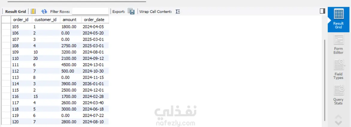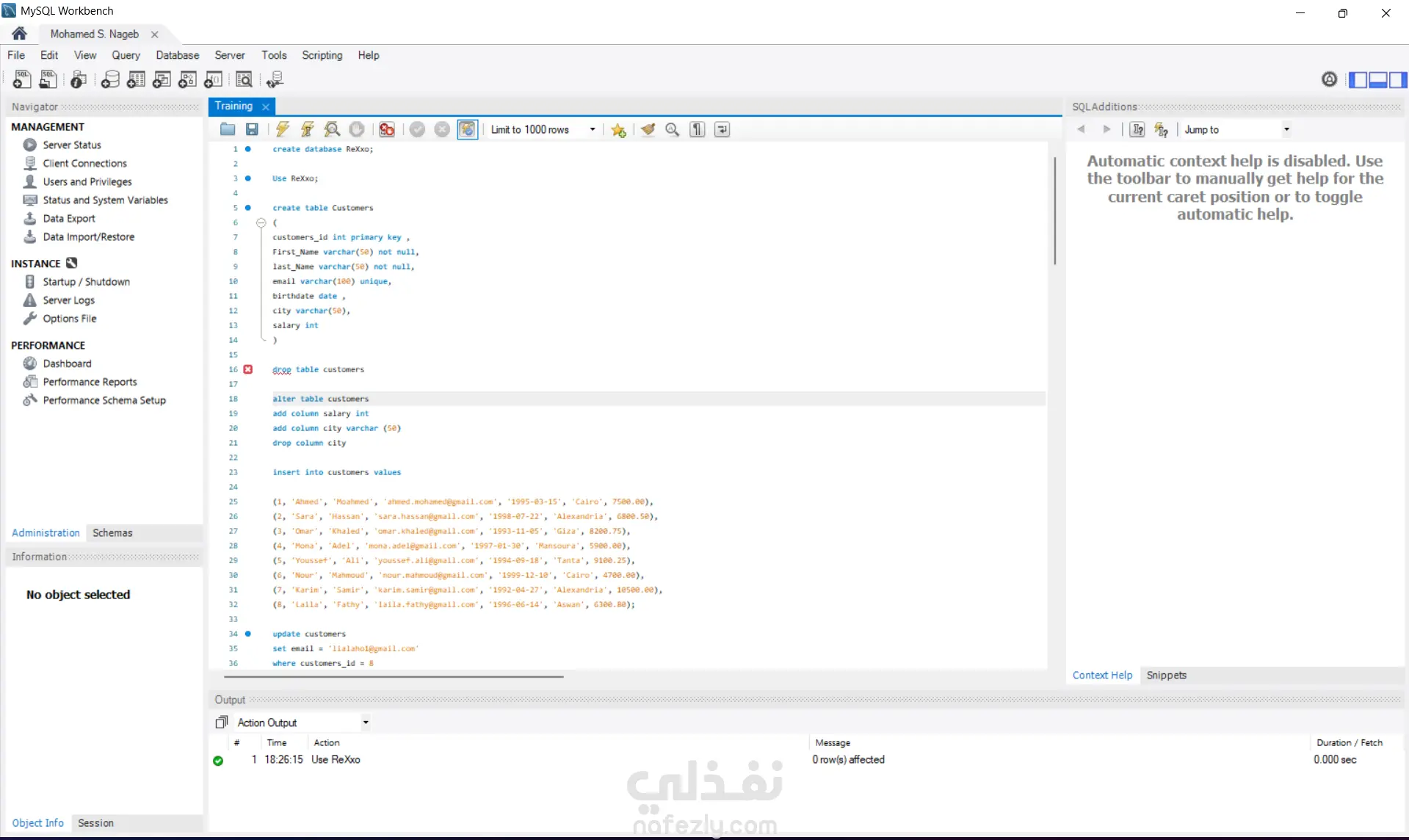 كنت بتدرب على MySQL واشتغلت على مشروع بسيط لإنشاء وإدارة قاعدة بيانات. بدأت بإنشاء Database وجواها Table للعملاء (Customers)، وحددت فيه الأعمدة زي الاسم، الإيميل، تاريخ الميلاد، المدينة والمرتب.
