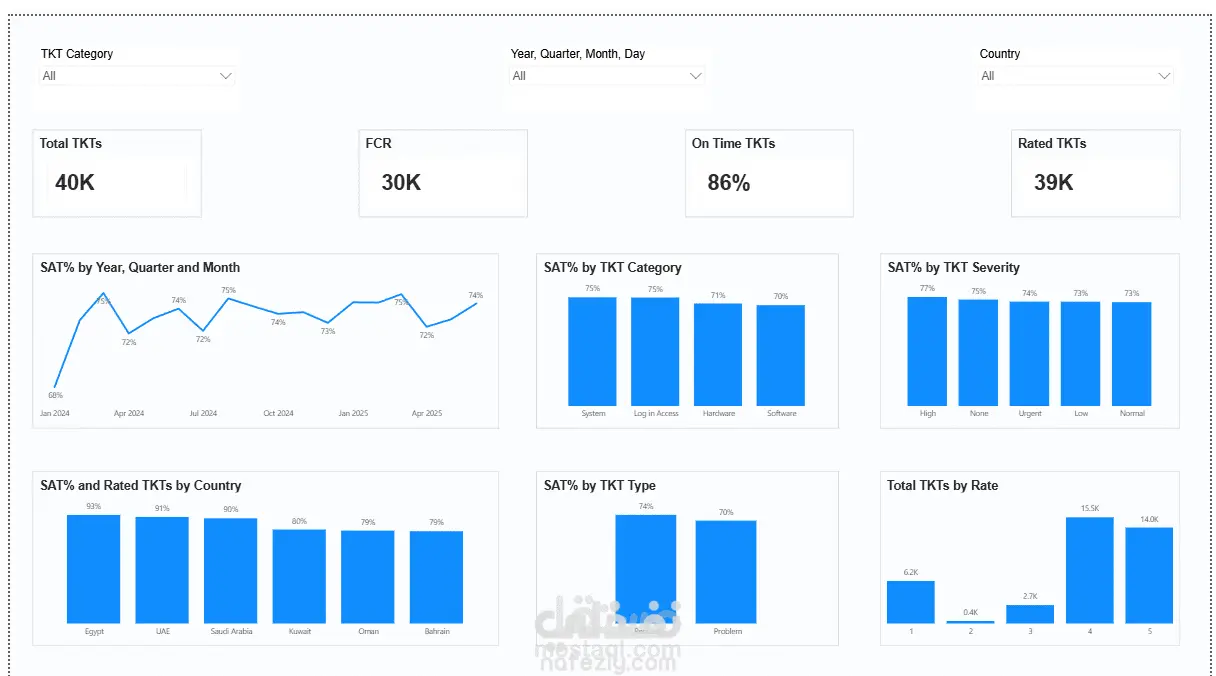 إضافة أدوات تصفية (Slicers) تتيح للمستخدم استعراض البيانات حسب الفترة الزمنية، القسم، أو حالة التذكرة.