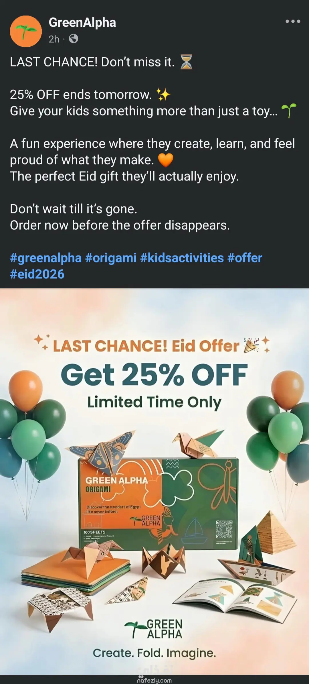 مشروع تصميم إعلان ترويجي متكامل لبراند Green Alpha المتخصص في الأنشطة التعليمية والأوريجامي للأطفال. في هذا المشروع، لم أكتفِ بالتصميم البصري فقط، بل قمت ببناء الحملة من الصفر لتشمل الجانبين الفني والتسويقي: الفكرة الإبداعية و صناعة المحتوى (Copywriting): توليت كتابة "الكابشن" والنصوص الإعلانية الموضحة في التصميم، مع التركيز على صيغة النداء (Call to Action) واختيار عبارات محفزة للشراء لزيادة التفاعل ومعدل التحويل. التنفيذ البصري: الألوان: تم اختيار لوحة ألوان حيوية (الأخضر، البرتقالي، والذهبي) لتعكس روح المغامرة والتعلم. الإخراج الفني: صممت البوستر ليكون مناسباً لعروض "عيد الفطر"، مع إبراز المنتج وتفاصيله (الكتيب، الورق، النماذج المطوية) بشكل واقعي وجذاب. الأدوات المستخدمة: تم التنفيذ بدقة عالية باستخدام Canva و AI tools لضمان جودة بصرية احترافية.