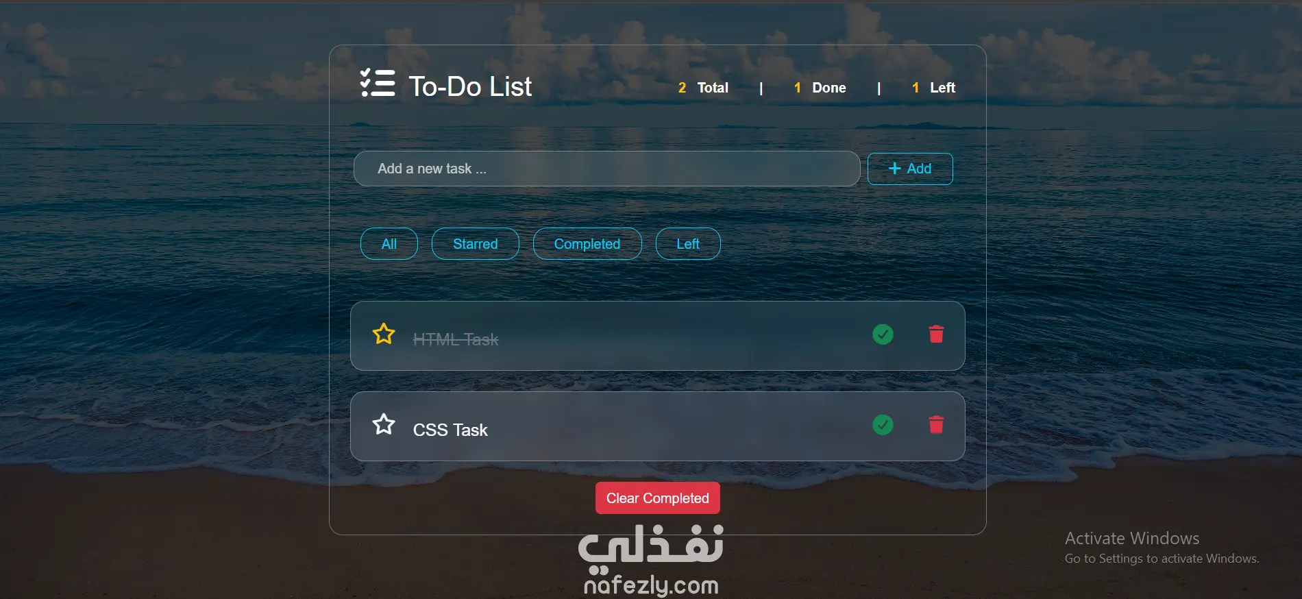 قمت بتطوير تطبيق ويب لإدارة المهام اليومية باستخدام HTML و CSS و JavaScript و Bootstrap. يتيح التطبيق للمستخدم إضافة المهام وتنظيمها بسهولة من خلال واجهة بسيطة وعصرية تساعد على متابعة المهام اليومية بشكل فعال. كما يعتمد المشروع على LocalStorage لحفظ المهام في المتصفح بحيث تبقى محفوظة حتى بعد إعادة تحميل الصفحة. مميزات المشروع إضافة مهام جديدة بسهولة تحديد المهام المكتملة ✔ تمييز المهام المهمة بنجمة ⭐ فلترة المهام (جميع المهام – المهمة – المكتملة – المتبقية) حذف المهام بشكل فردي حذف جميع المهام المكتملة بضغطة واحدة حفظ المهام تلقائيًا باستخدام LocalStorage تصميم متجاوب يعمل على جميع الأجهزة واجهة مستخدم عصرية مع تأثيرات حركية (Animations) التقنيات المستخدمة HTML5 CSS3 JavaScript Bootstrap LocalStorage
