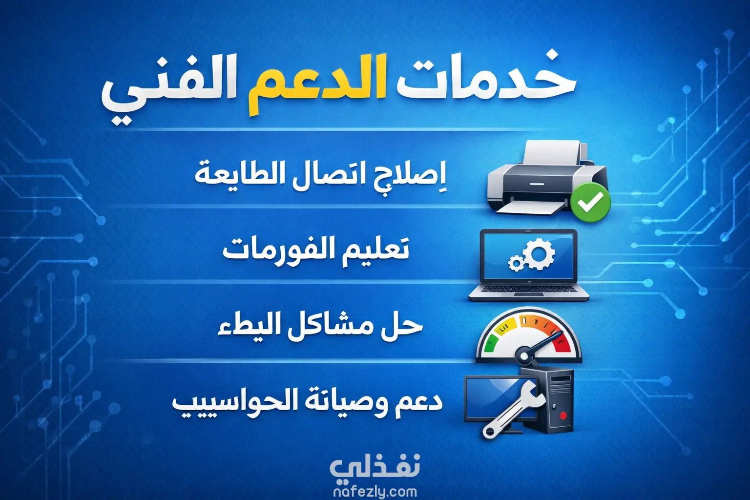 نقدم حلولاً سريعة لمشاكل الكمبيوتر، بما في ذلك إصلاح اتصال الطابعة، تعليم الفورمات، حل مشاكل البطء، وتجاوز الأعطال التقنية.