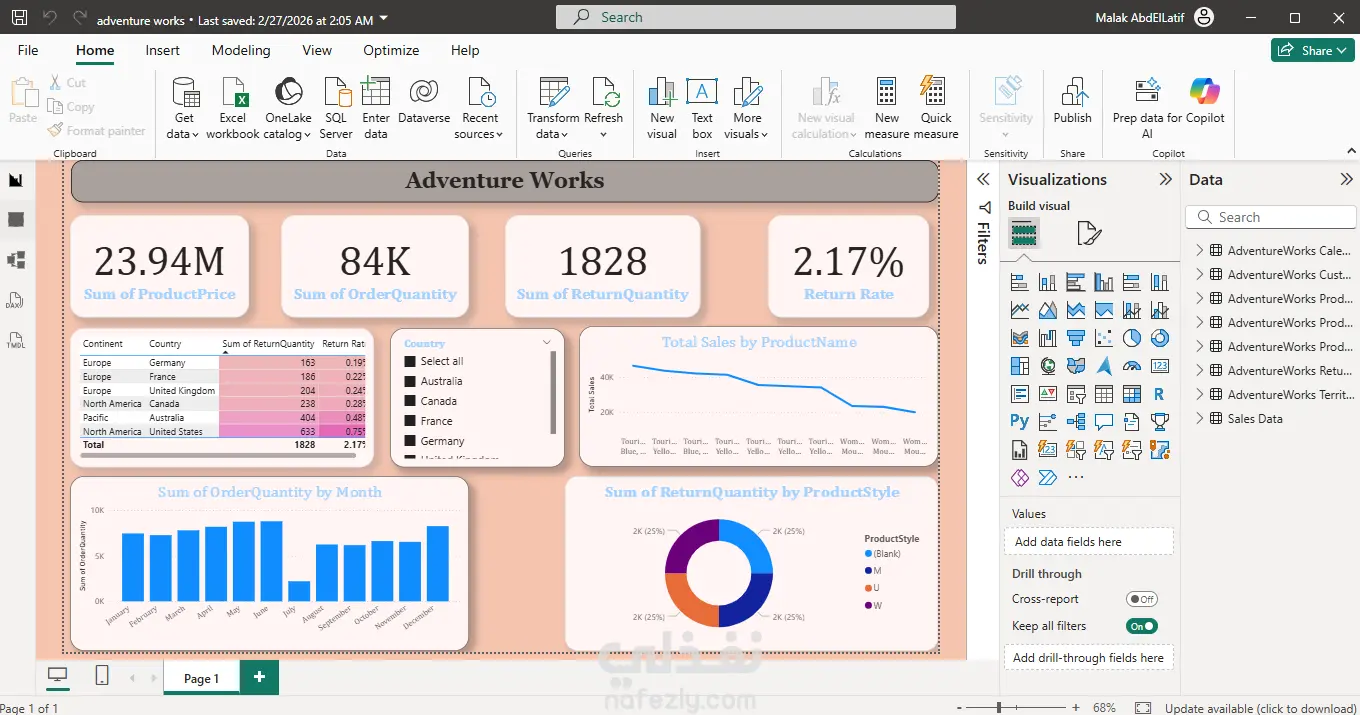 تم تصميم وتطوير لوحة تحكم تفاعلية لتحليل أداء مبيعات شركة Adventure Works، بهدف تتبع إجمالي المبيعات، الكميات المباعة، نسبة الإرجاع، وتوزيع المبيعات حسب المناطق الجغرافية وأنماط المنتجات.