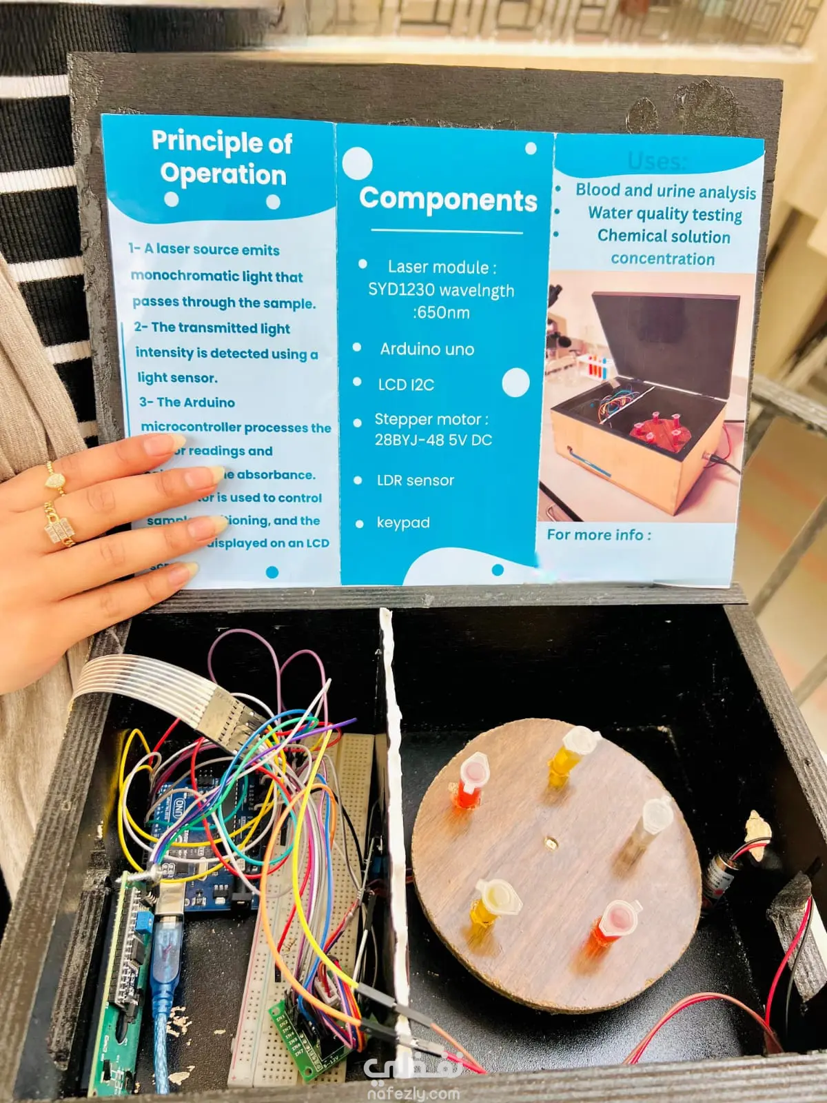 قمت بتنفيذ مشروع عبارة عن جهاز Spectrophotometer منخفض التكلفة باستخدام Arduino، بحيث يعتمد على قياس الامتصاص الضوئي لتحديد تركيز العينات.