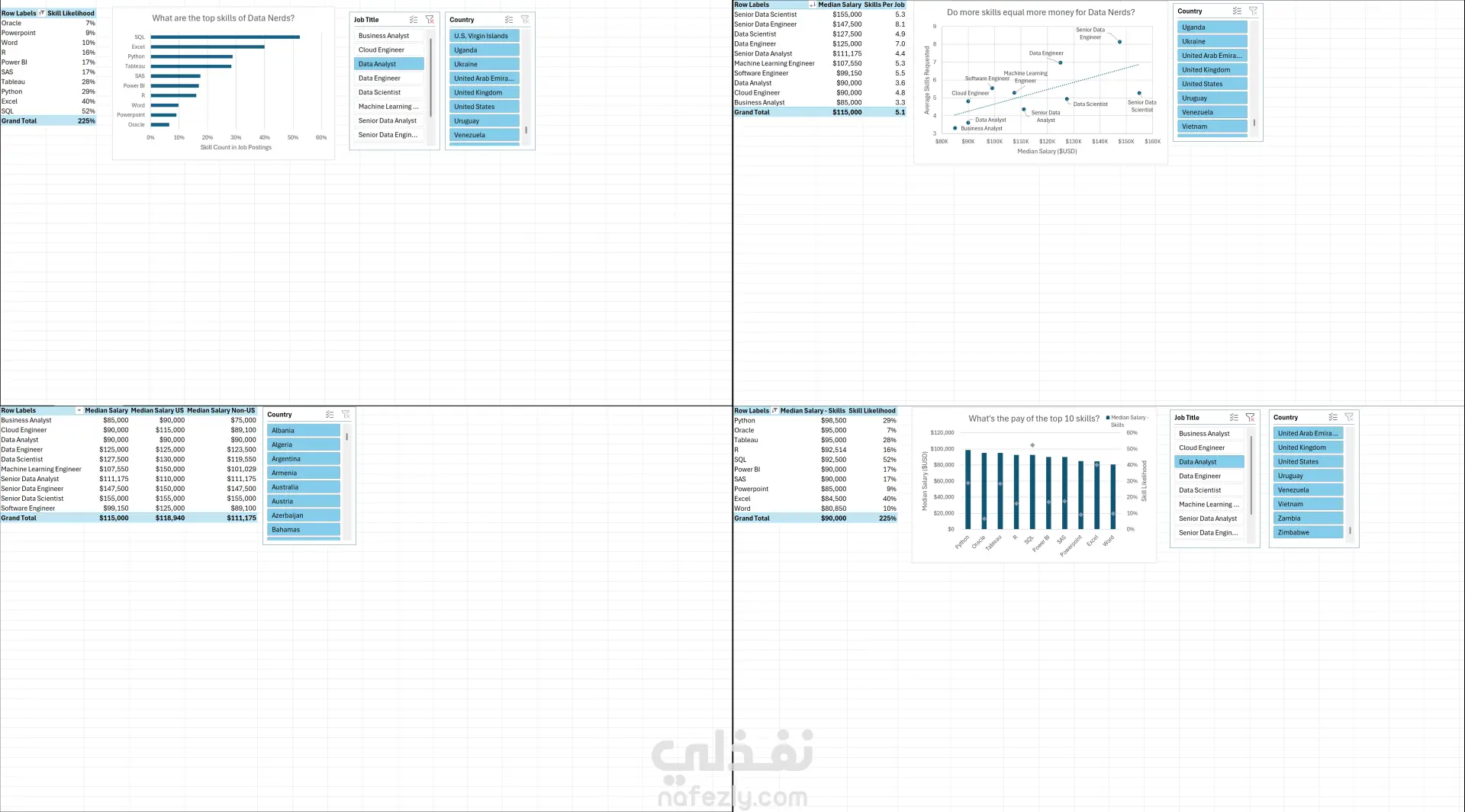 - الهدف: إجراء تحليل كمي (Quantitative Analysis) لسوق عمل علوم البيانات (Data Science Job Market)، وتقييم الارتباط (Correlation) بين المهارات التقنية المحددة (Specific Technical Skills)، والمسميات الوظيفية (Job Titles)، ومتوسط الرواتب (Median Salaries) في الأسواق الأمريكية وغير الأمريكية (US and Non-US Markets). - التنفيذ: تجميع ومعالجة متغيرات مجموعة البيانات (Dataset Parameters Aggregation and Processing) التي تغطي المسميات الوظيفية (Job Titles)، والمواقع الجغرافية (Geographic Locations)، والكفاءات المطلوبة (Required Competencies). حساب المقاييس العلائقية (Relational Metrics)، وتحديداً "احتمالية طلب المهارة" (Skill Likelihood) و"عدد المهارات لكل وظيفة" (Skills Per Job)، لتحديد مدى تعقيد الدور الوظيفي (Role Complexity) وحجم طلب السوق (Market Demand). هندسة مرئيات بيانية (Engineering Data Visualizations) لتقديم رؤية شاملة (Macroscopic View) لمعايير التعويضات المادية (Compensation Benchmarks) وتقييم المهارات (Skill Valuation). -النتائج الرئيسية: التسلسل الهرمي للتعويضات (Compensation Hierarchies): يحصل كبار علماء البيانات (Senior Data Scientists) وكبار مهندسي البيانات (Senior Data Engineers) على أعلى متوسط للرواتب الإجمالية (Highest Overall Median Salaries) بـ 155,000 دولار و 147,500 دولار على التوالي. التباين الجغرافي: تسجل الوظائف القائمة في الولايات المتحدة (US-based Roles) باستمرار متوسط أجور أعلى (Higher Median Compensation) مقارنة بالوظائف خارجها (Non-US Roles) عبر جميع المسميات التي تم تحليلها (Analyzed Titles). تقييم المهارات (Skill Valuation): تحقق لغة بايثون (Python) أعلى متوسط راتب مقترن بمهارة فردية (Highest Median Salary per Individual Skill) بـ 98,500 دولار، على الرغم من أن لغة إس كيو إل (SQL) تُظهر طلباً أعلى بكثير في السوق (Higher Market Demand) باحتمالية 52.3٪ مقابل 28.7٪ لـ Python. التعقيد الوظيفي (Role Complexity): يتطلب دور "كبير مهندسي البيانات" (Senior Data Engineer) أعلى كثافة للمهارات (Highest Skill Density Requirement)، بمتوسط 8.14 مهارة تقنية مختلفة لكل وظيفة (Distinct Skills per Role).