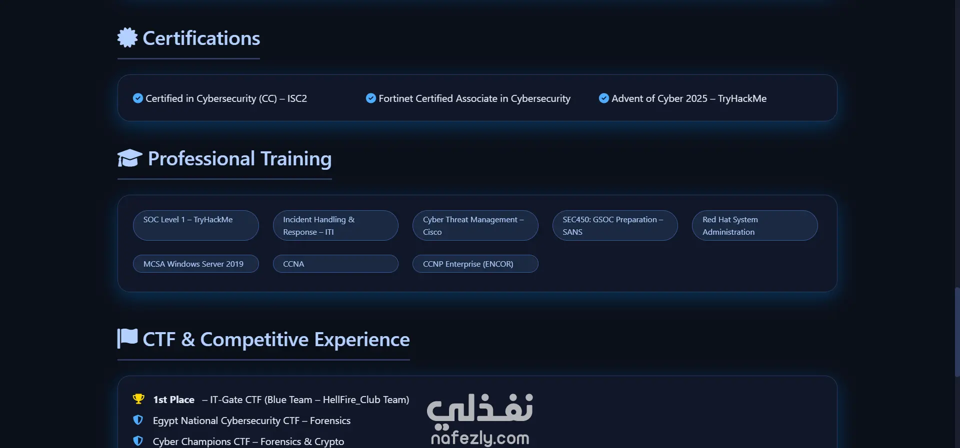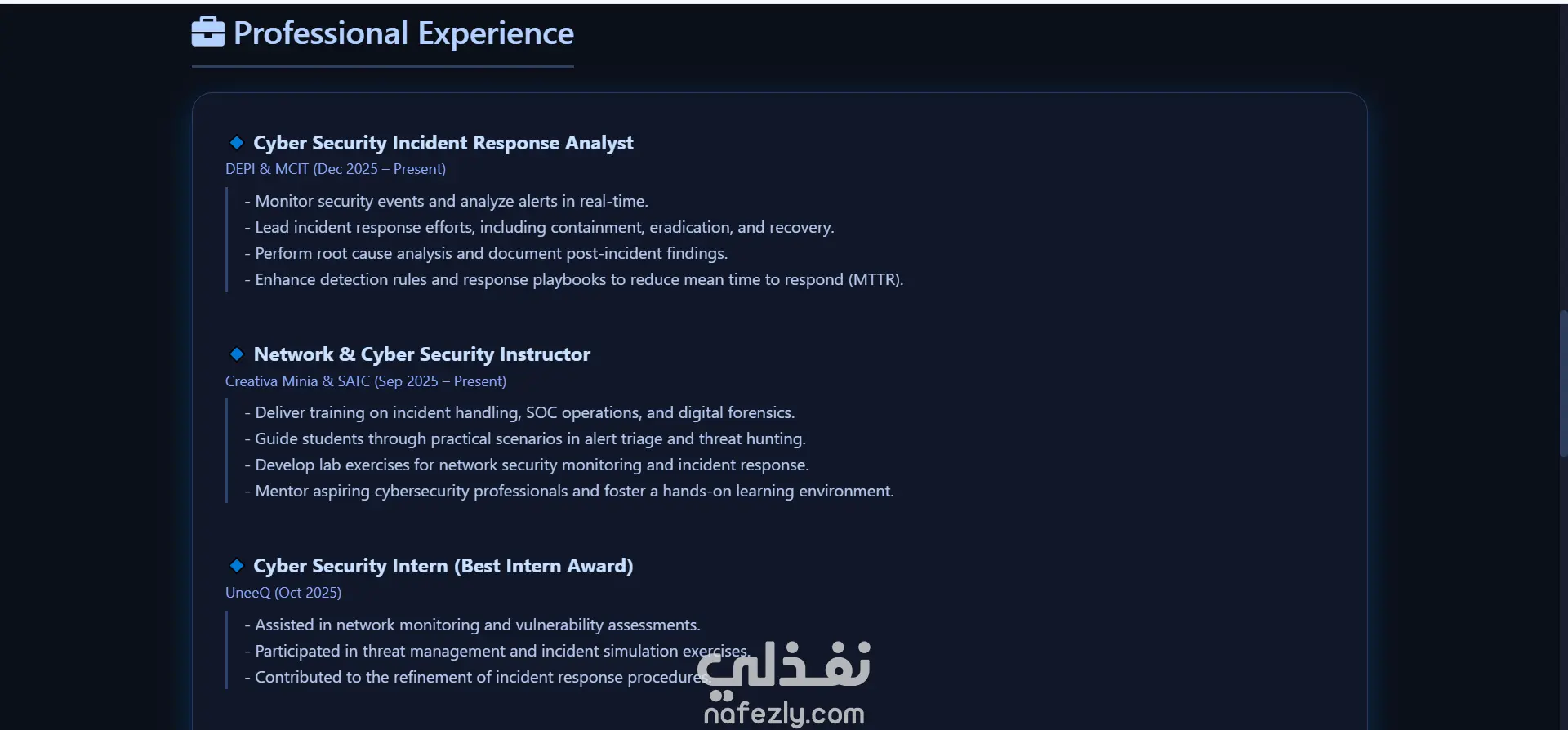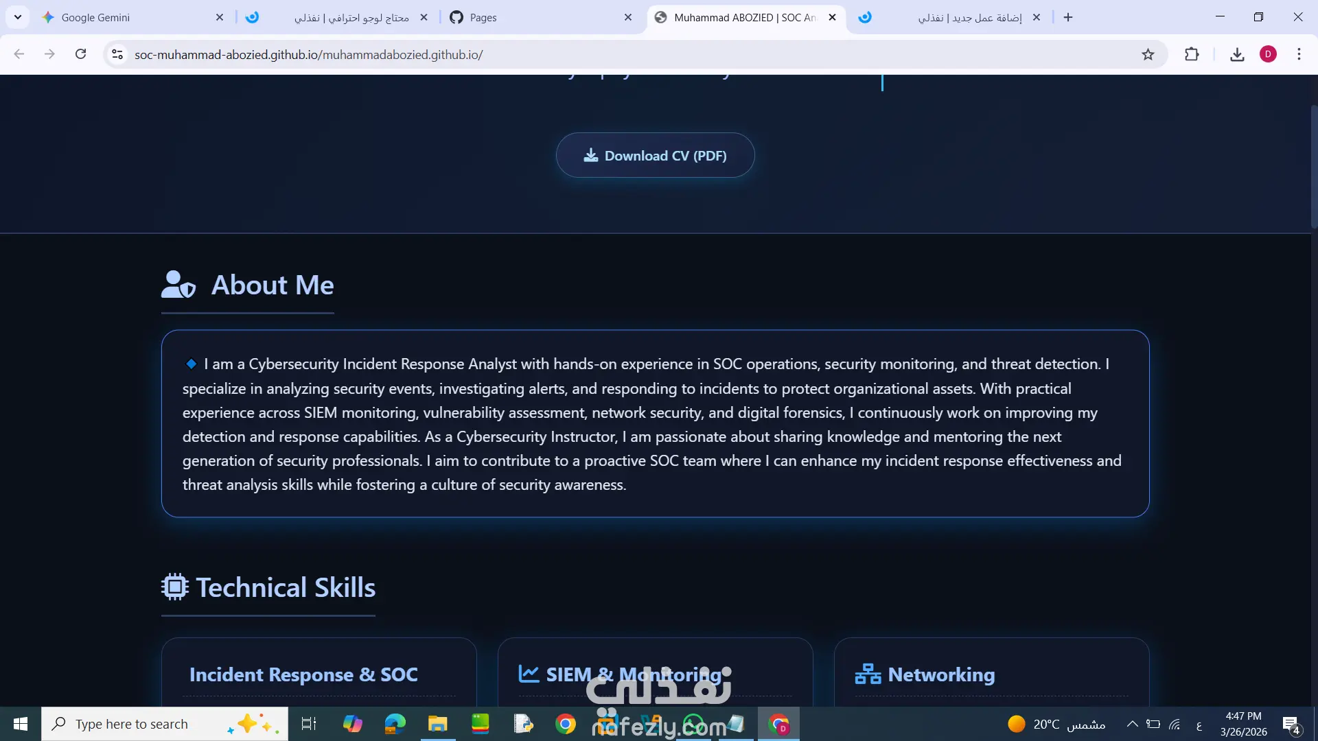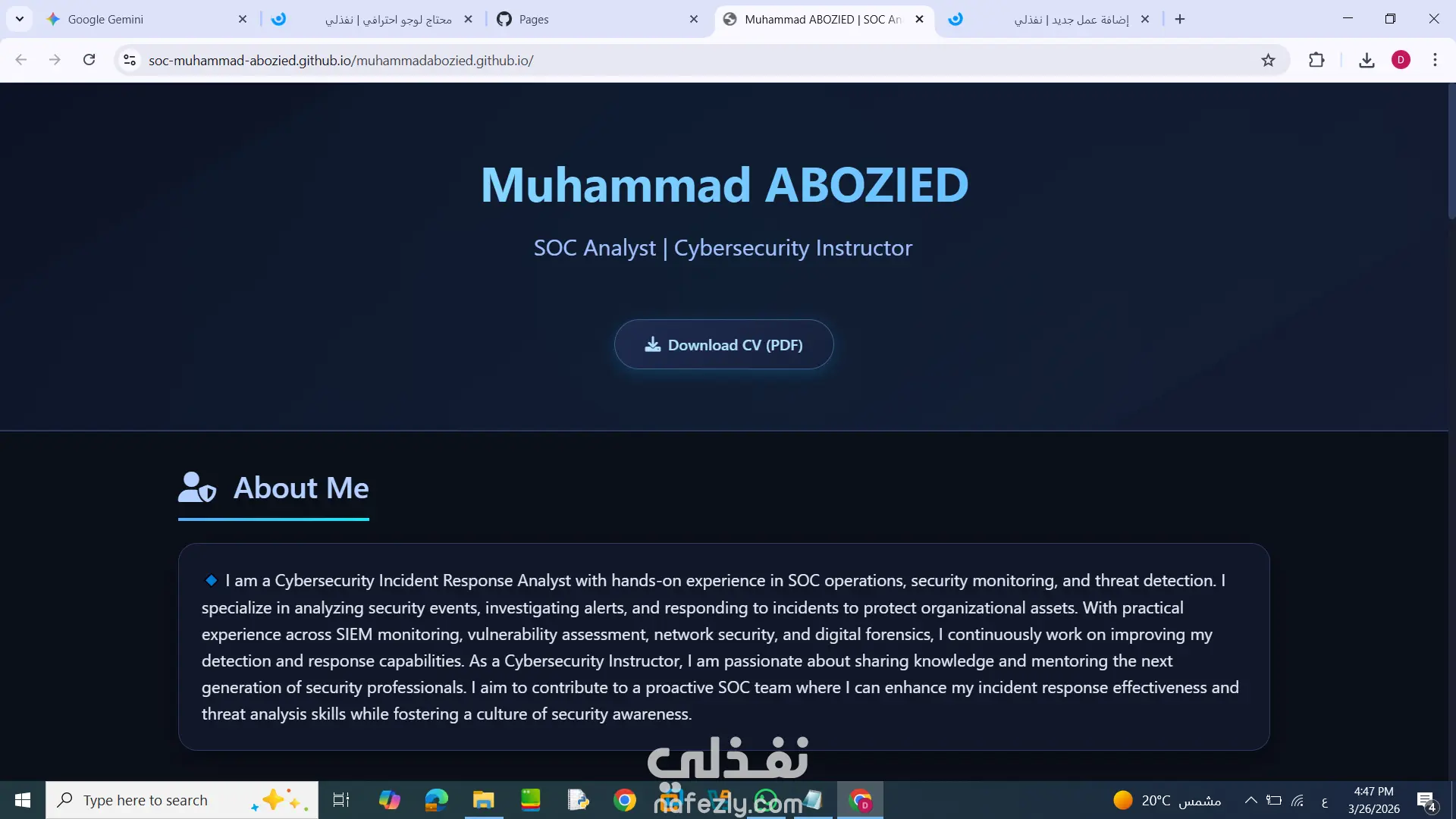 مشروع بناء البورتفوليو الشخصي لم يكن مجرد عرض للمهارات، بل كان تحدياً لتصميم واجهة مستخدم (UI) تعبر عن الاحترافية وتوفر تجربة مستخدم (UX) سلسة وسريعة. الهدف هو خلق انطباع أولي قوي يجمع بين الحداثة التقنية وسهولة الوصول للمعلومات. المراحل التي تمت خلال المشروع: بناء المفهوم البصري (Conceptualization): تم اعتماد أسلوب "Glassmorphism" (التصميم الزجاجي) والدرجات العميقة من اللون الأزرق (Deep Navy) لتعزيز الثقة، مع اللون الفسفوري (Neon Cyan) لإعطاء شعور الحداثة والتكنولوجيا الرقمية. التصميم التجاوبي (Responsive Design): تم تصميم الواجهة لتكون متجاوبة تماماً (Fully Responsive) مع كافة أحجام الشاشات (Desktop, Tablet, Mobile) لضمان تجربة مستخدم موحدة. التفاعل والحركة (Micro-Interactions): إضافة تأثيرات حركية (Animations) سلسة عند التمرير (Scroll Reveal) وتفاعلات بسيطة عند الوقوف على العناصر (Hover Effects) لإضفاء الحيوية على الموقع. تحسين الأداء الأداء وسرعة التحميل (Performance Optimization): الاعتماد على الأكواد النظيفة والمتوافقة مع معايير الويب لضمان سرعة تحميل عالية جداً، مما يسهم في تحسين تجربة المستخدم. النتائج النهائية: بورتفوليو شخصي فريد يسهل تذكره. تجربة مستخدم موحدة وسلسة على كافة الأجهزة. تصميم واجهة مستخدم (UI) متناسقة مع ألوان البراند.